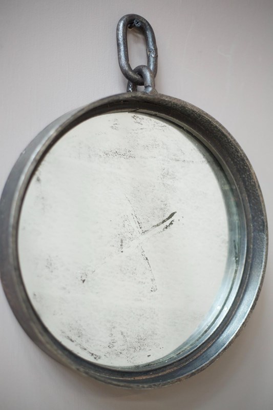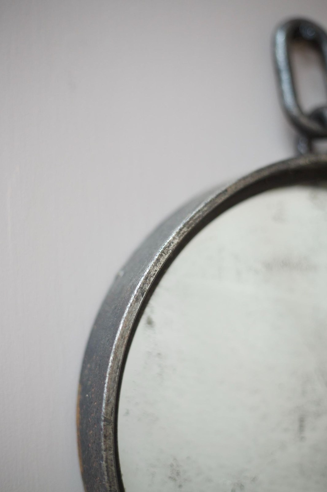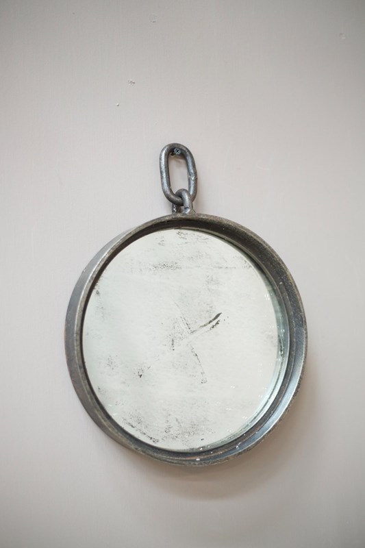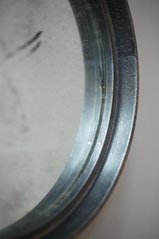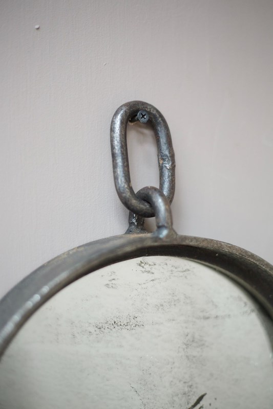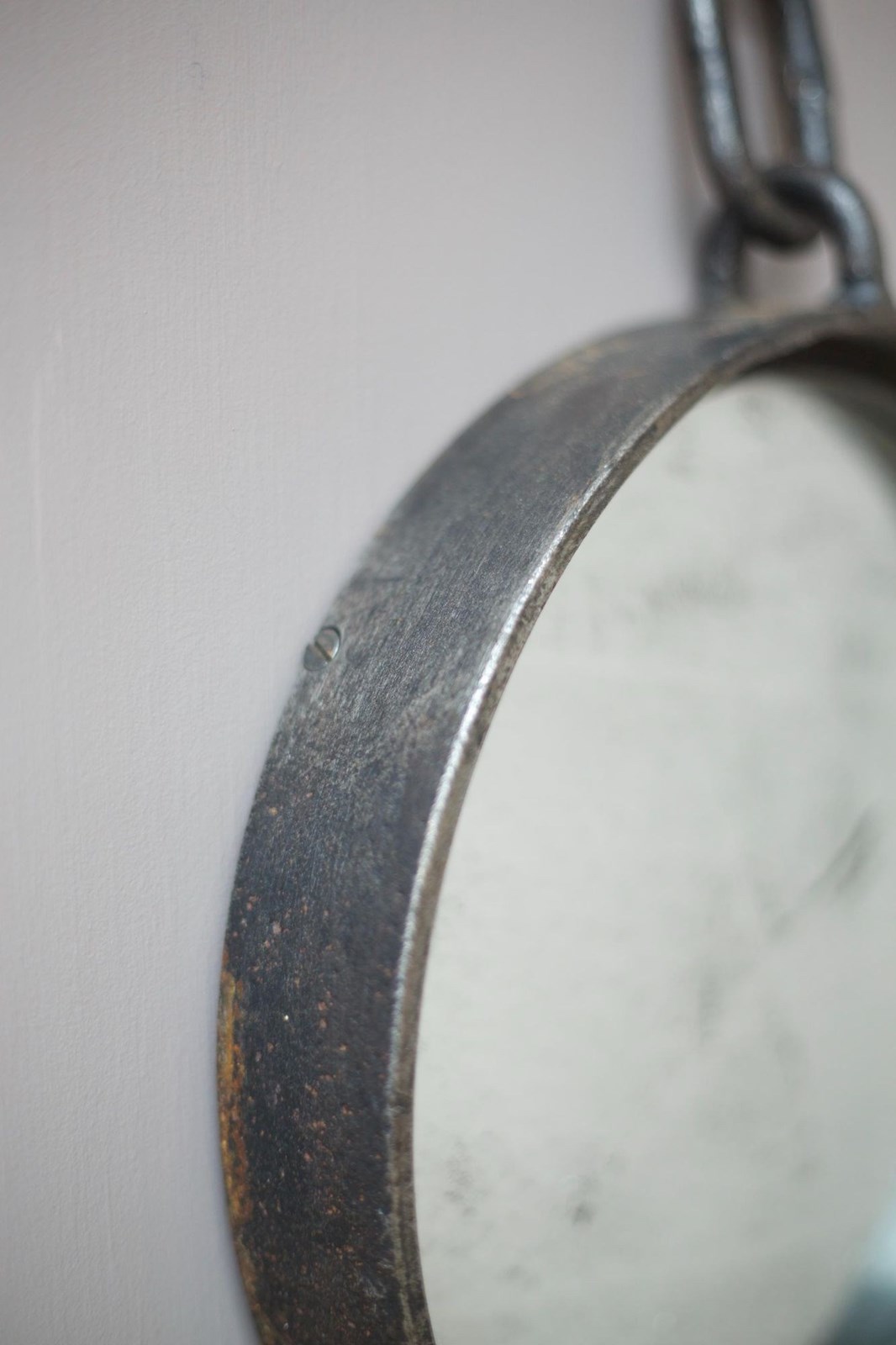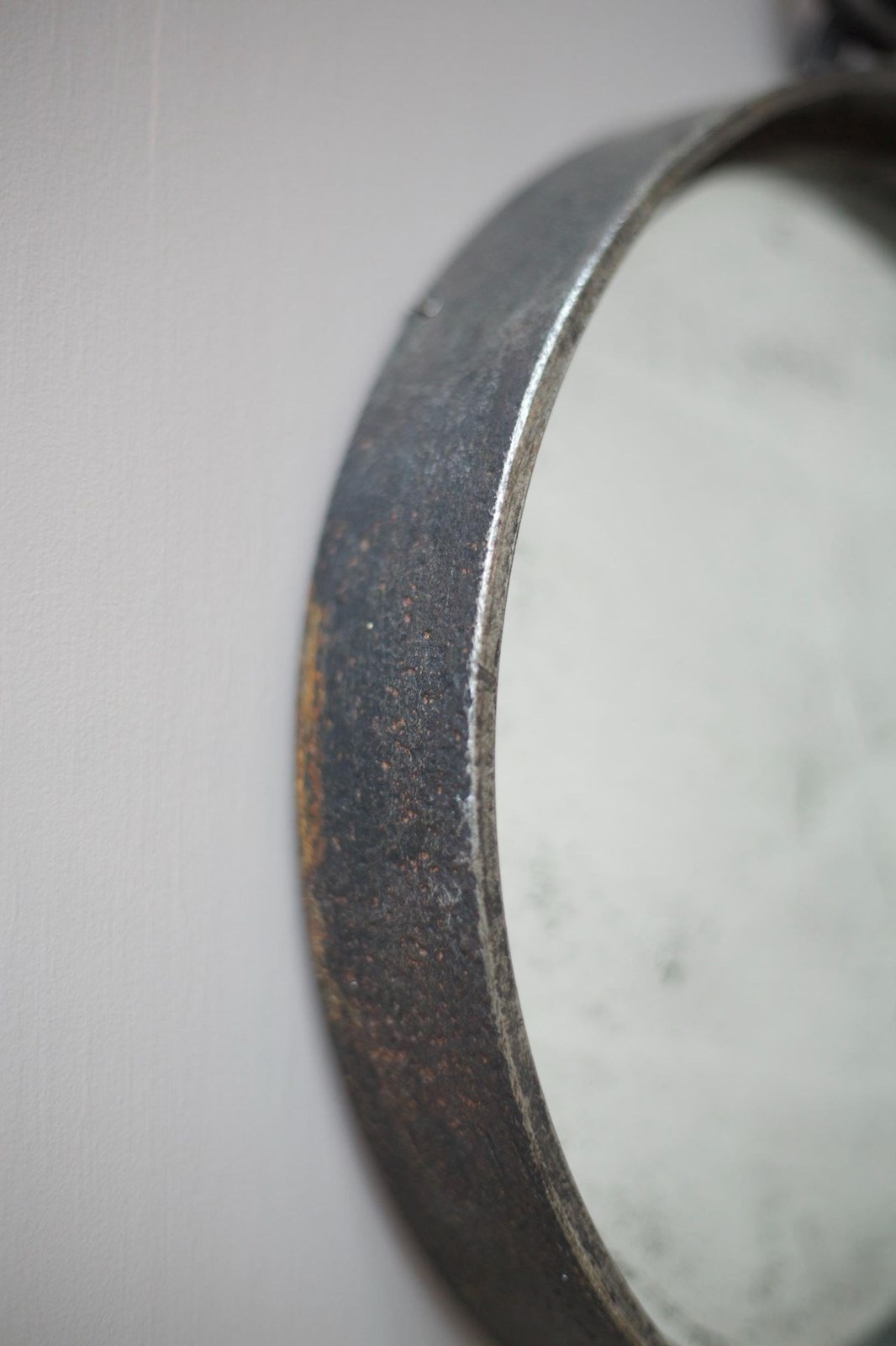 This is a very attractive and nice quality mid century Italian wall mirror. Circular in shape with an inductrial style hanging ring and screrwed steel frame with wonderful patina. The back of the mirror is leather covered so overall a very high quality piece. The mirror plate has heavy foxing which suits the piece very well. Overall condition is superb and makes a great decorative piece.