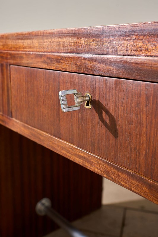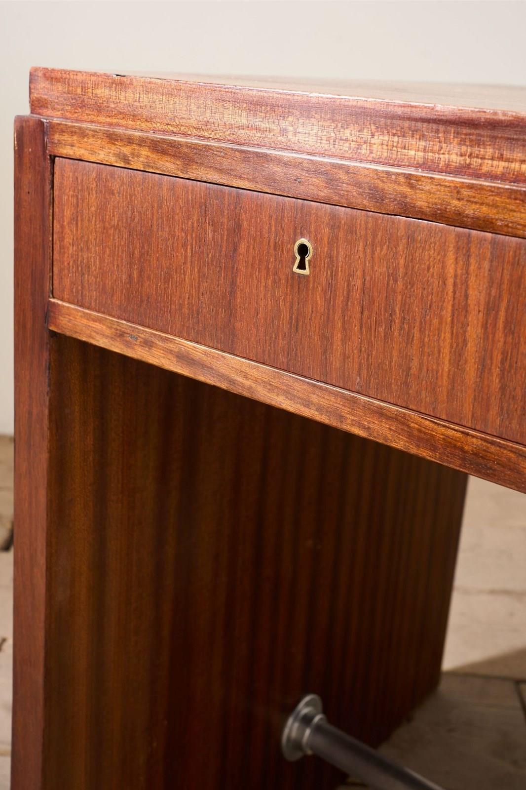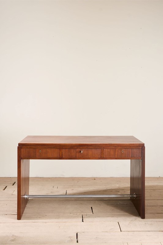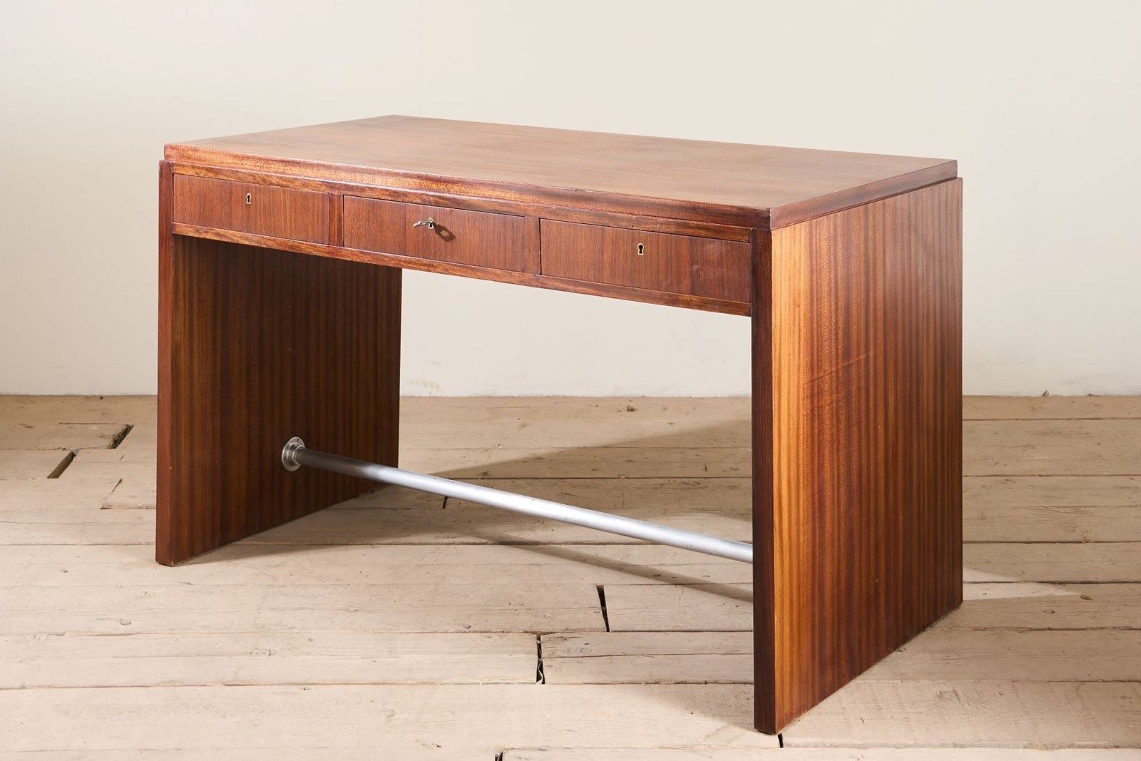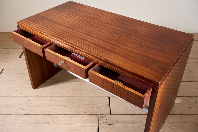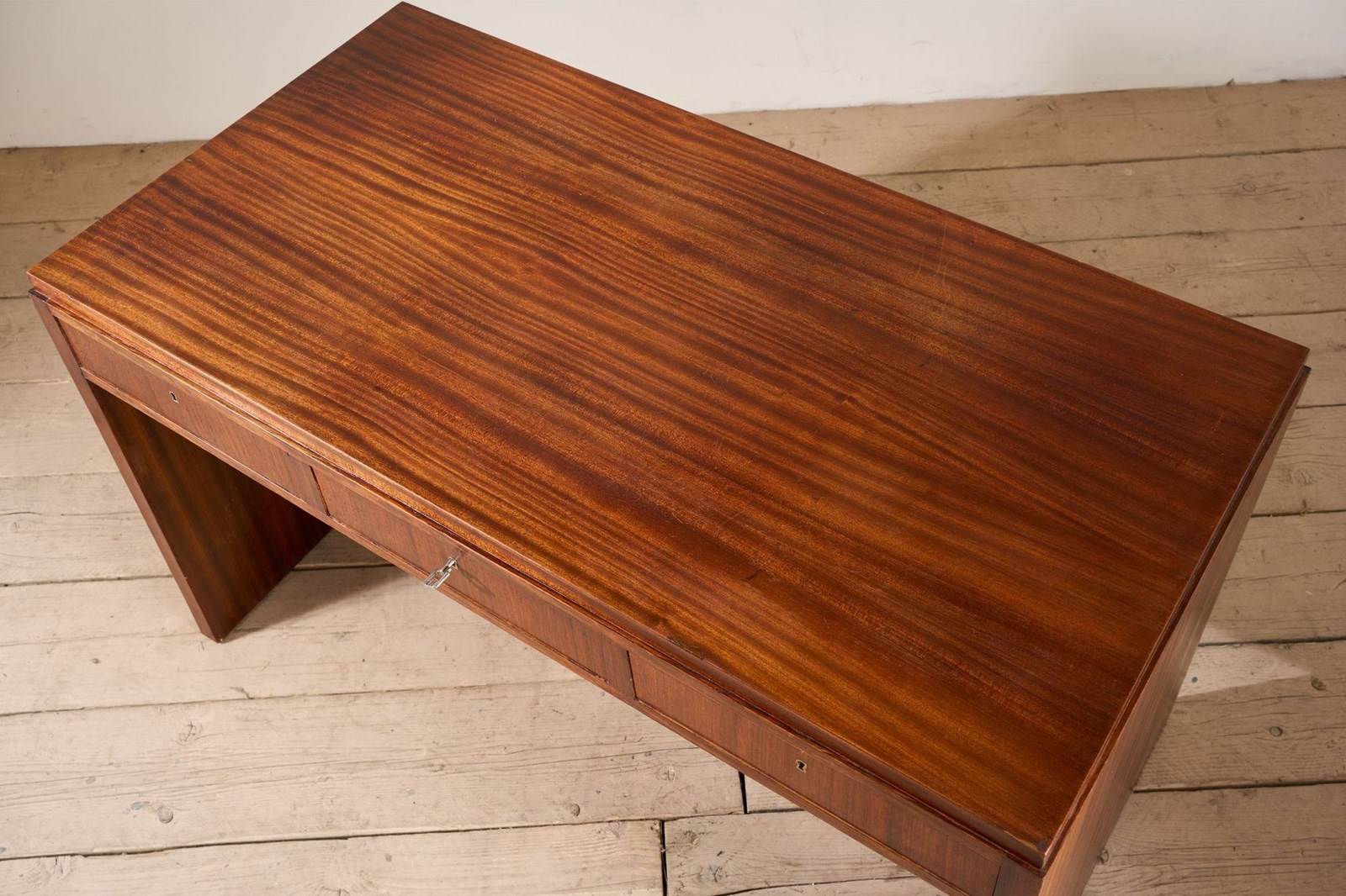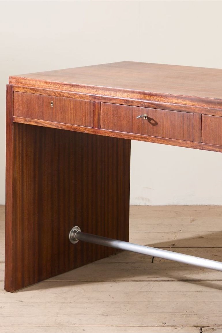 This is a neat designed mid 20th century teak desk. The colour is fabulous and the simplicity of the design is hugely attractive. The size is very practical for one or more screens with good depth to the desk. I love the look as it really is very elegant and has a few small details that stand this apart. The slightly stepped top is one, the steel foot rest another and the way the grain flows over the whole piece really shows the quality of the piece. There are also three drawers all lockable and close flush. Overall a neat classic design mid century desk that offers a lot of practicality while looking good.