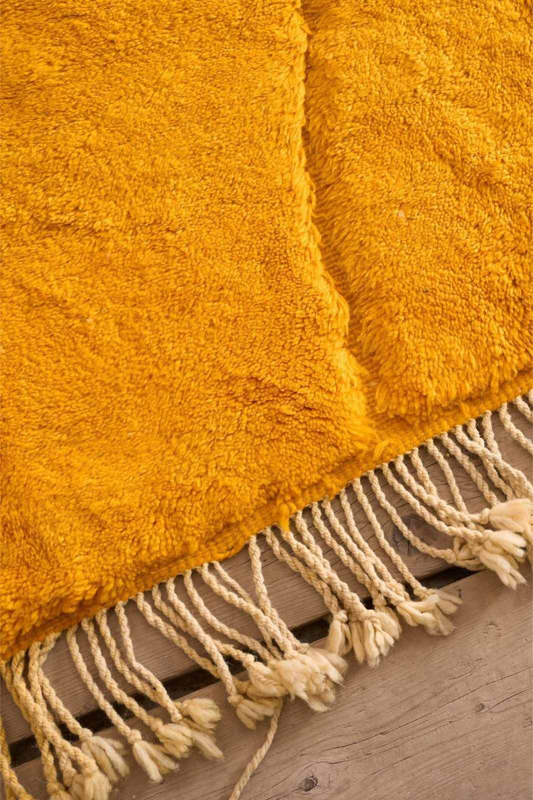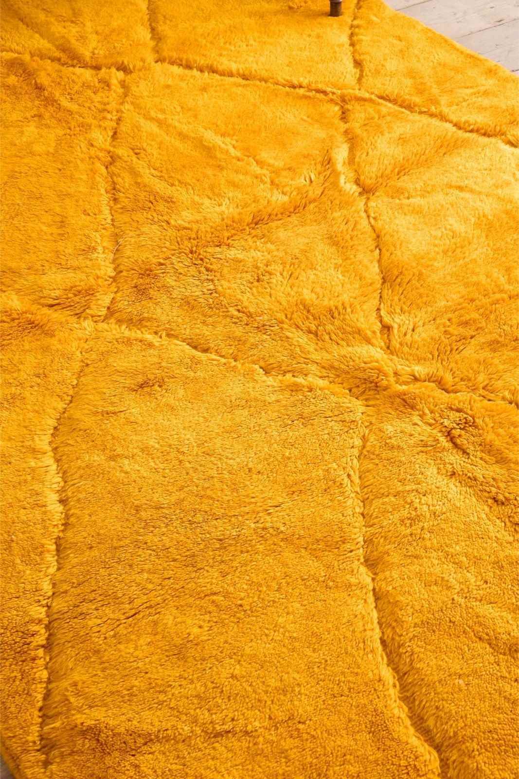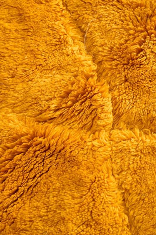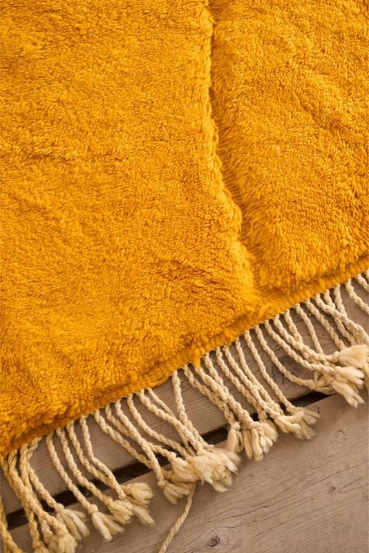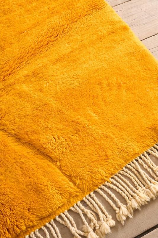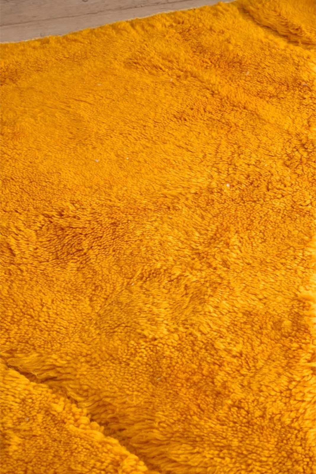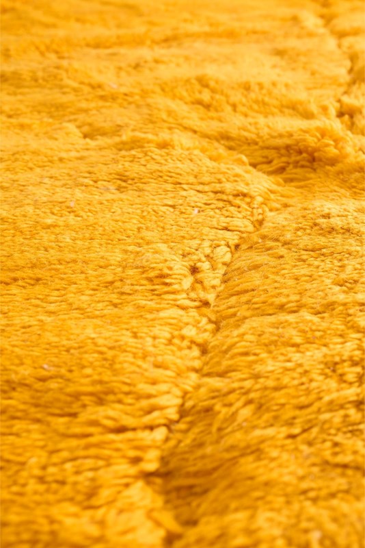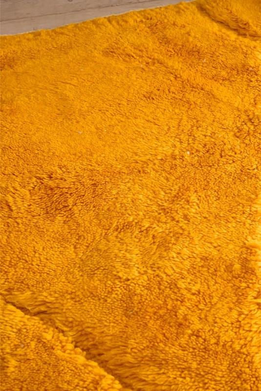 This example is a striking bold yellow thick wool berber rug with a wonderful almost ombre to the colour which gives it an added detail as well as the geometric lines running through it.