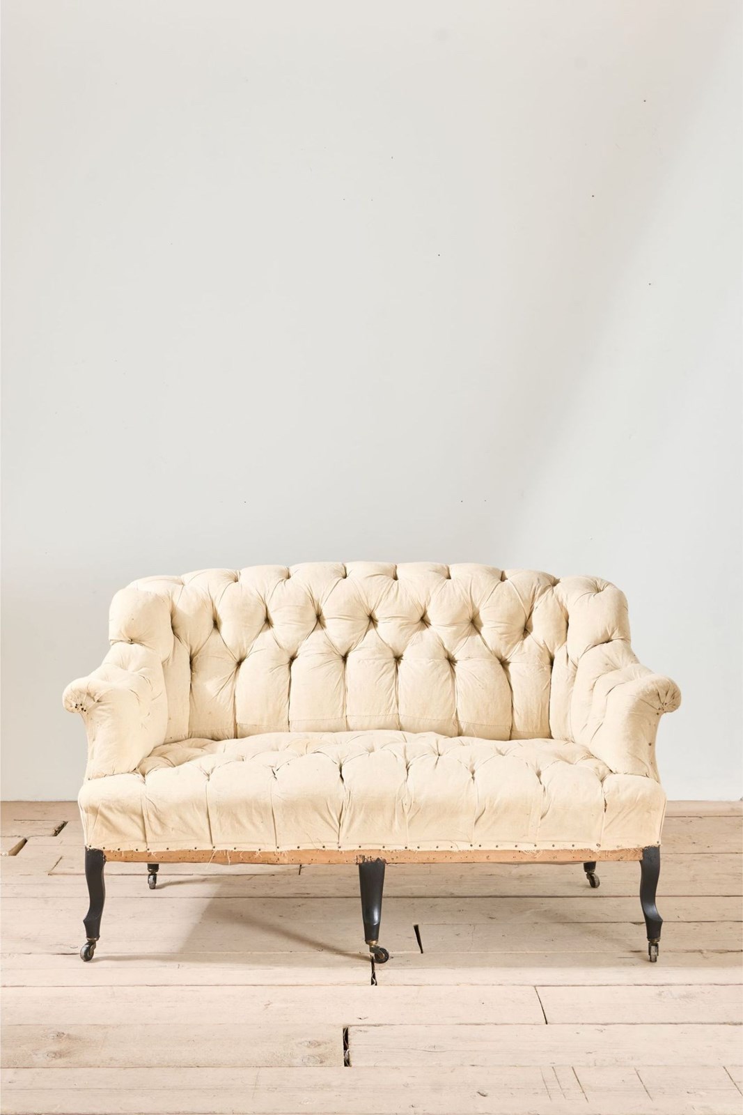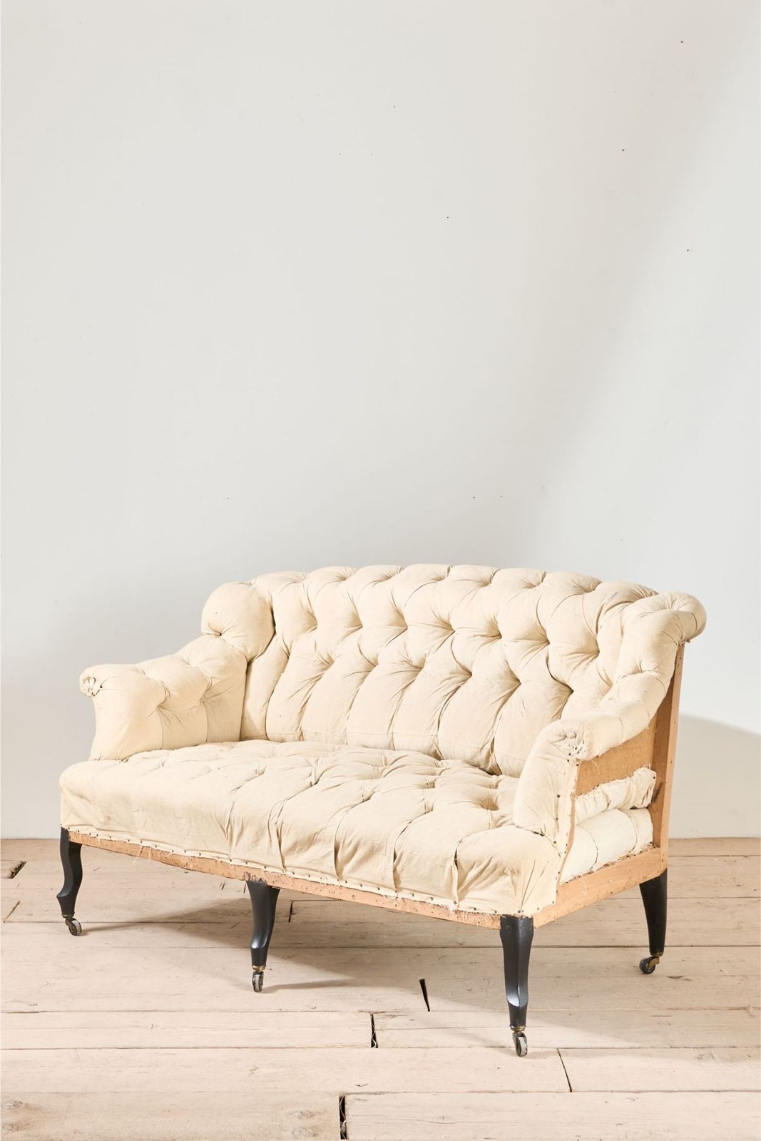 This is a very elegant Napoleon III buttoned back and seat sofa. Standing on tall elegant cabriole legs. Great shape from all sides and comfy to use. Ideal occasional sofa or smaller sized sofa for a tricky spot in your home.