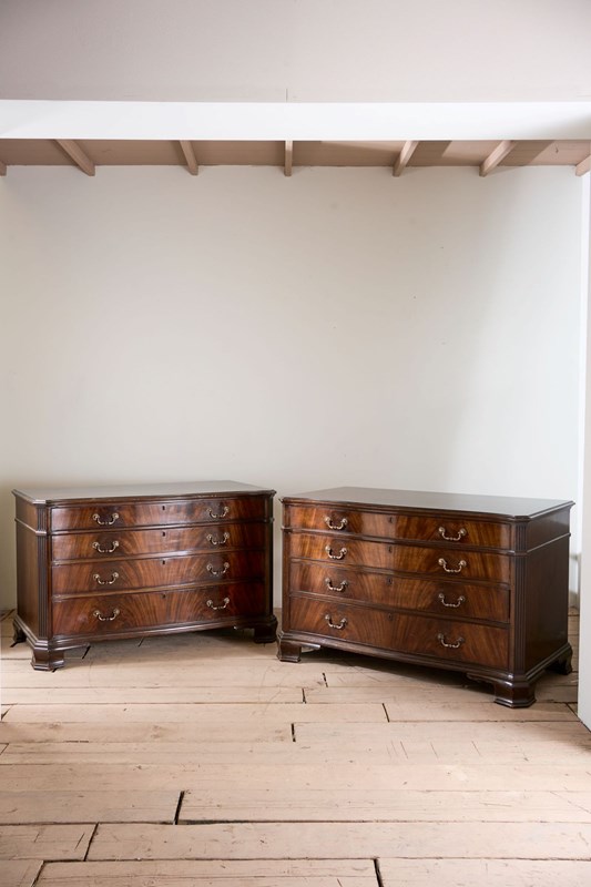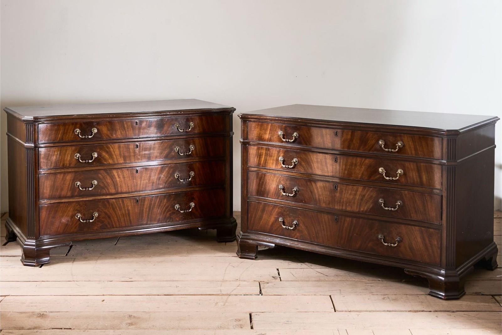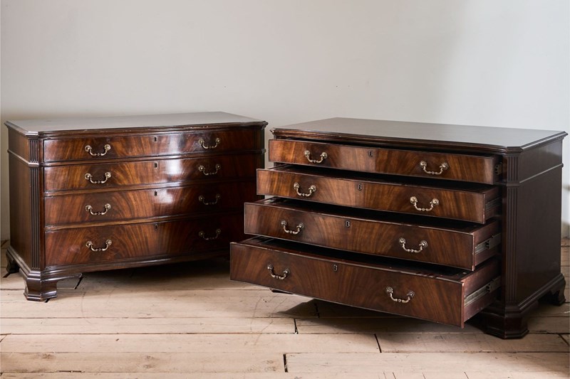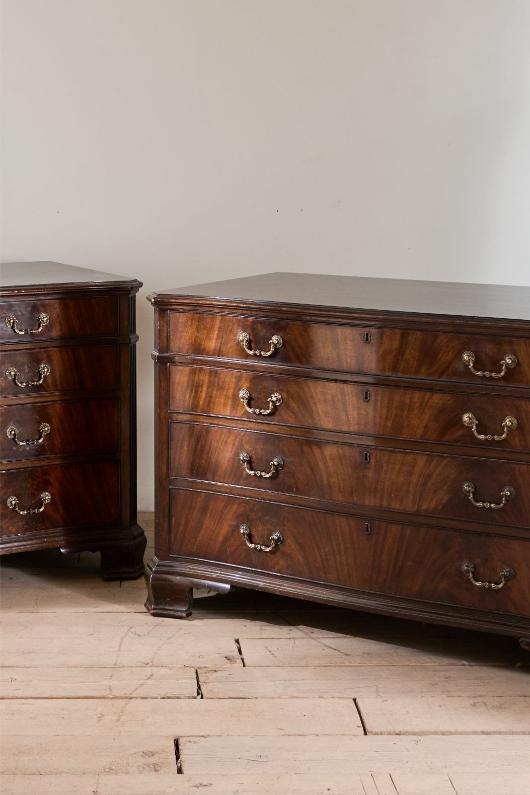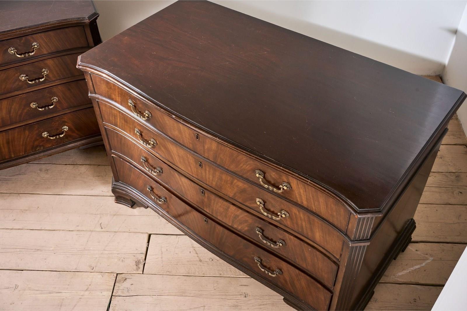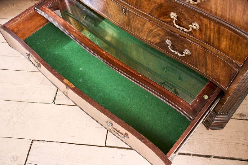 These are an exceptional quality pair of chests that were found in a silversmiths from Birmingham. The pair are made from mahogany and are serpentine fronted. Extremely high quality and decorative. But what makes these that bit more special is that each drawer has a glazed top that slides back to gain access. These would have originally been used to show the products made by the silversmith, be it jewellery or cutlery. I have not seen anything quite like these before.