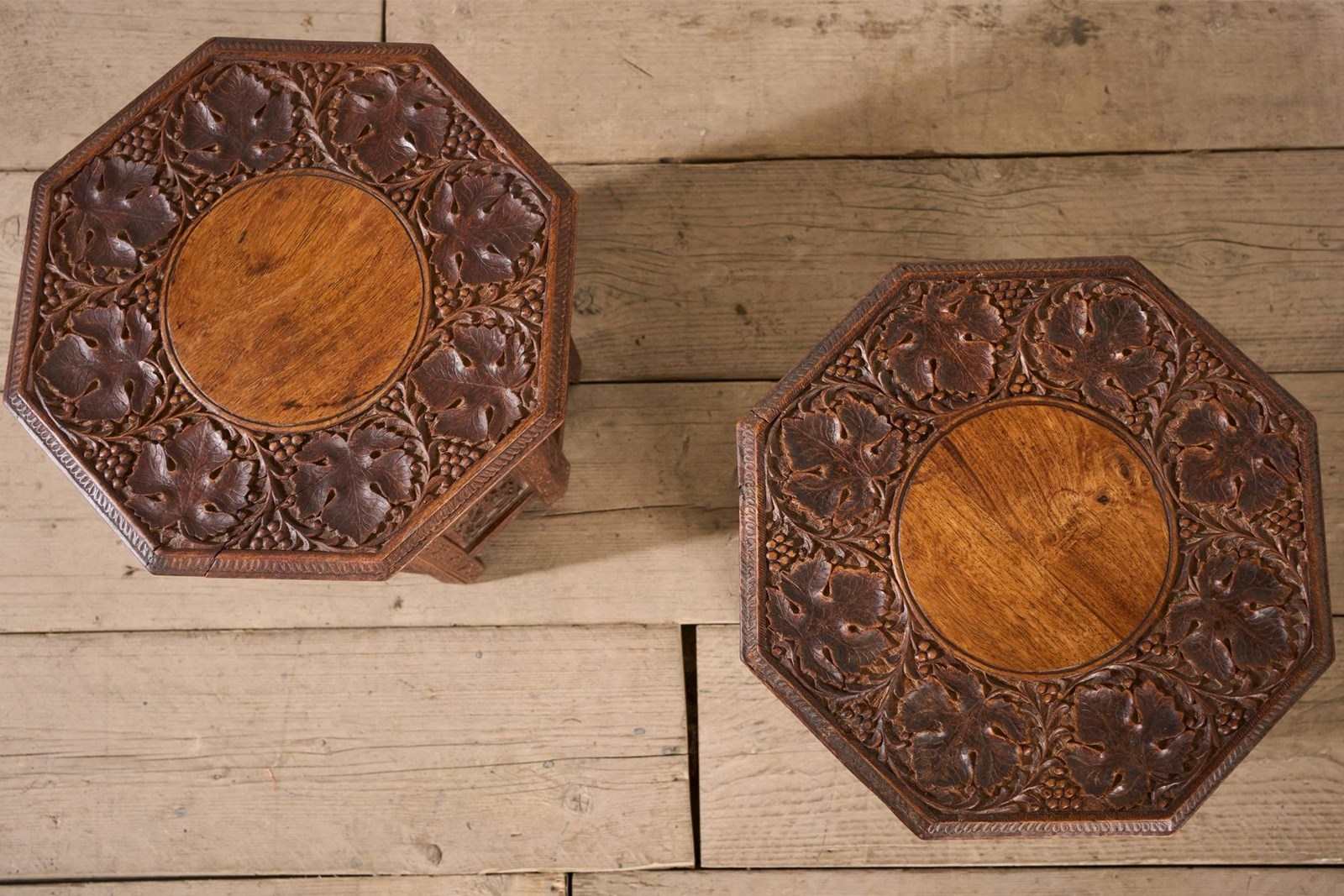 These are a lovely quality pair of totally original 19th century Anglo Indian side tables. Made from Padauk and have a great weight to them. The finely carved tops really stand out and there are no major losses or damages. Rare to find a pair as well.