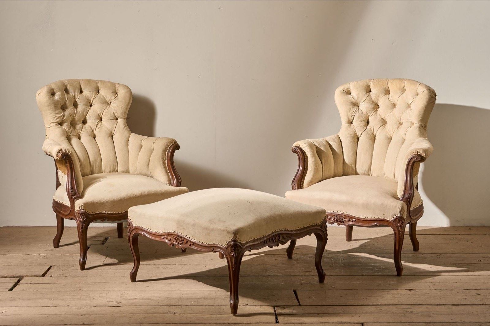 This is a particularly nice set of 19th Century French armchairs with matching waisted stool. The chairs are deep buttoned and have a thick frame give them a beautiful shape, the carved frame on this set are also particularly nice. For me the line detail on the back legs of the chairs shows the quality of the set.
