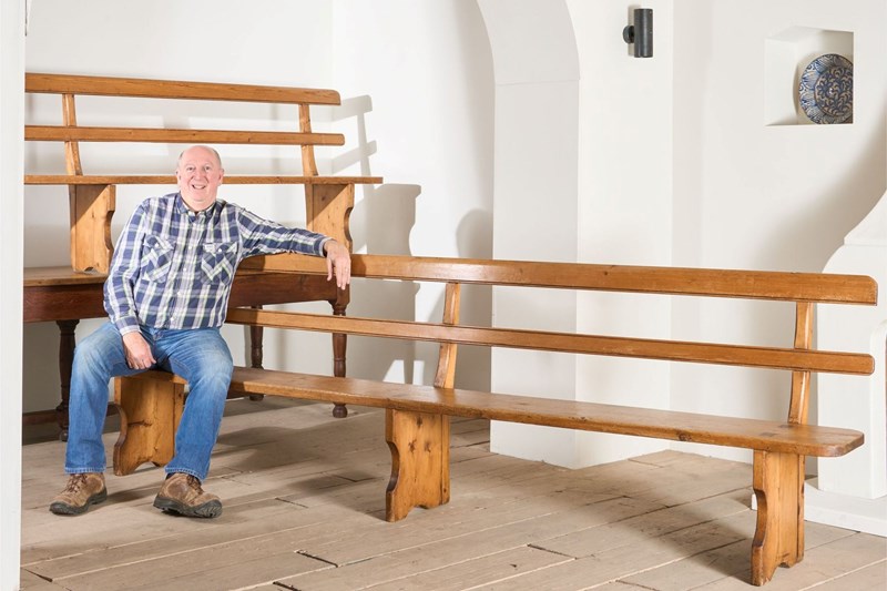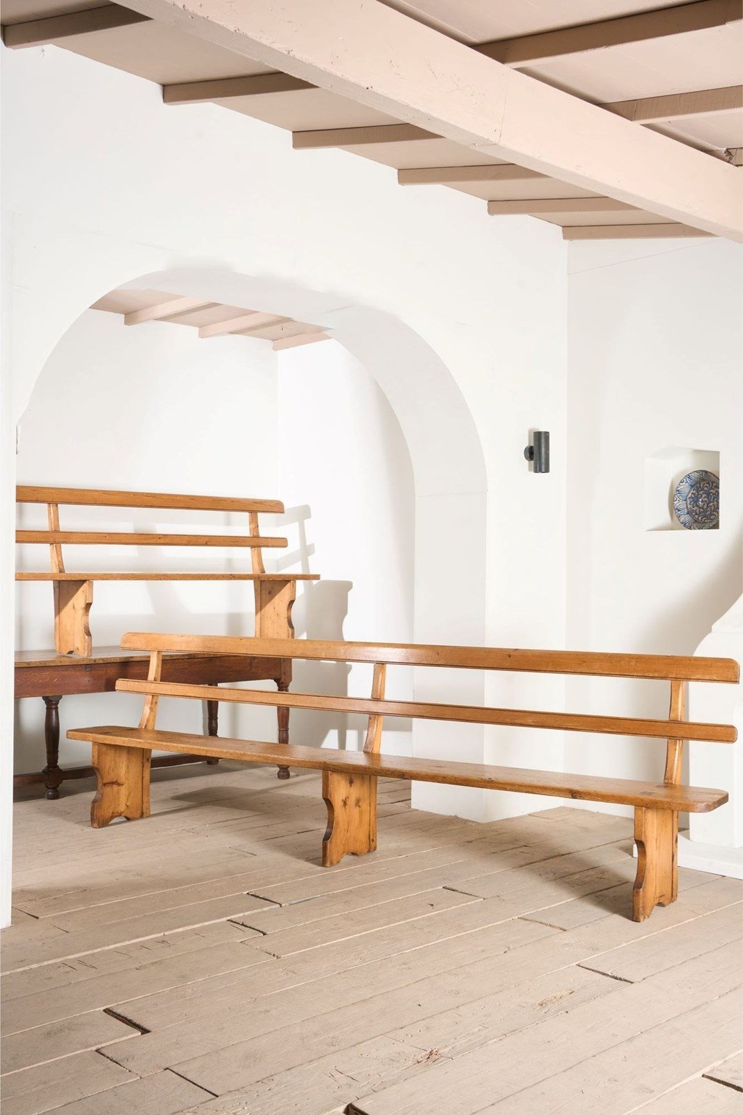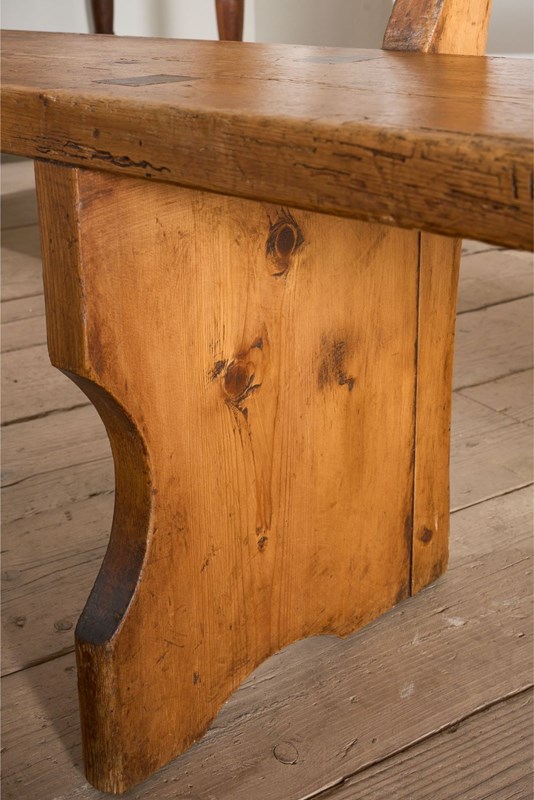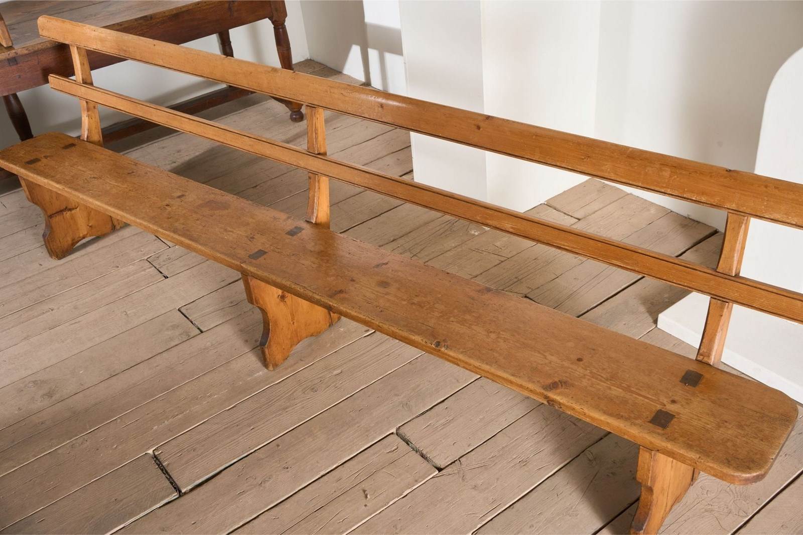 These are a great pair of 19th century Pine dining benches. The length is ideal to sit 6 people per bench and the overall condition is very good. The pine has taken on a superb patina from years of use and is a deep honey colour which makes these very attractive. The overall design is very simple with a single plank seat and slatted back but there are some attractive details that give these a real quality. There are carved lines almost appearing like strung detail along the back rails, the uprights have chamfered edges which is a lovely touch and the colour difference in the seat where the legs join is very attractive. Solid condition.