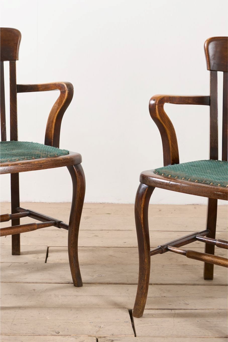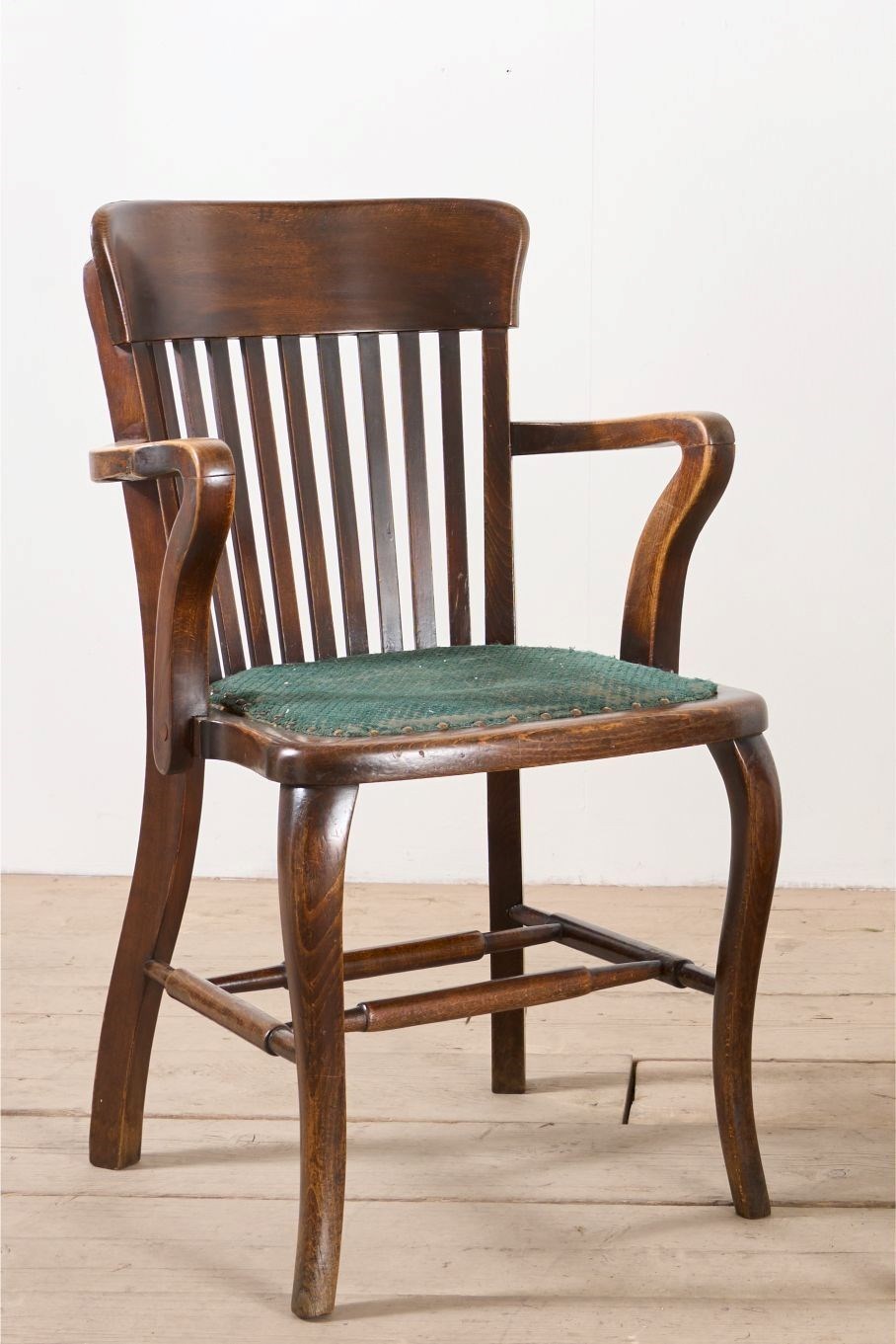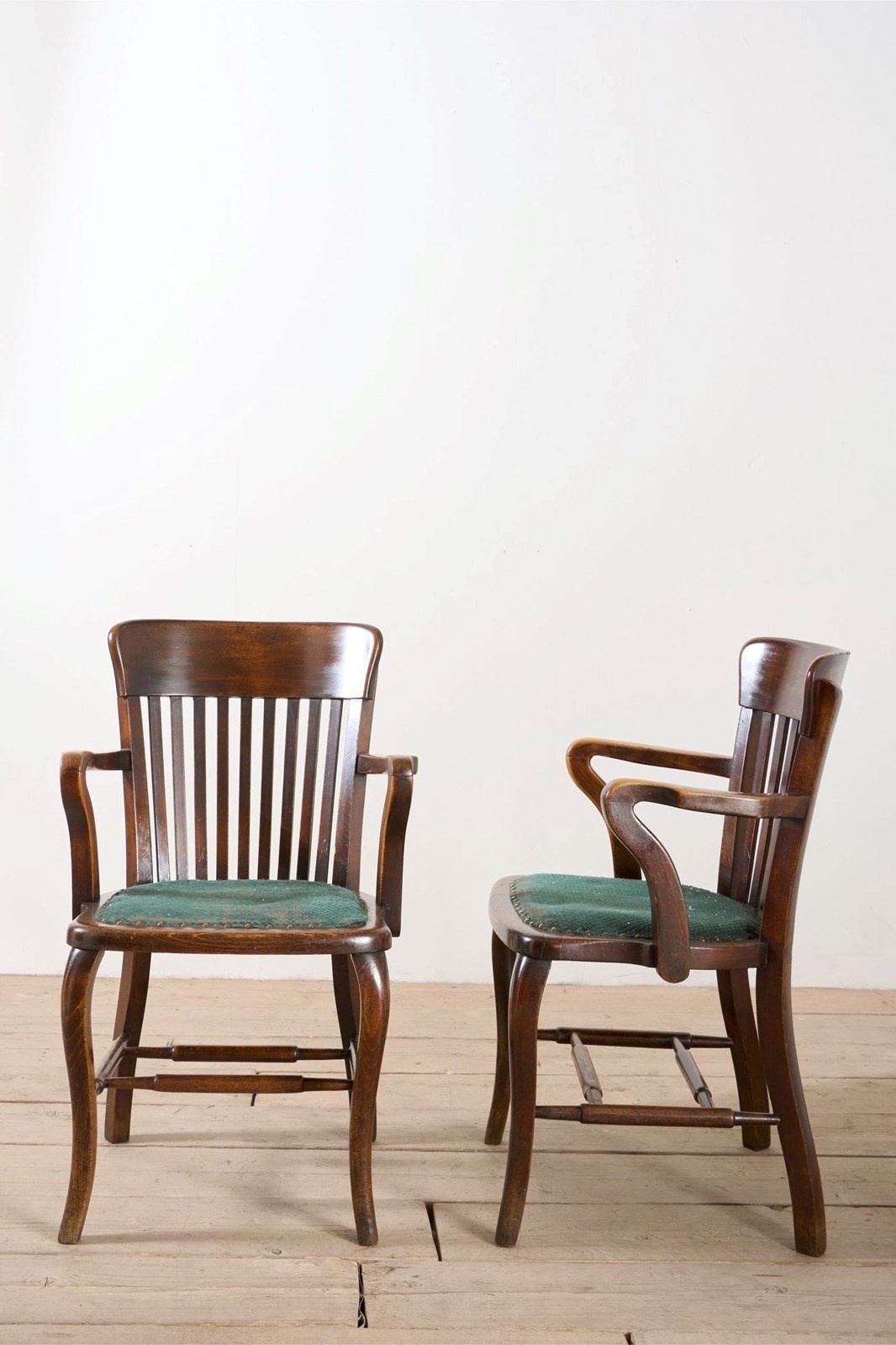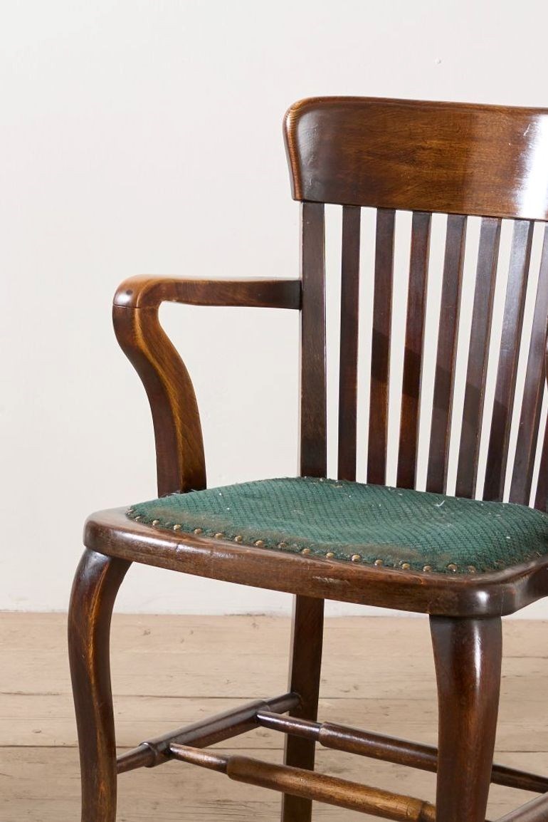 These are a great looking pair of 1920's armchair's. Ideal occasional seating or desk chairs. The fabric covered seat can be replaced but looks to be original. The condition overall is very good and the design is classic British which will sit well in a huge number of interiors. Great amount of shape to the chairs which also makes them hugely decorative.