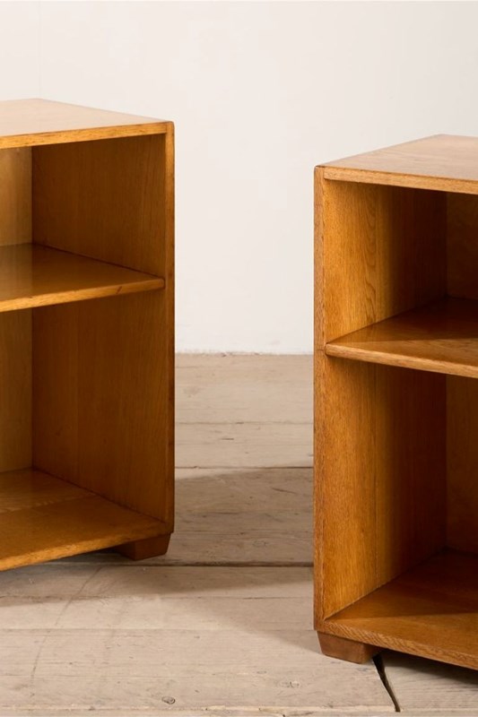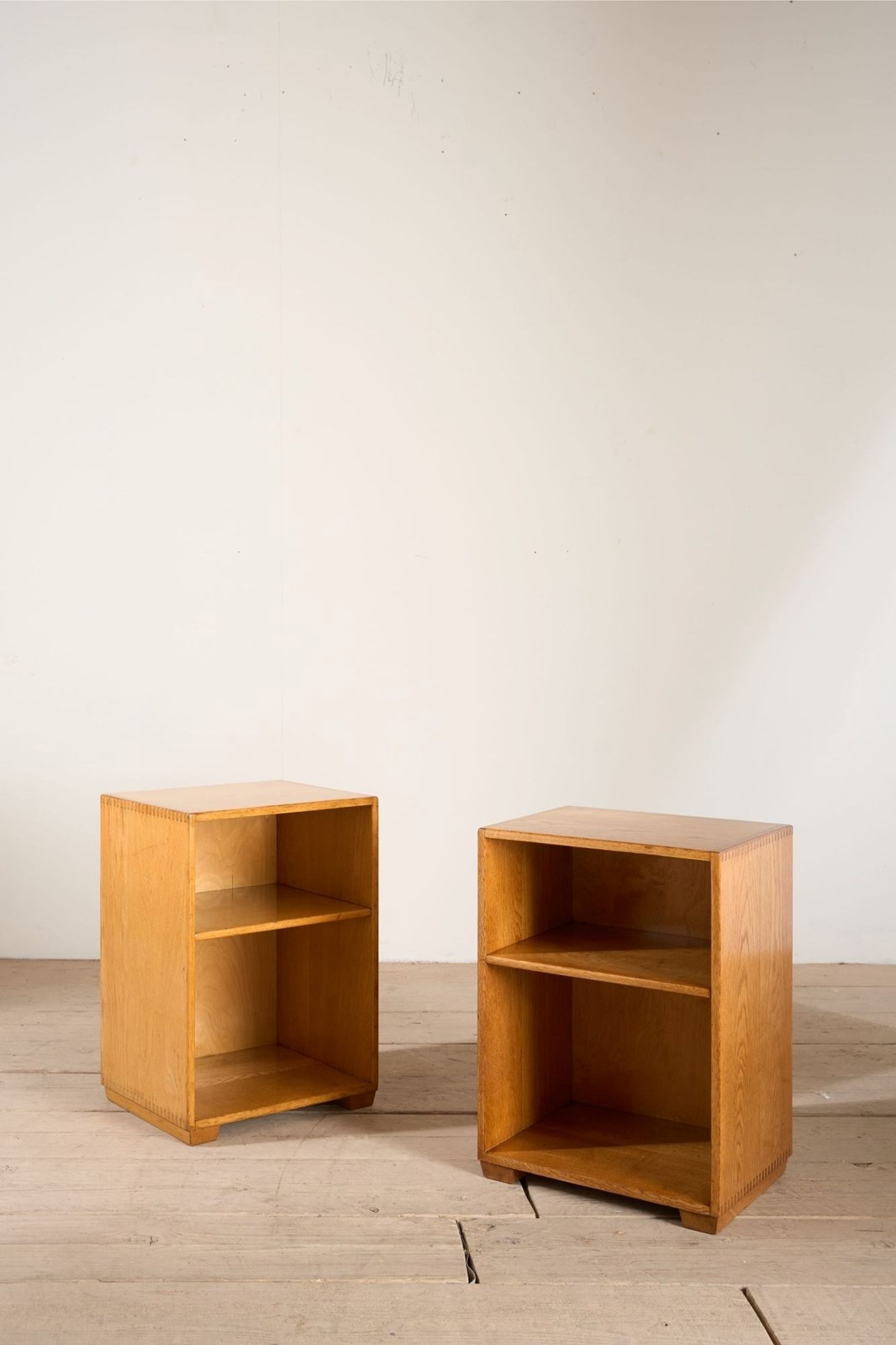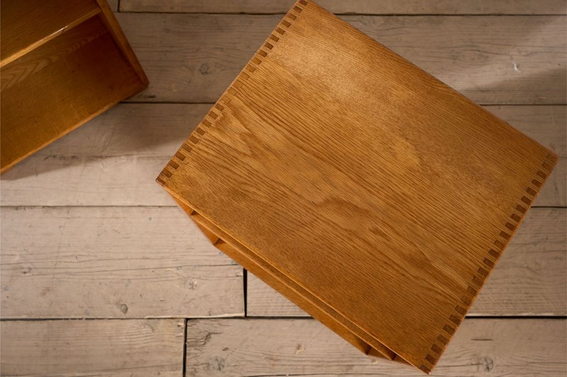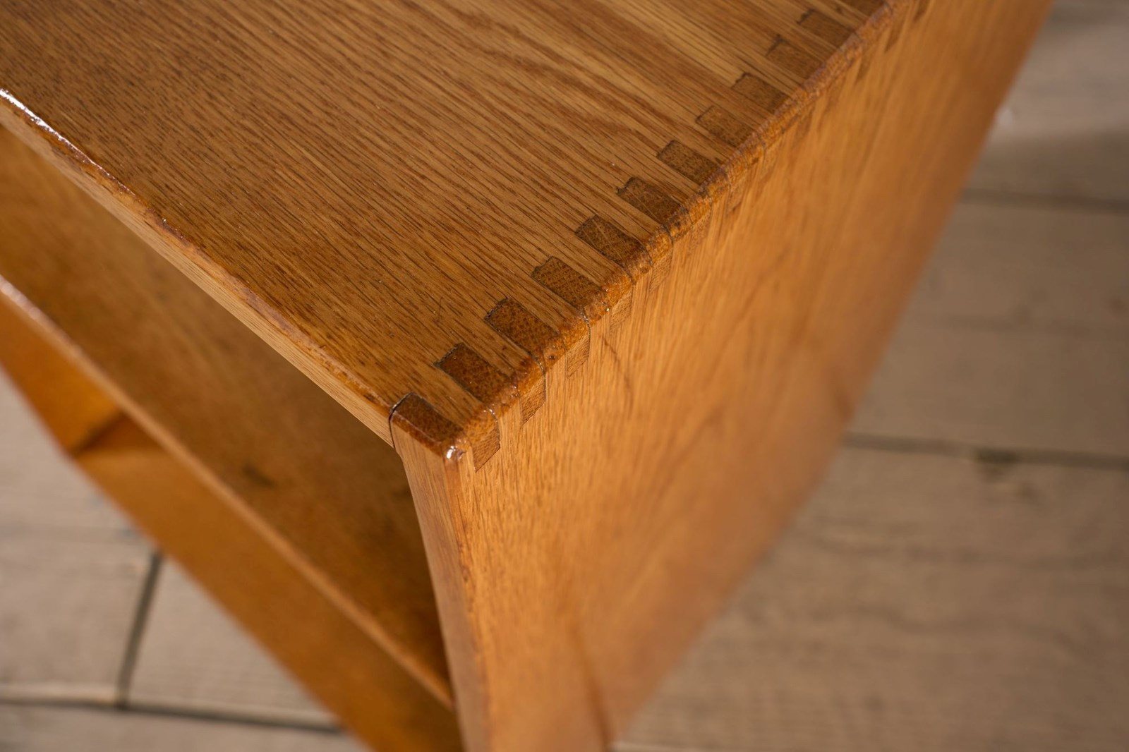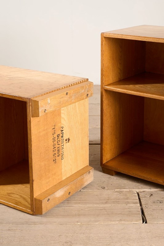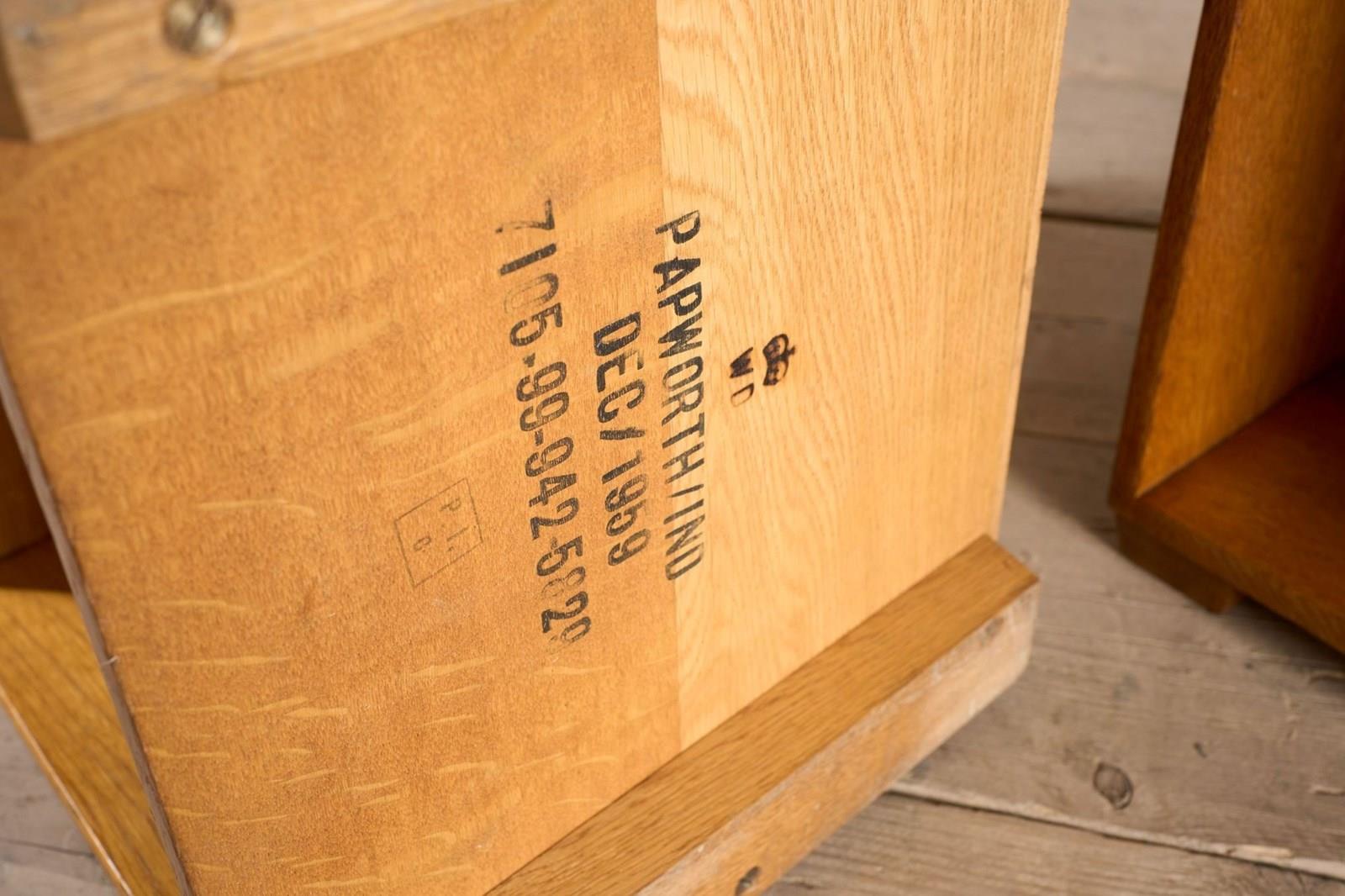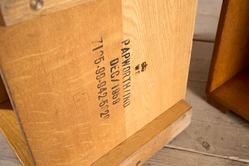 These are a great looking pair of Papworth industries war department 1959 bedside tables made from solid oak and have a striking satin finish to them. Great colour but the detail I particularly like is the dove tail joints along the sides. Overall condition is very clean with lovely age related patina. An effortlessly stylish practical design.