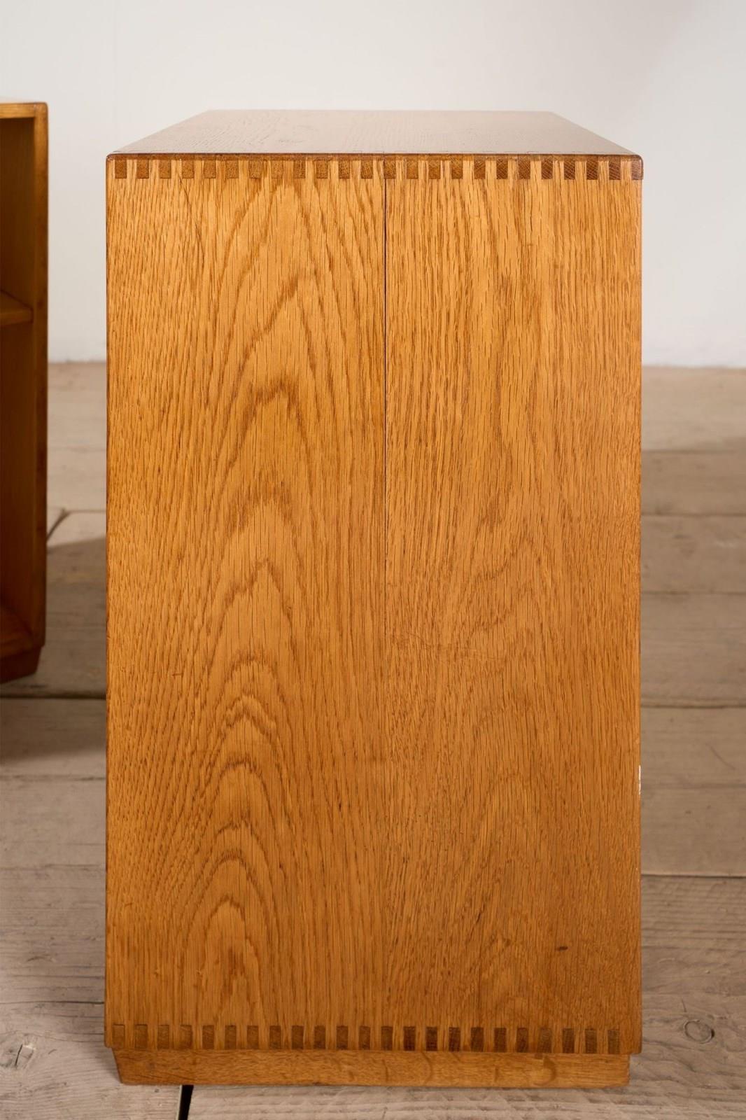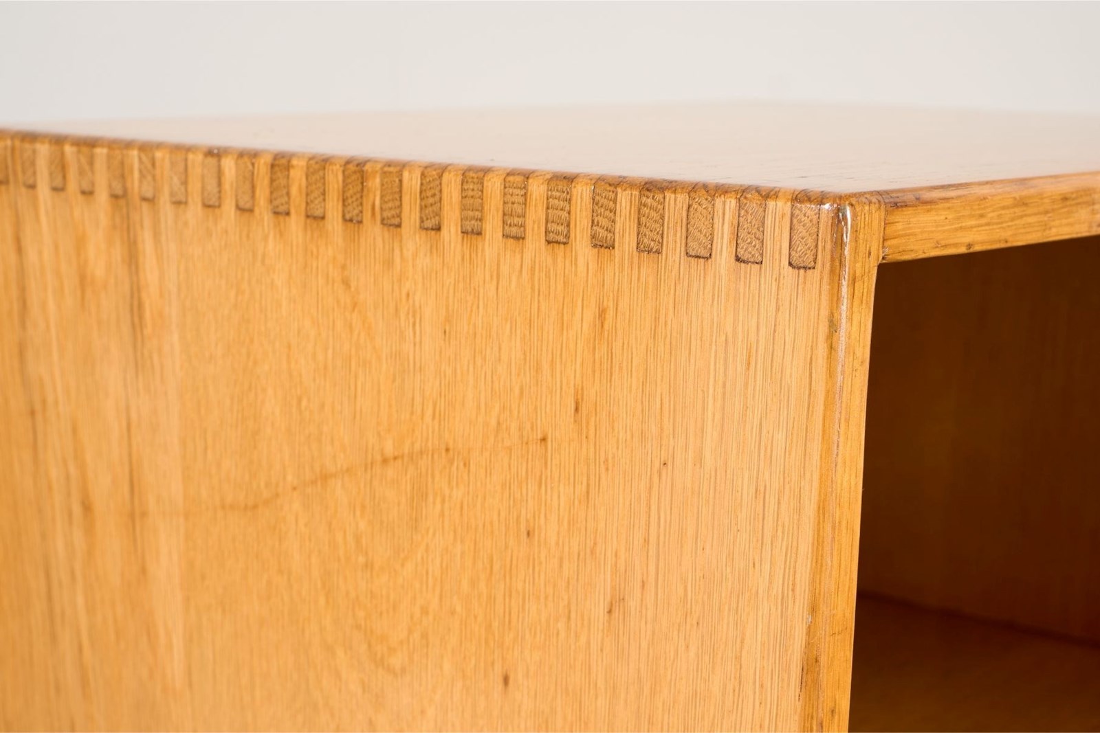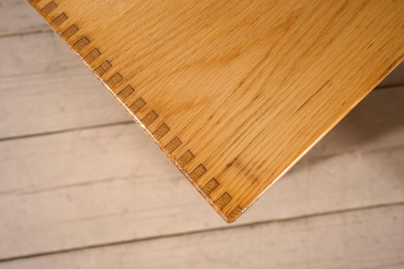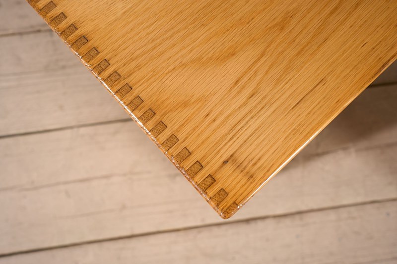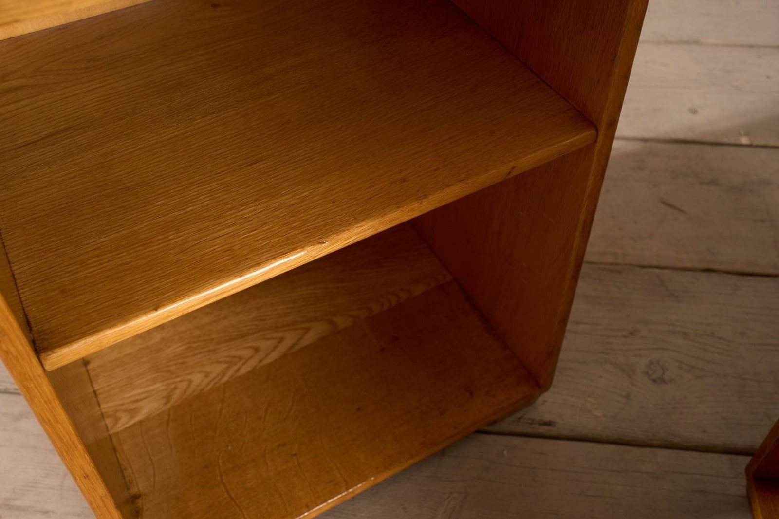 These are a great looking pair of Papworth industries war department 1959 bedside tables made from solid oak and have a striking satin finish to them. Great colour but the detail I particularly like is the dove tail joints along the sides. Overall condition is very clean with lovely age related patina. An effortlessly stylish practical design.