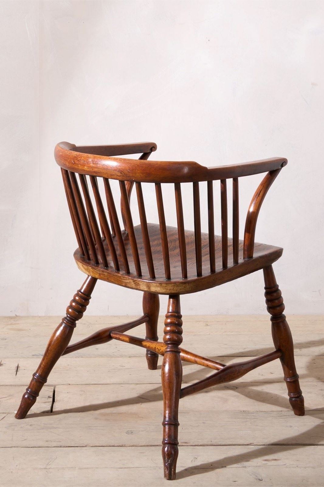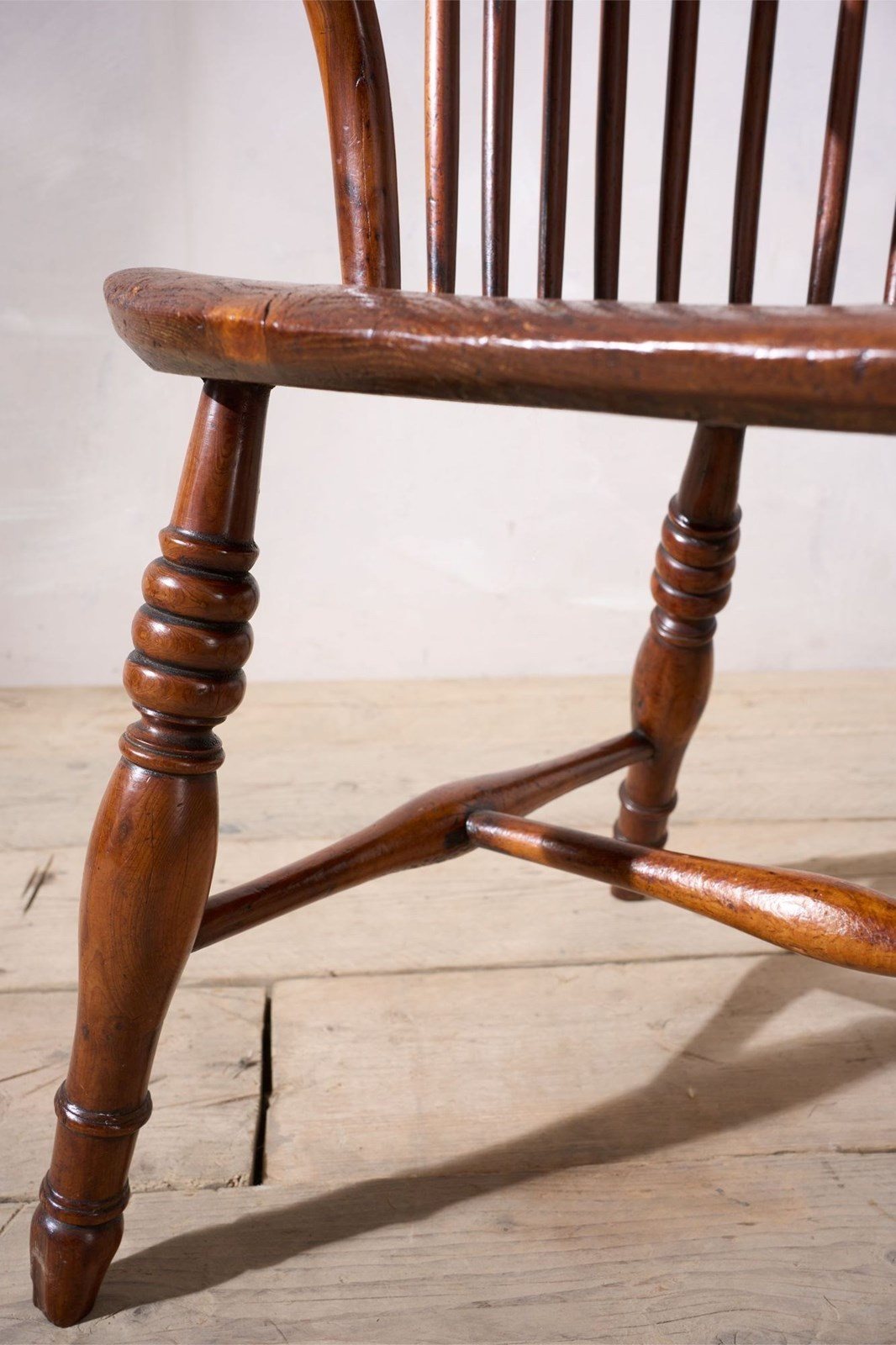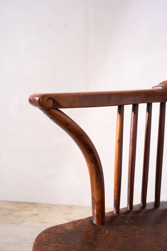 This is a particularly rare c.1800 country low back Windsor chair. This design is one I have always loved but they don't come up very often. A genuine Windsor chair that was originally designed with a low back. This model looks to be made from Ash & Elm and the colour is incredible. The originality is evident and the whole chair has a tactile feel. The low back detail as you can see is the way the chair has been designed as arms and back are all one piece of timber beautifully shaped. A classic piece of furniture that will work in a huge number of interiors.