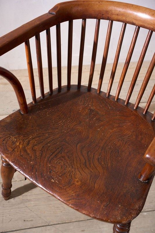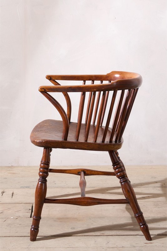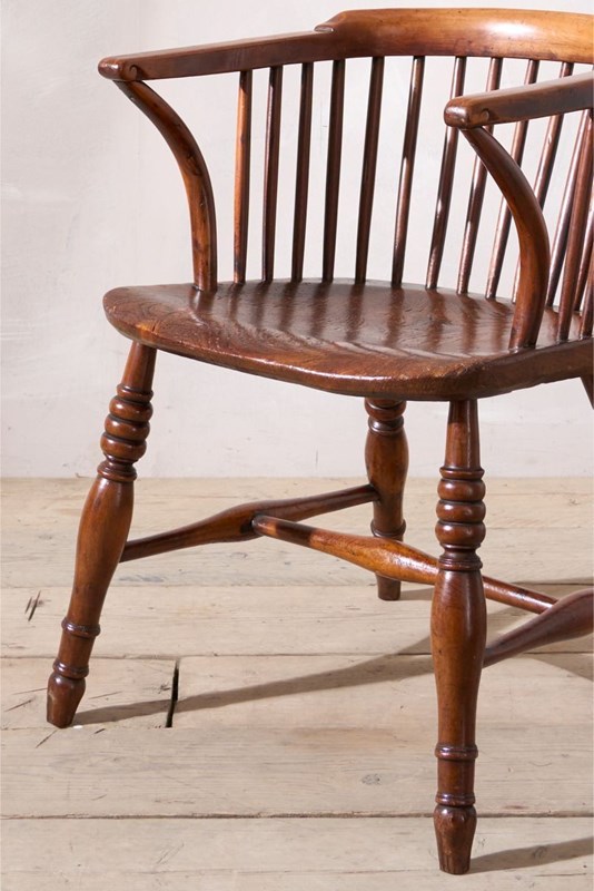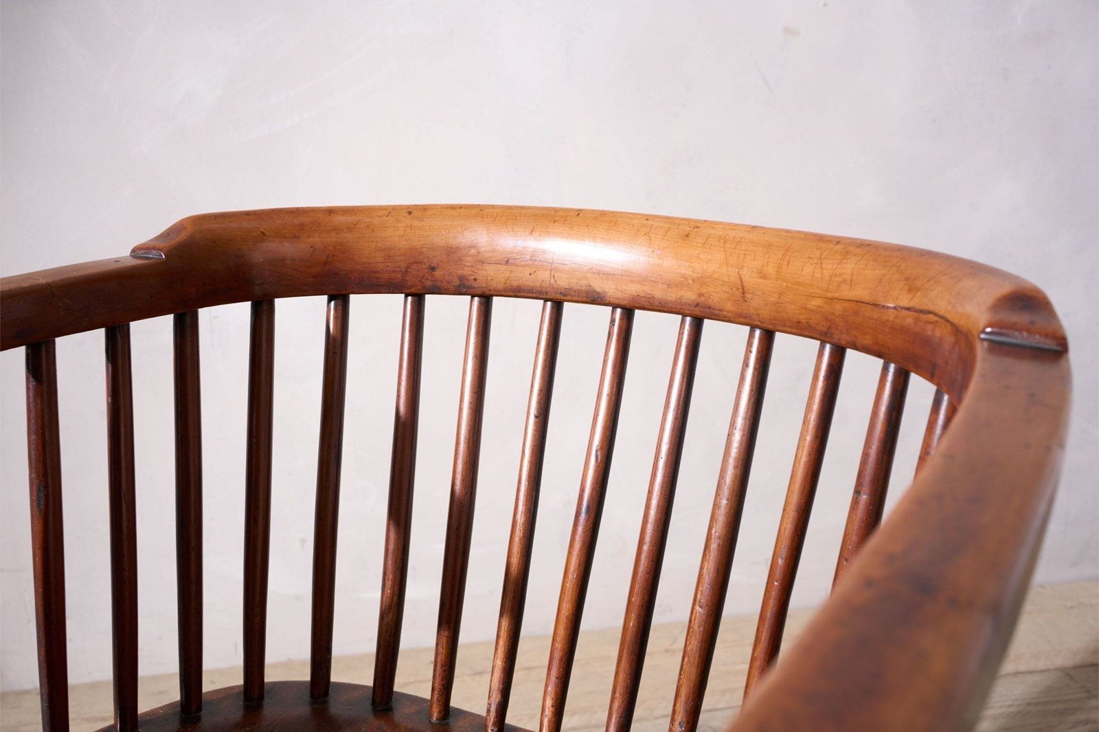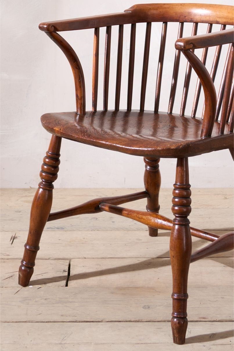 This is a particularly rare c.1800 country low back Windsor chair. This design is one I have always loved but they don't come up very often. A genuine Windsor chair that was originally designed with a low back. This model looks to be made from Ash & Elm and the colour is incredible. The originality is evident and the whole chair has a tactile feel. The low back detail as you can see is the way the chair has been designed as arms and back are all one piece of timber beautifully shaped. A classic piece of furniture that will work in a huge number of interiors.