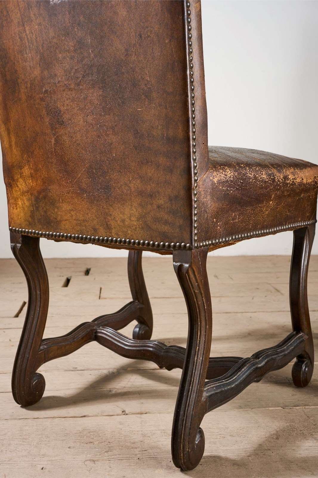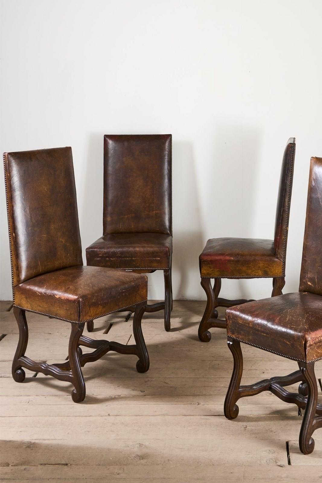 These are a truly stunning set of late 19th century Spanish dining chairs in totally original studded leather upholstery. Gorgeous colour and patina from years of use. No rips or tears. All re banded and ready for use. The design of the base is similar to Os De Mouton which is a striking element that makes these chairs hugely decorative.
