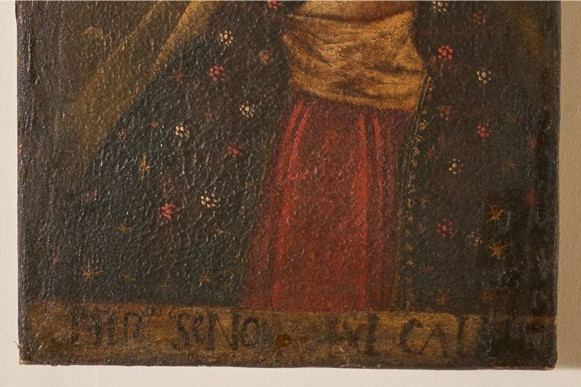 This is a very fine original 17th century Spanish colonial painting. The figure shown is Mary and there is some text below which I can't make out. The size means all details have to be fine and the certainly are. The canvas is in very good condition with no holes. It has been re stretchered but very well and was done to preserve the piece.