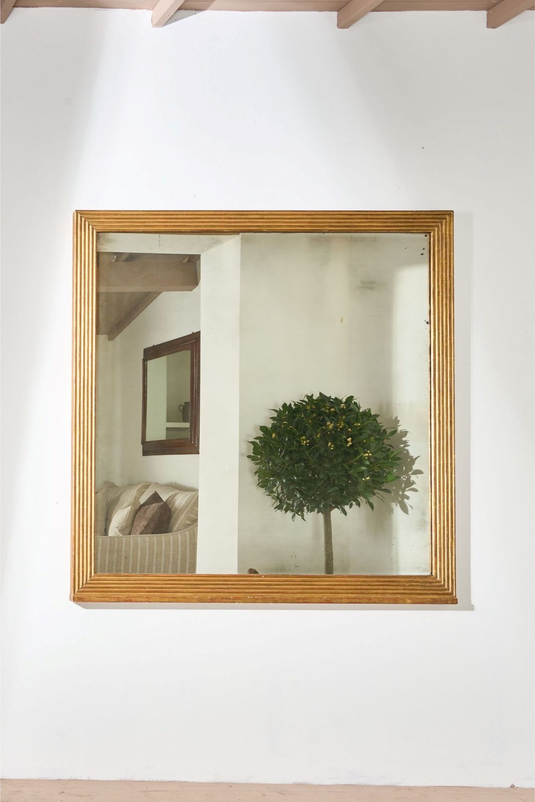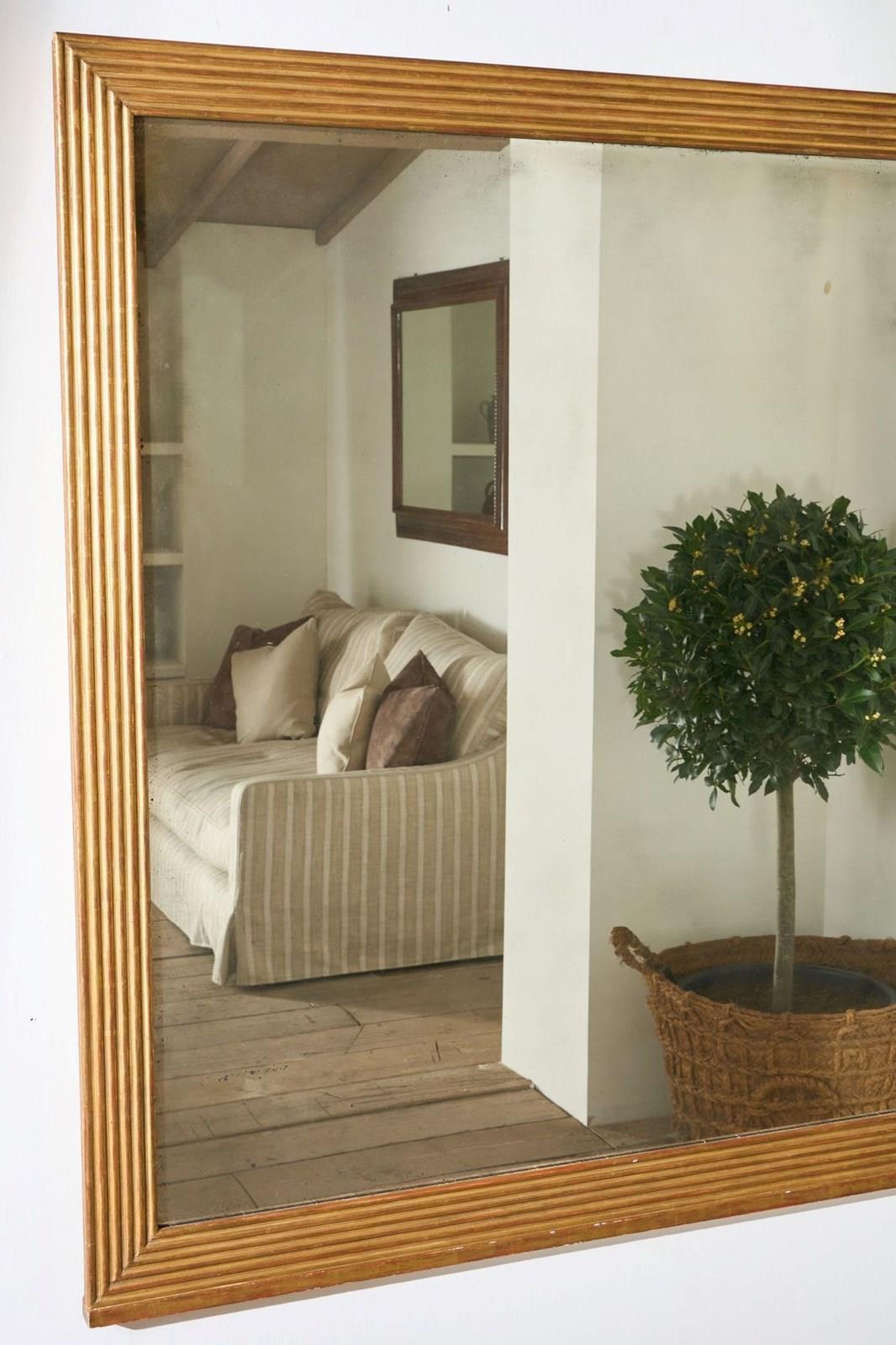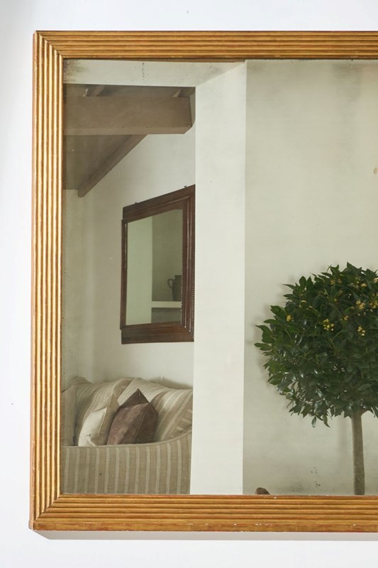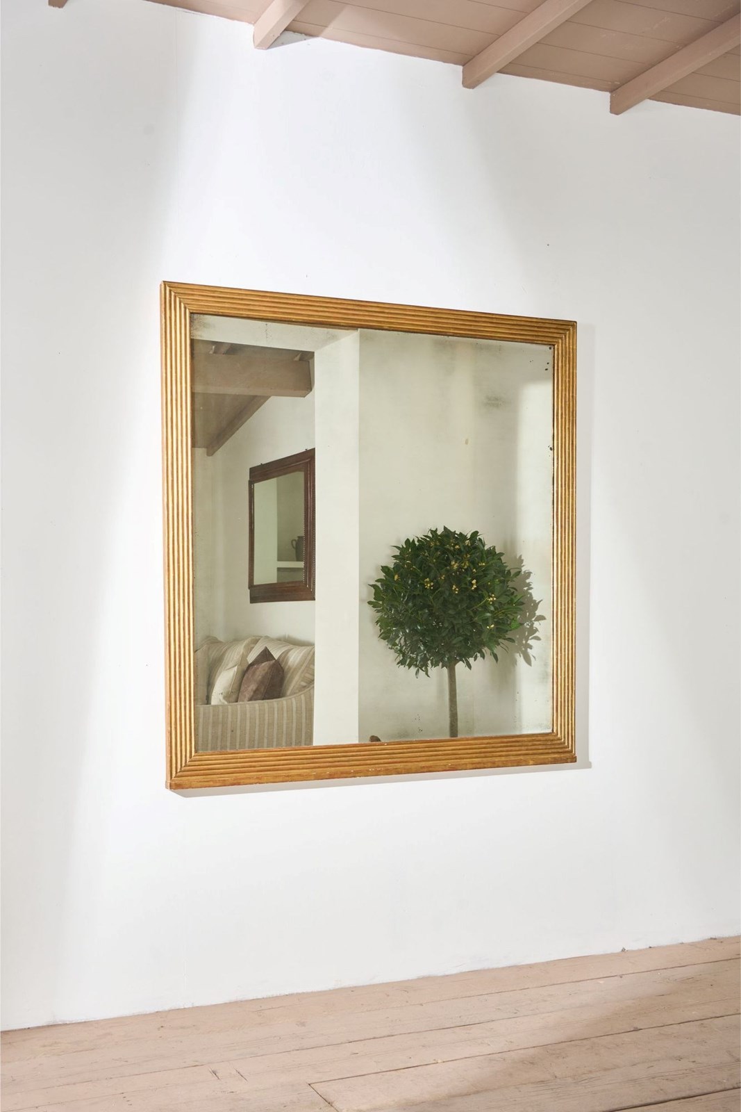 This a stunning, completely original very large square gilt overmantel mirror with reeded frame. It has an incredible foxed mirror plate offering the perfect balance of patination and usability. The scale of the mirror makes it a show stopping piece and although 19th century the reeded design certainly could work well in a contemporary interior. No major faults.