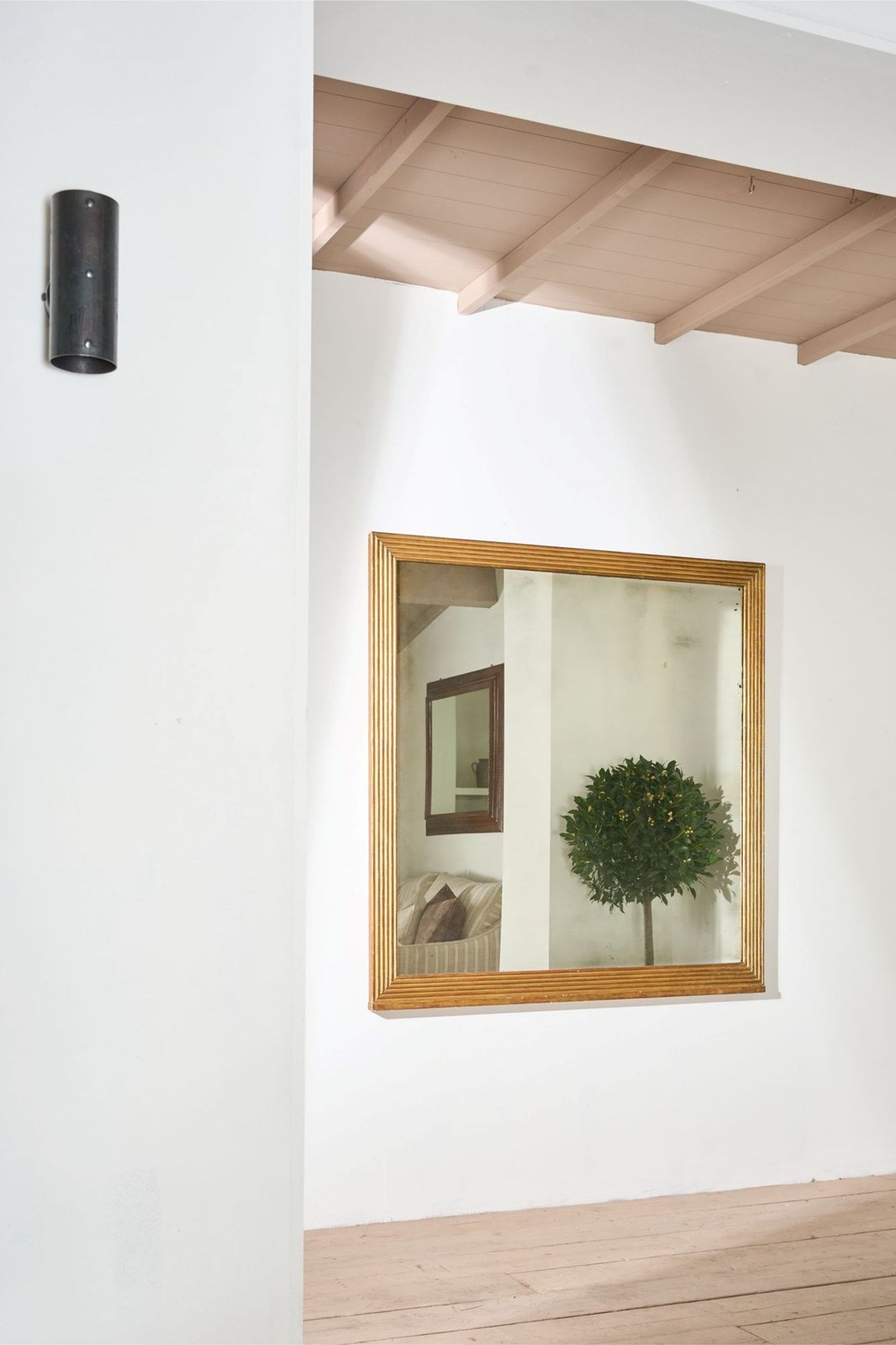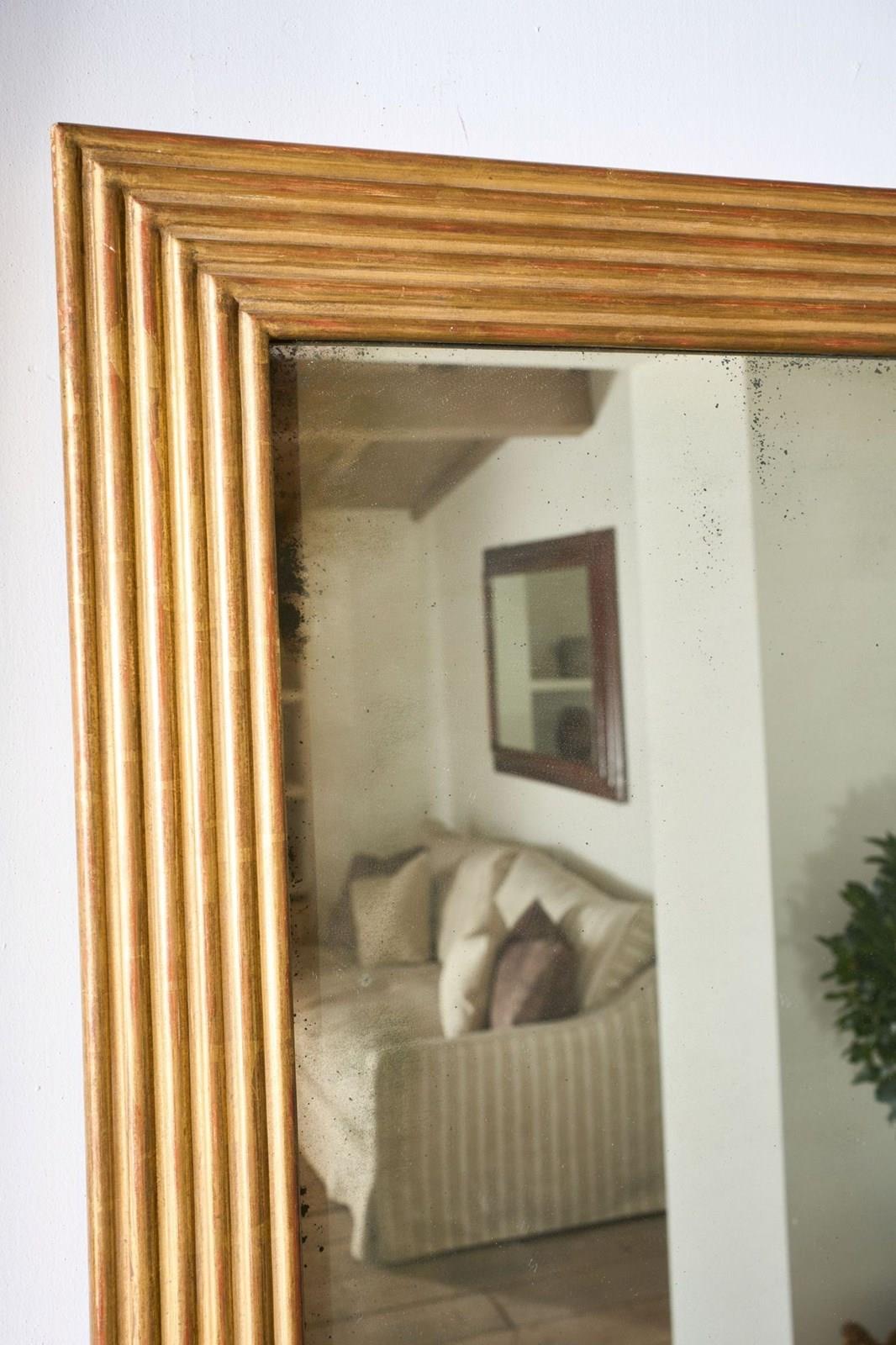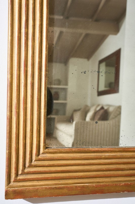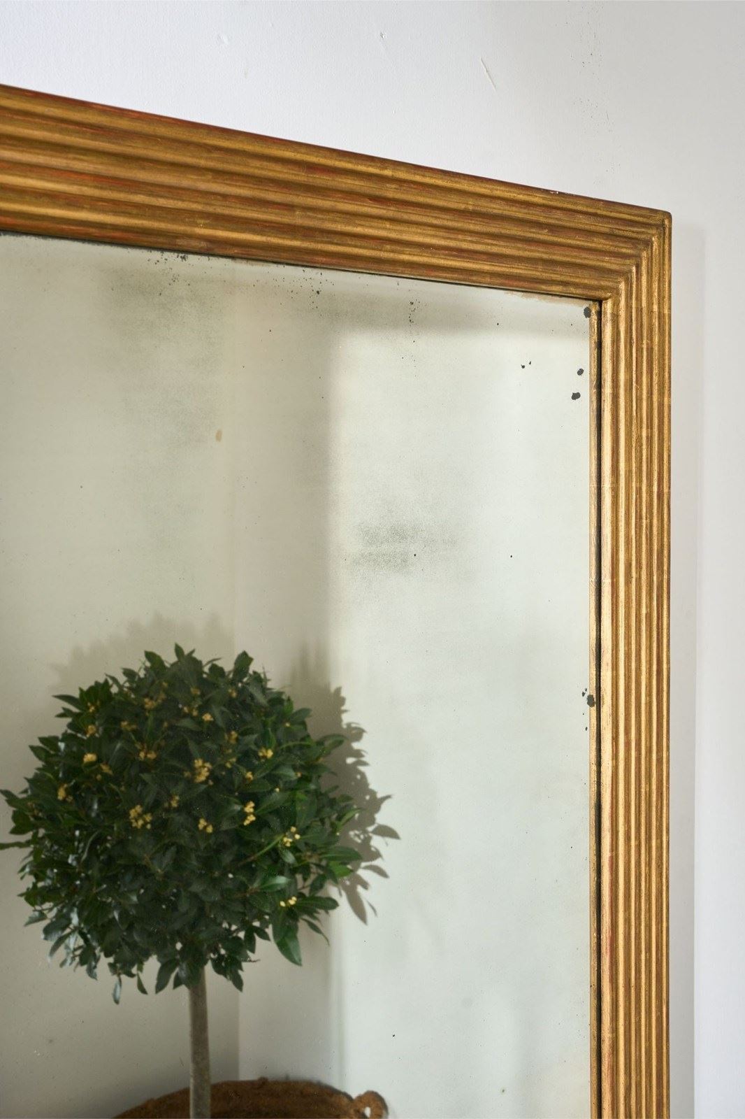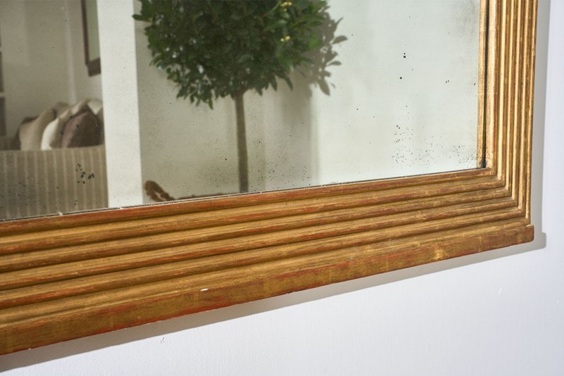 This a stunning, completely original very large square gilt overmantel mirror with reeded frame. It has an incredible foxed mirror plate offering the perfect balance of patination and usability. The scale of the mirror makes it a show stopping piece and although 19th century the reeded design certainly could work well in a contemporary interior. No major faults.
