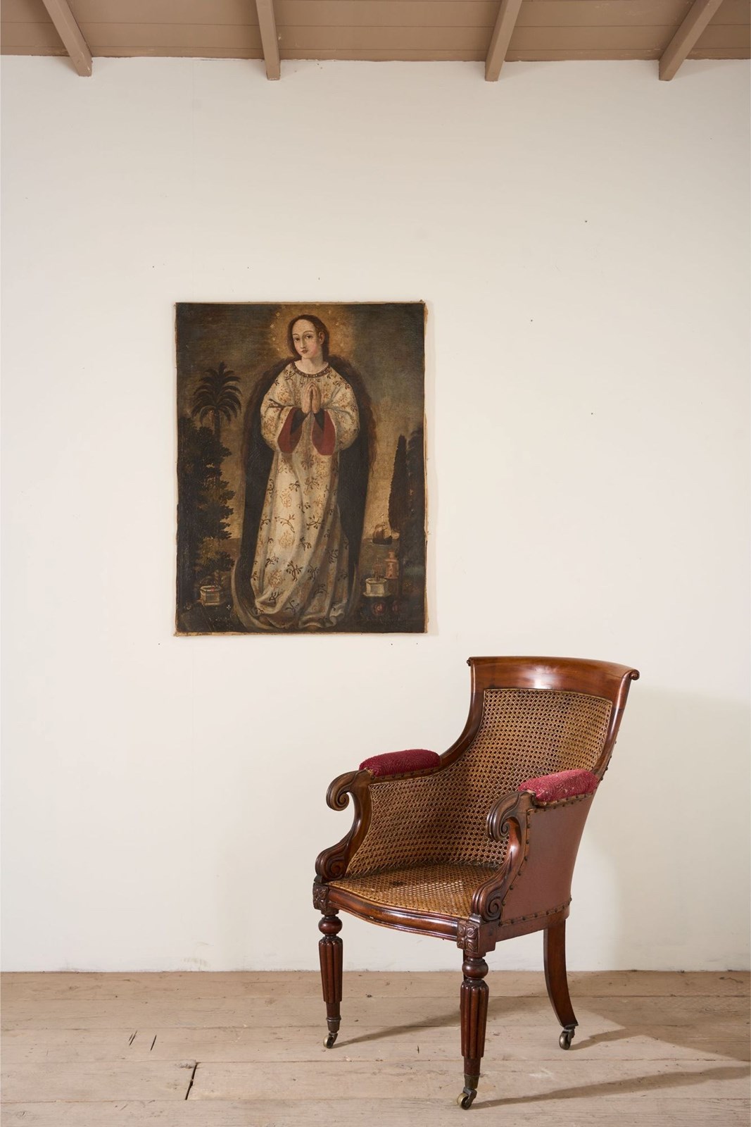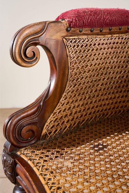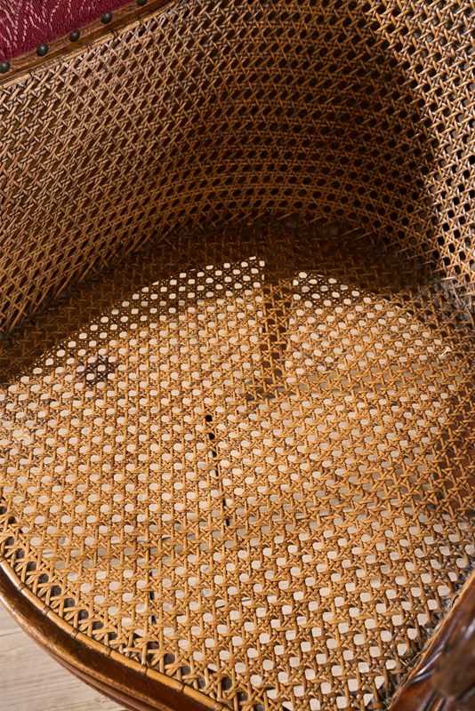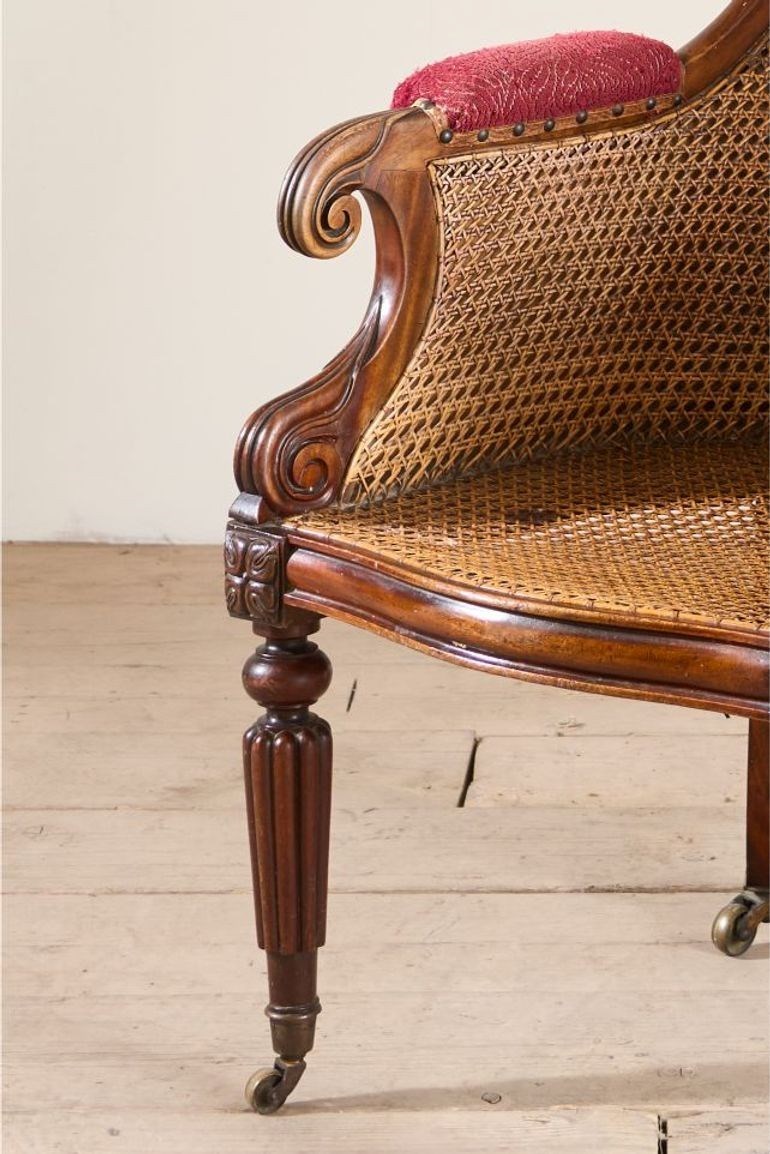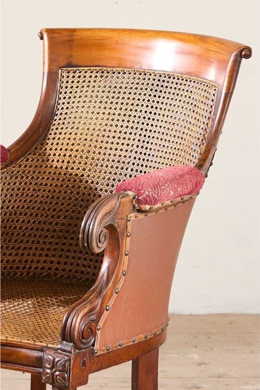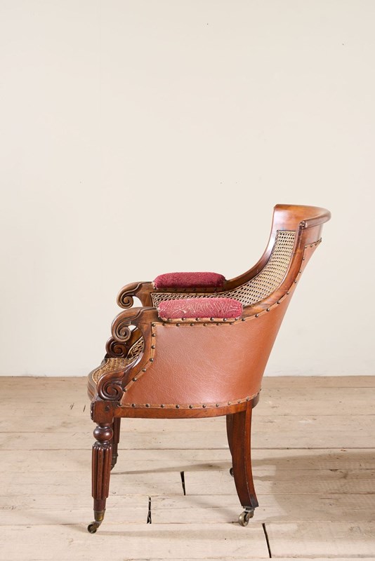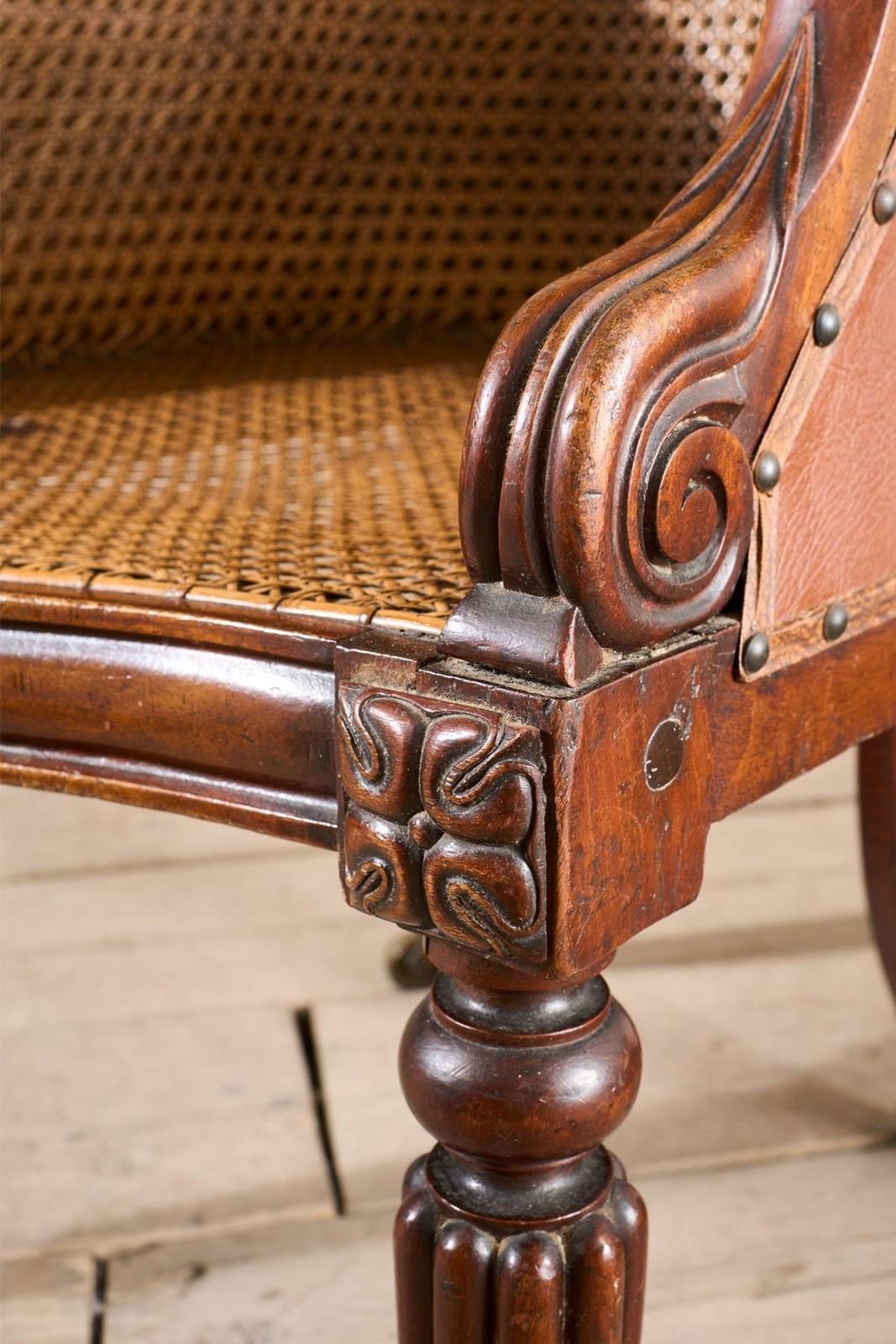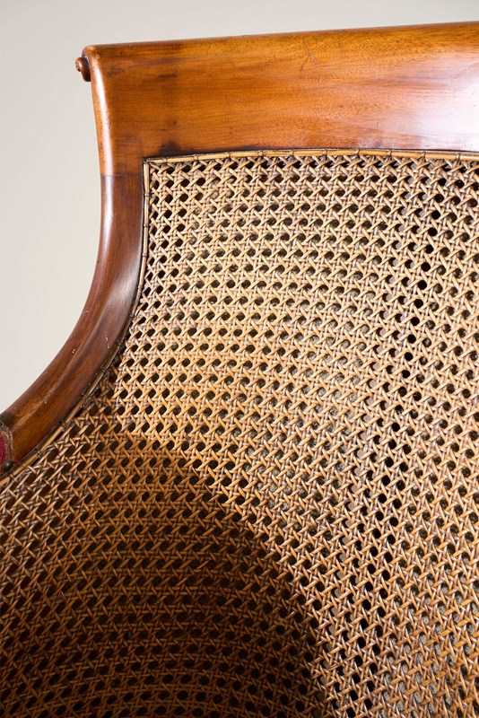 This a lovely quality rare surviving Victorian mahogany and cane library chair. Standing on carved mahogany legs all complete with original brass casters. The cane work is all in tact which is great to see and looks to be original throughout. The chair would benefit from a seat cushion which we can add for an additional cost should you like. The proportions are neat and the details are elegant and not too heavy. Overall condition is very good with no weakness. There is evidence of a historic repair to the front left leg but all solid and sympathetically done.