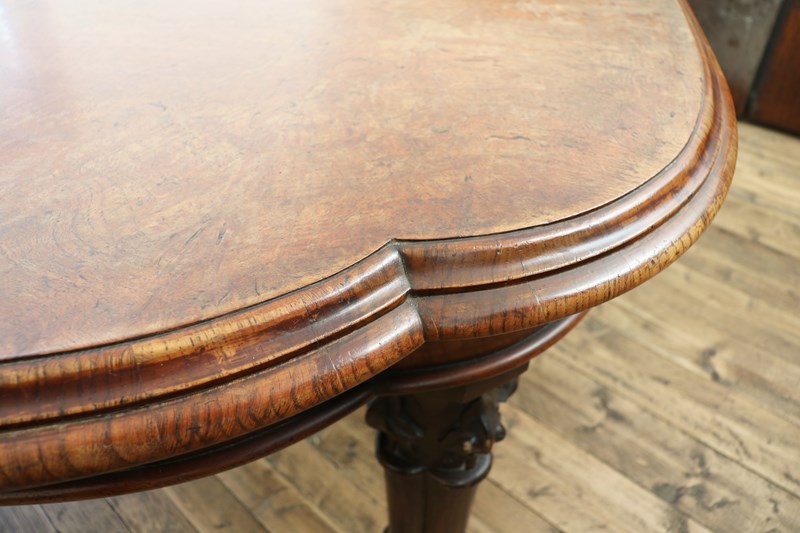 A very rare, superb quality and mid 19 Century Oak extending dining table. Having a burr oak veneered top, shaped ends with lovely double moulded edge and six original leaves, gothic legs and fine heavy brass castors.