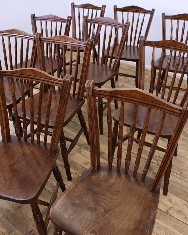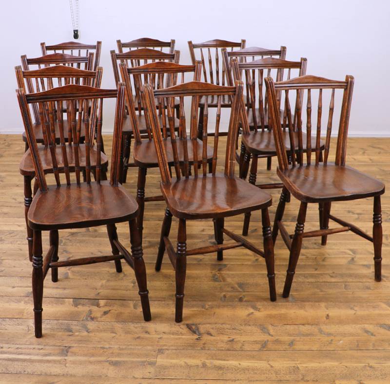 Made around 1900 by a firm in Dundee, Scotland, this is a rare number! They have lovely well figured solid elm seats , bamboo-esk back rails and I believe they came from a Community Hall.