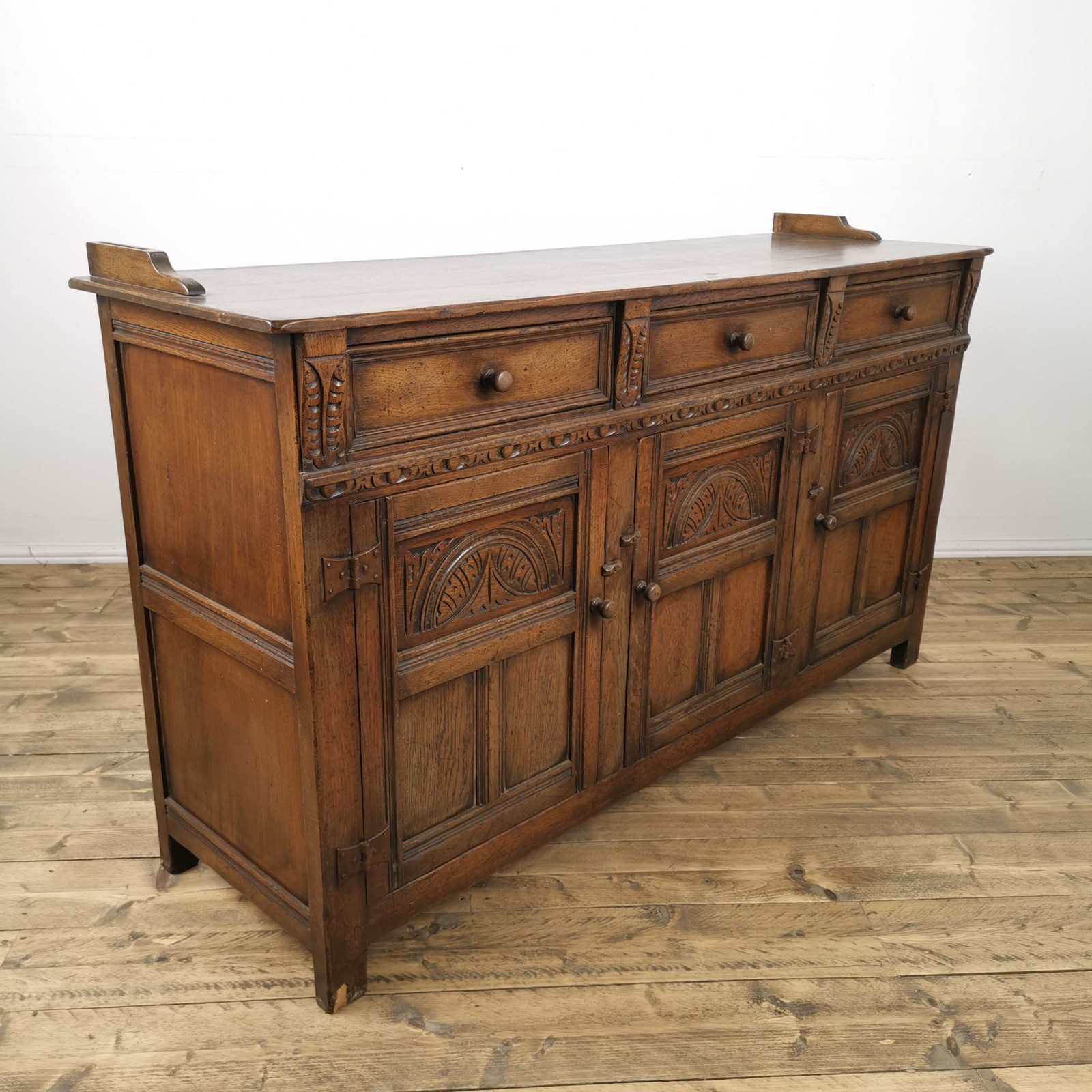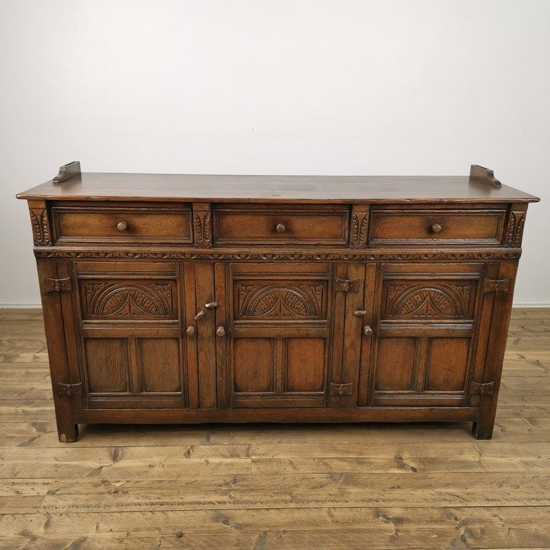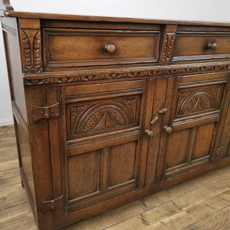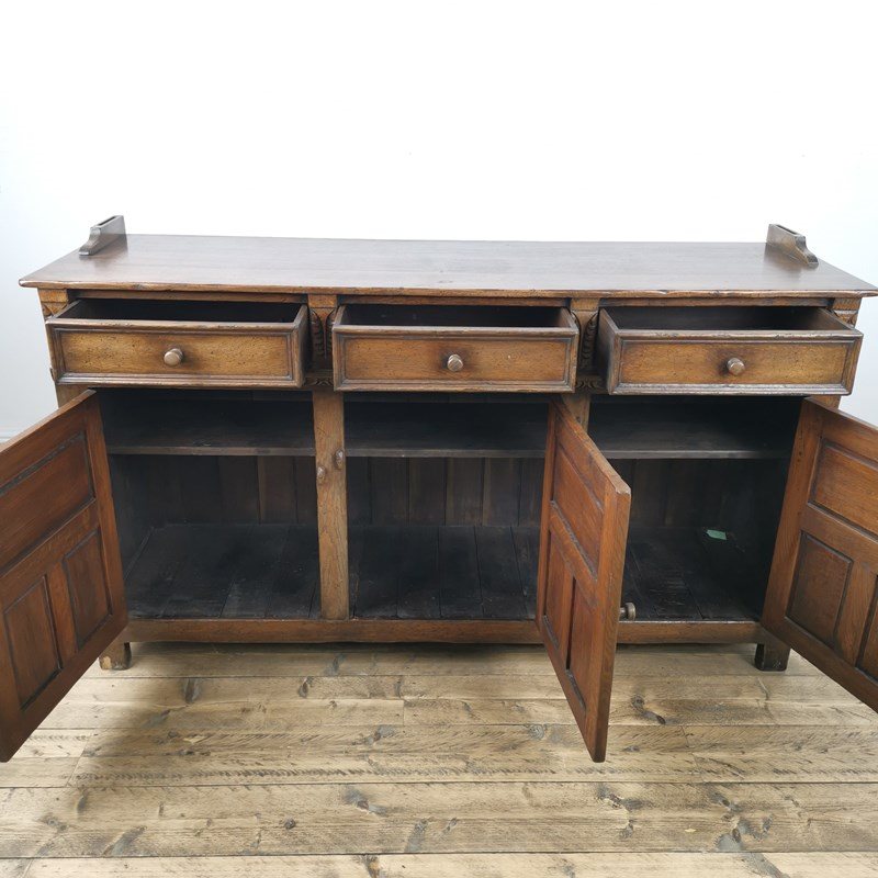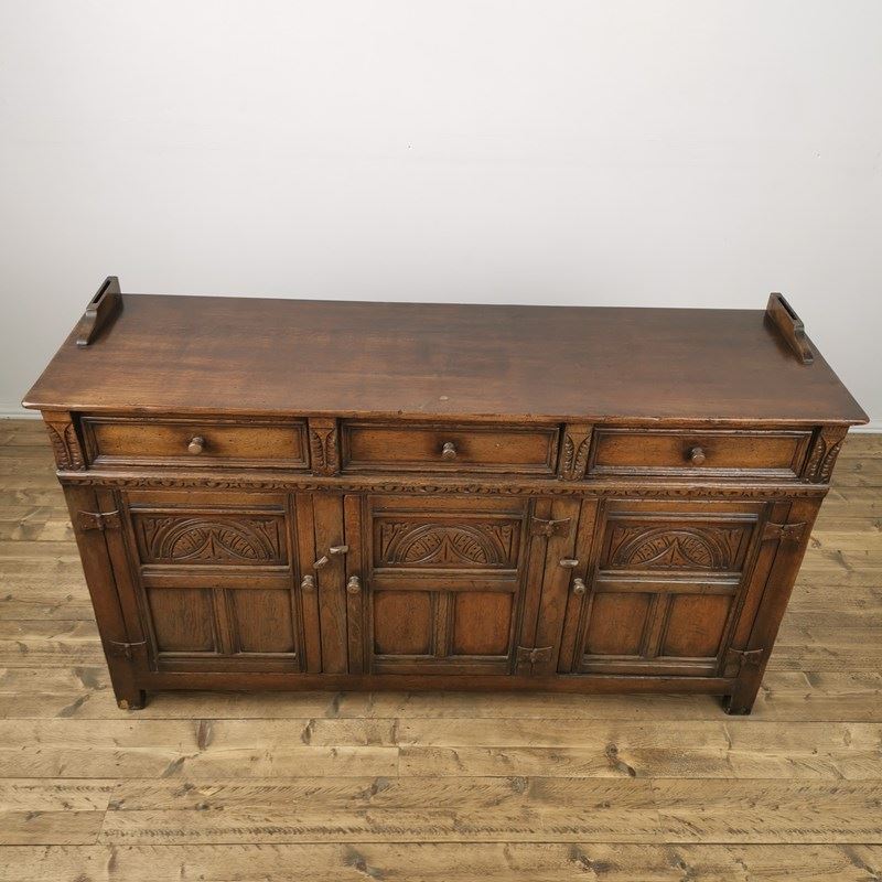 Nearly 18th Century style oak sideboard waiter station having carved panels, steel butterfly hinges and three frieze drawers. Very very nice quality, we will remove the rack feet on the top and polish out. This is a very nice useful practical piece of furniture for a public restaurant.