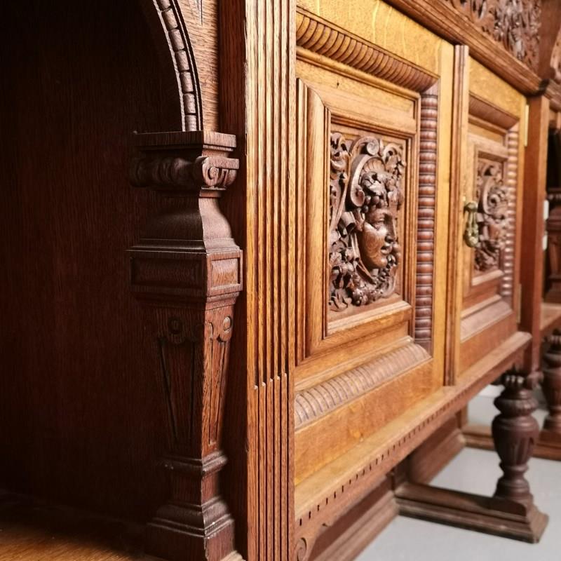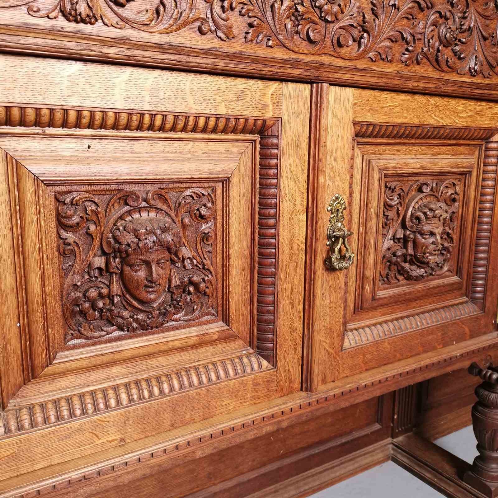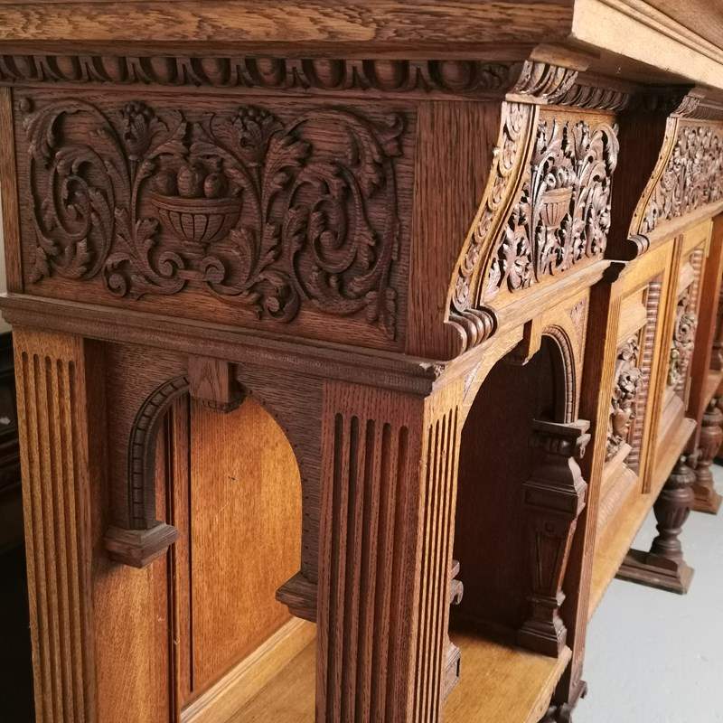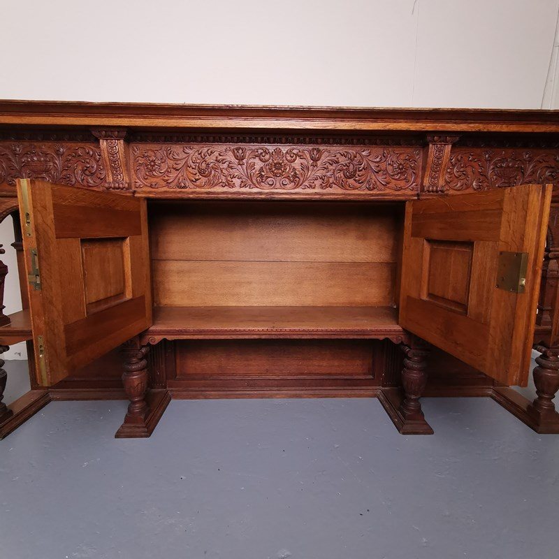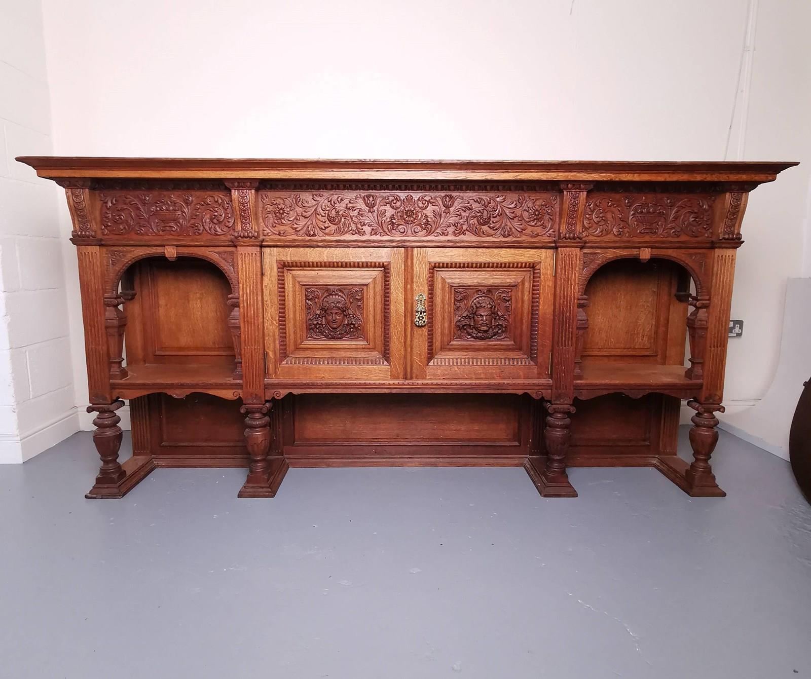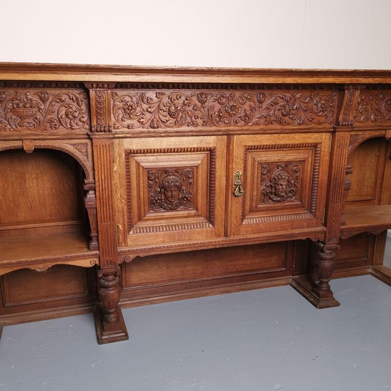 The most fantastic quality, late 19th Century oak wall unit/ sideboard/ back bar. I've been in the antique business for more years than I can remember, and this is one of the most fantastic quality oak pieces of furniture that I have ever had the pleasure of owning! The quality of the timber, the carving, the brass handles, the proportions, everything about it exudes quality, it's even carved on the sides! I know the base is missing, heaven knows what that wouldn't looked like but I feel if you used it as a back of a bar with bottle and glasses, it would look quite amazing! If you look a the pictures, it is absolutley beautiful.