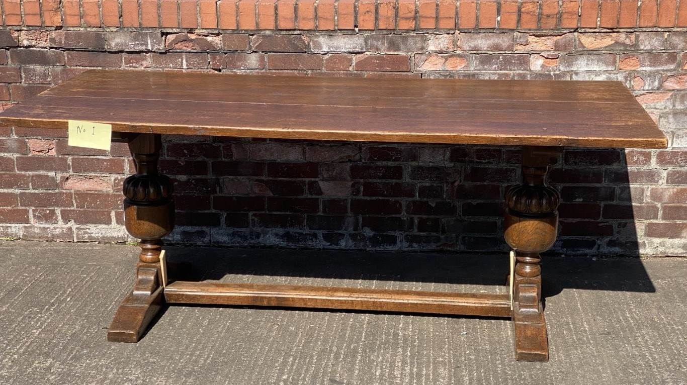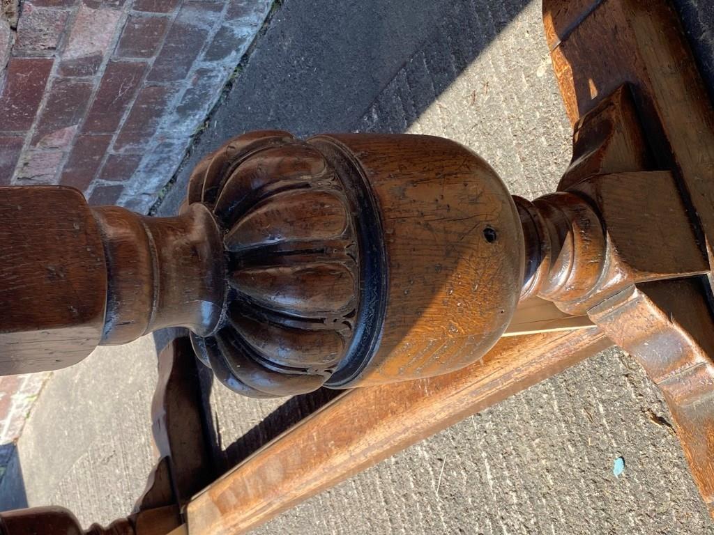 A lovely looking table which needs a little work doing to it, as the construction of one or two dowels have come out. However, overall it is a good original colour with lots of character and lovely carved cup & cover pedestals.