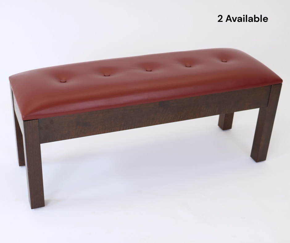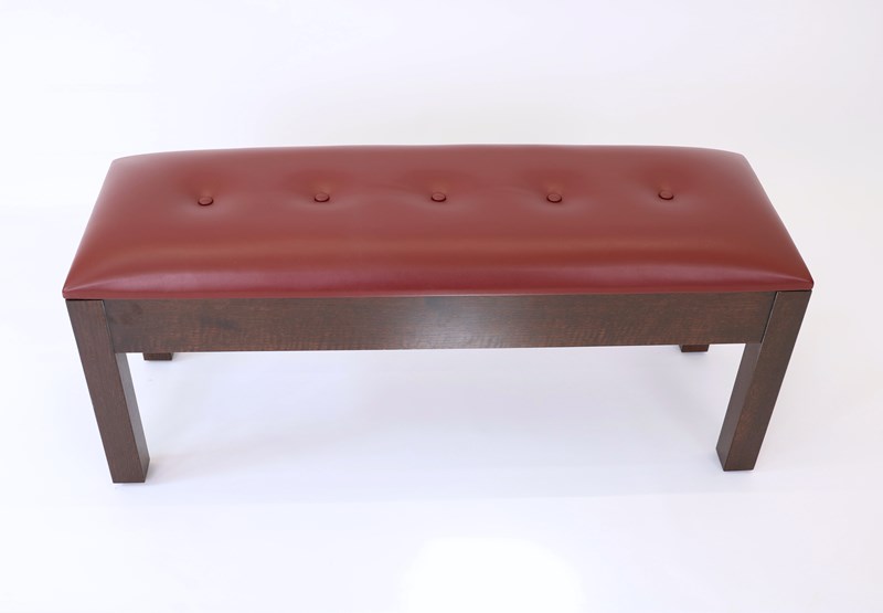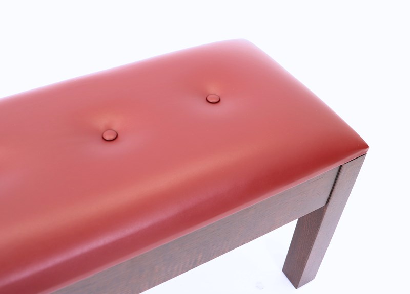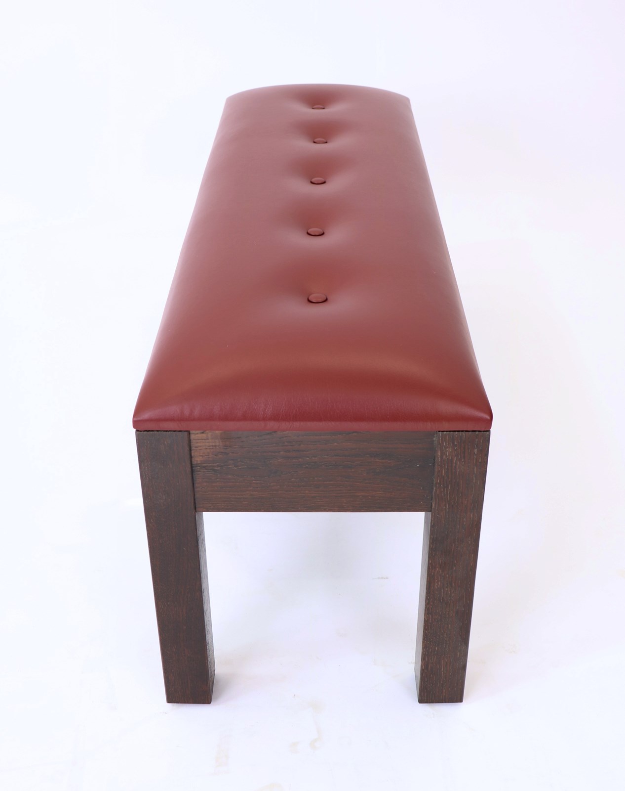 Oak framed bench seat with red leather upholster seat, with 5 floating button detailing. Stained in our Taylor's dark oak finish.