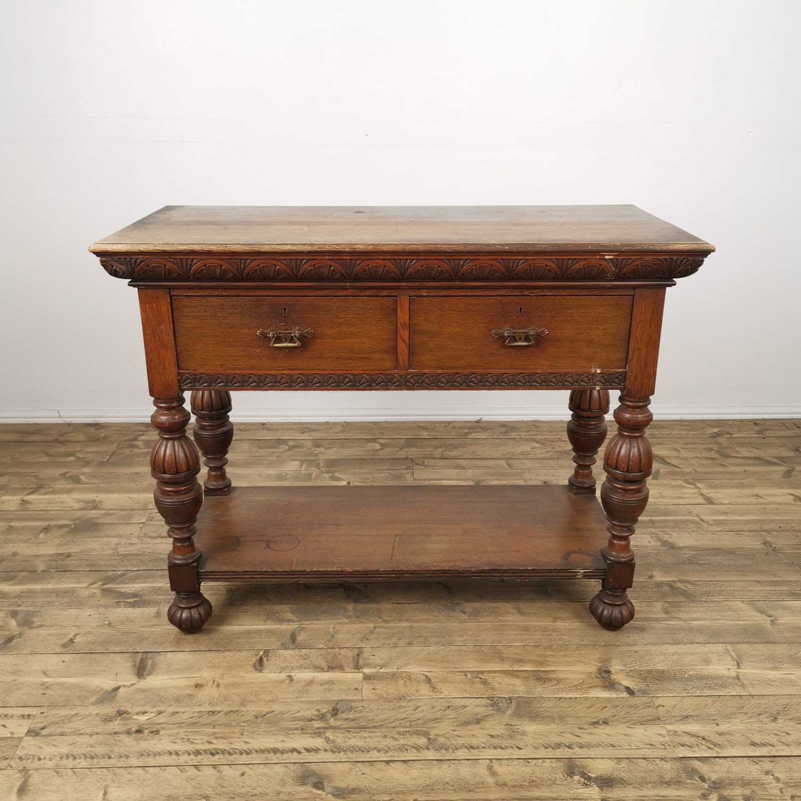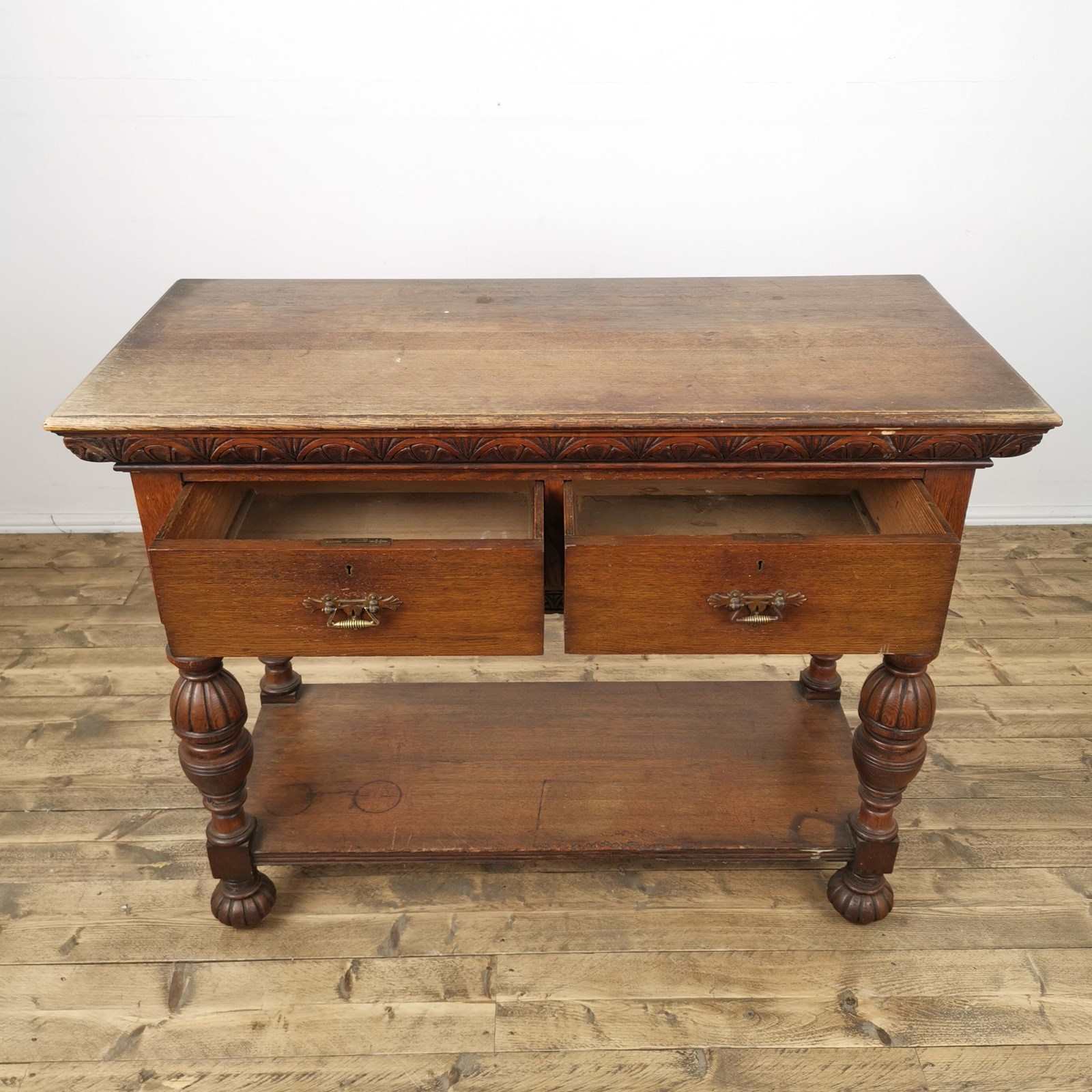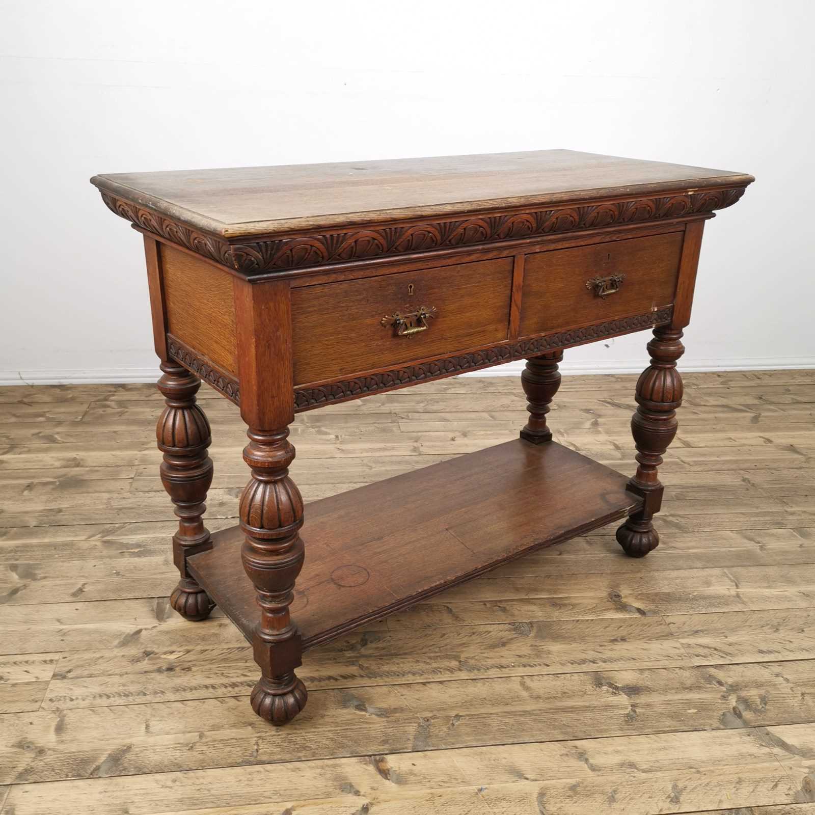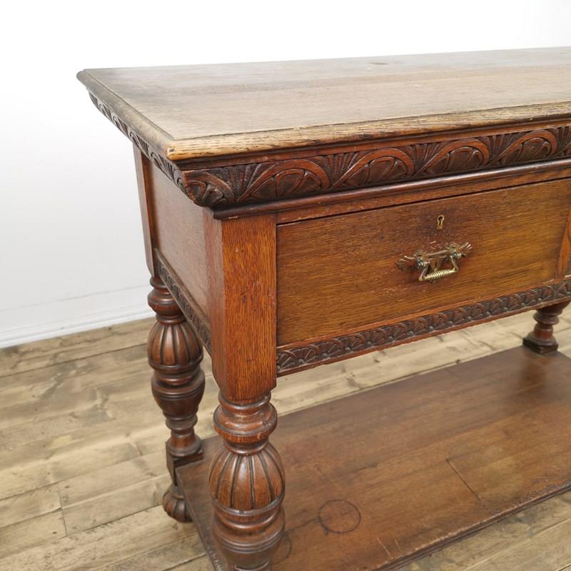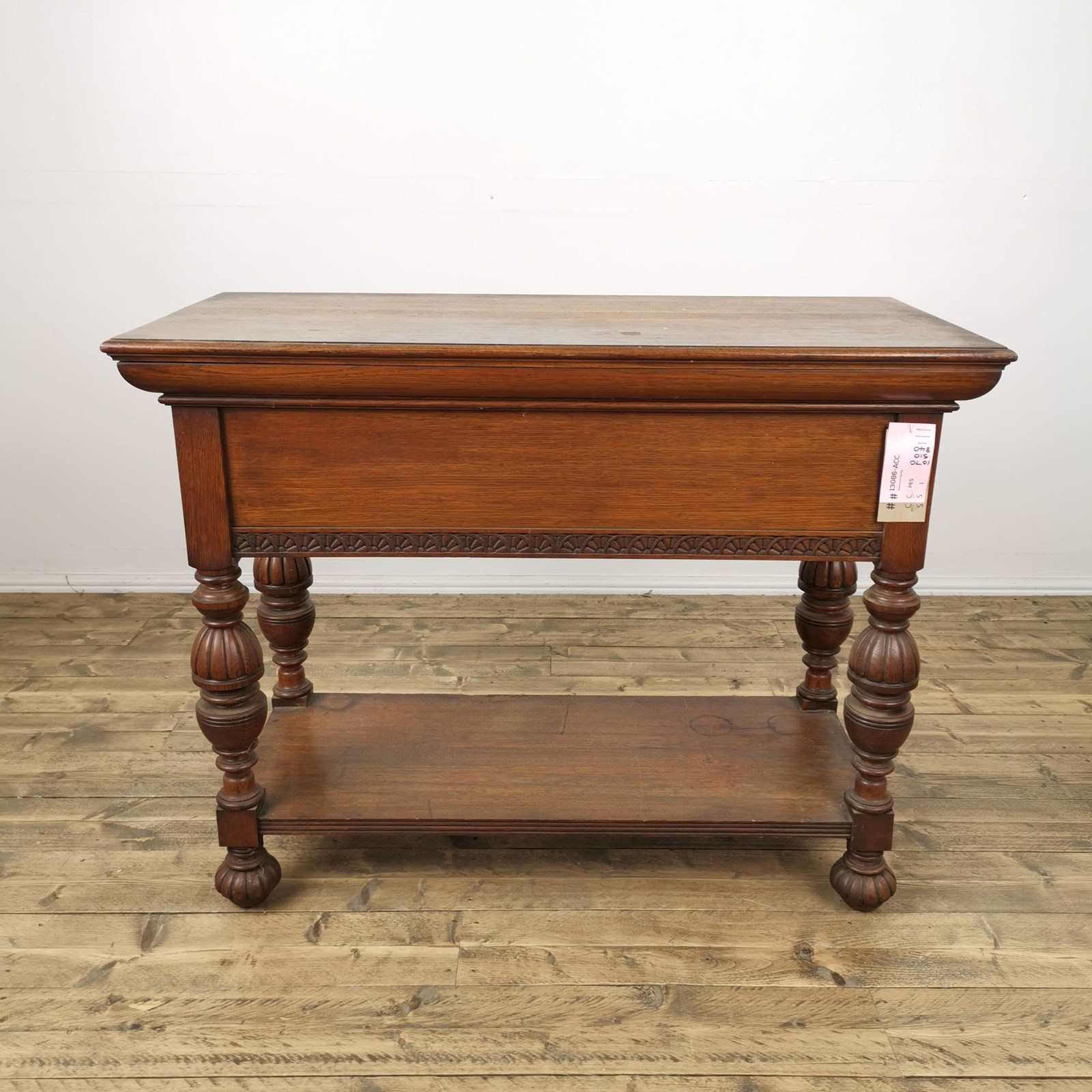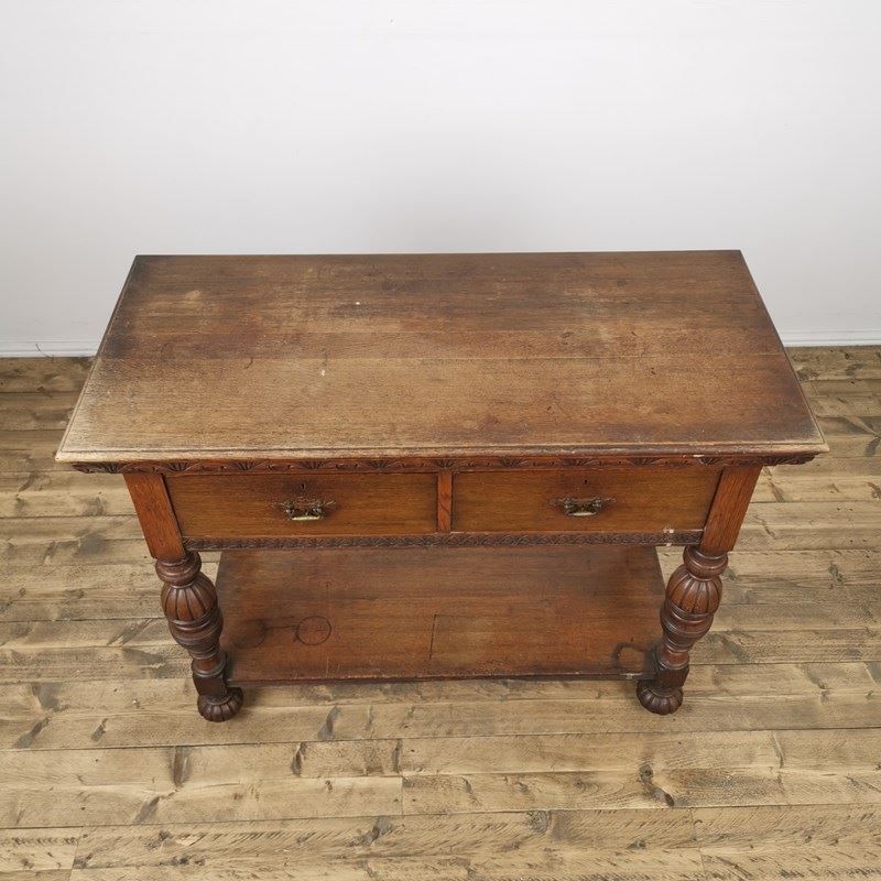 A very nice quality and useful piece of oak furniture with original brass swan neck handles. Freestanding and ideal as a newspaper table, a serving table or for a coffee machine and table cutlery with drawers and shelf beneath.