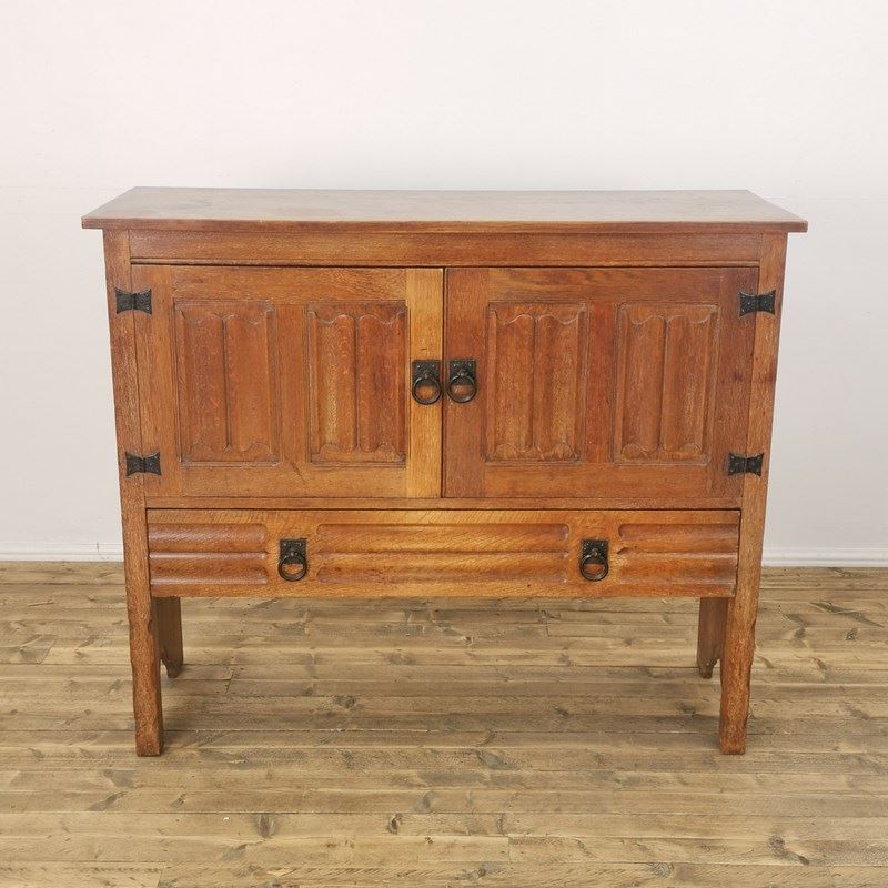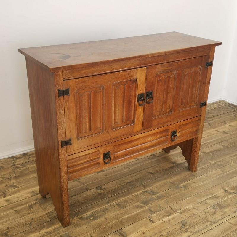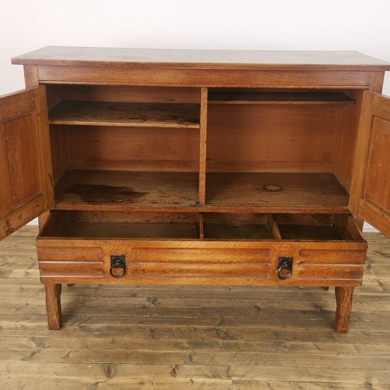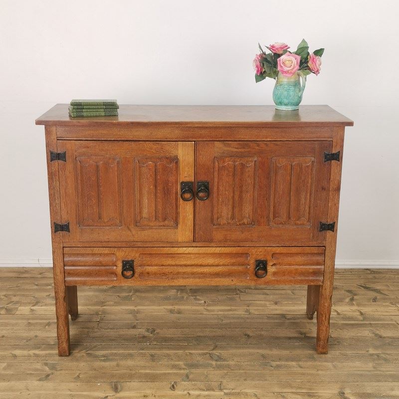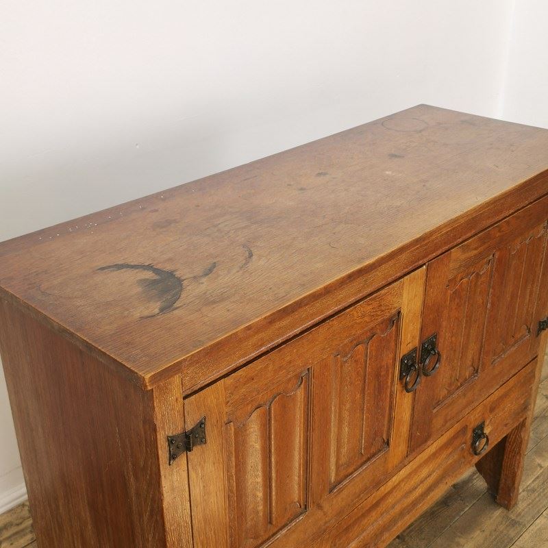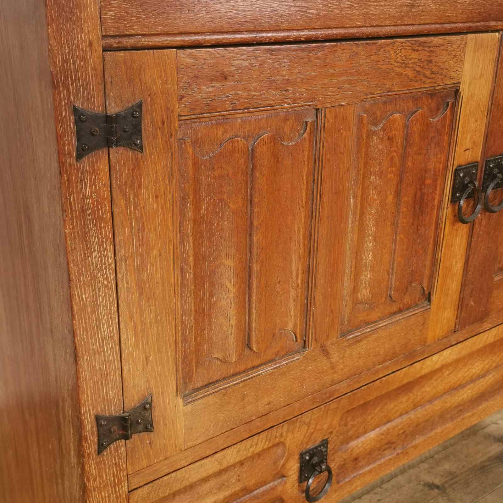 Solid oak sideboard having linenfold panelled doors, handmade butterfly hinges, internal shelves, as well as an additional full length drawer underneath.