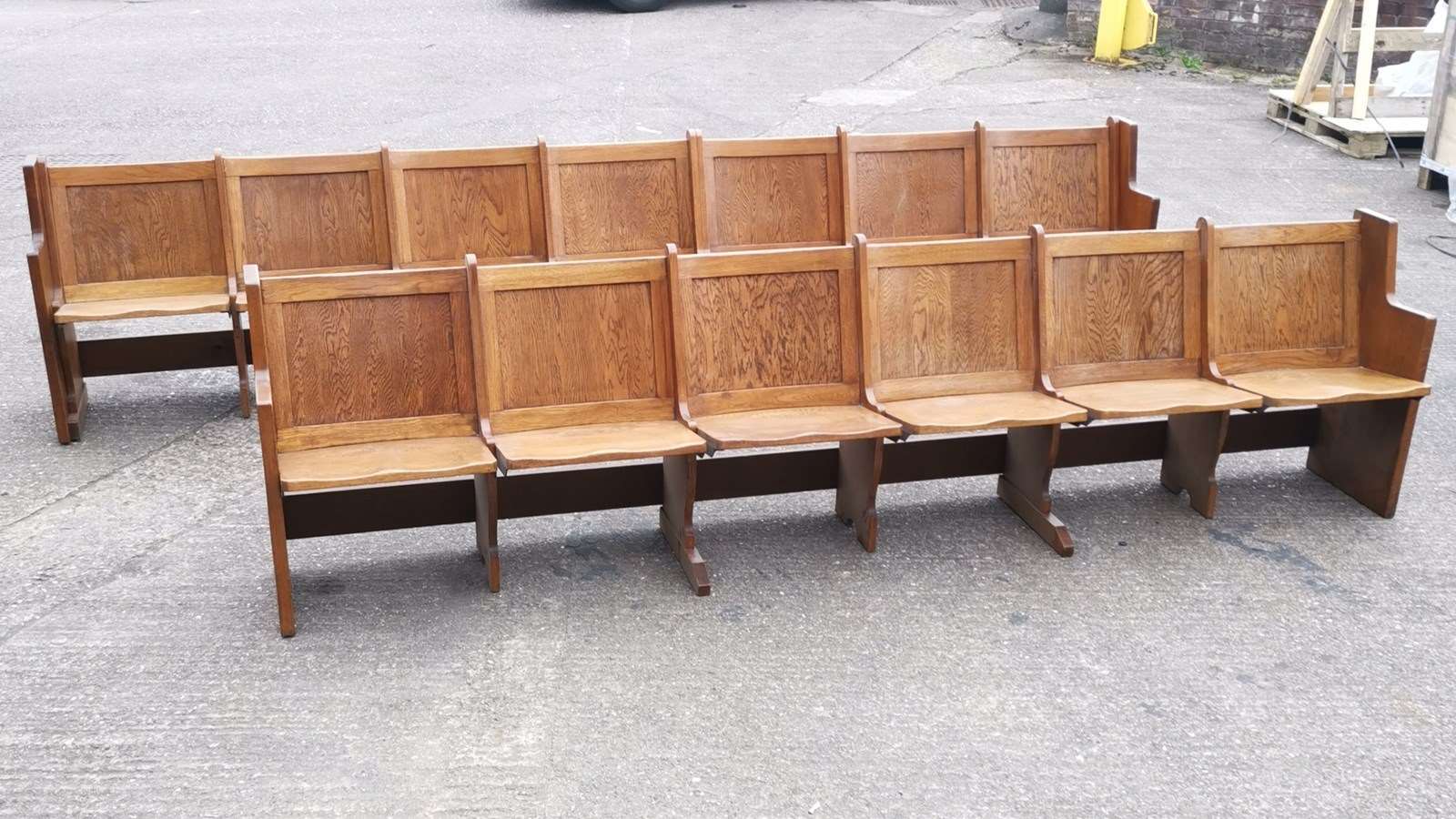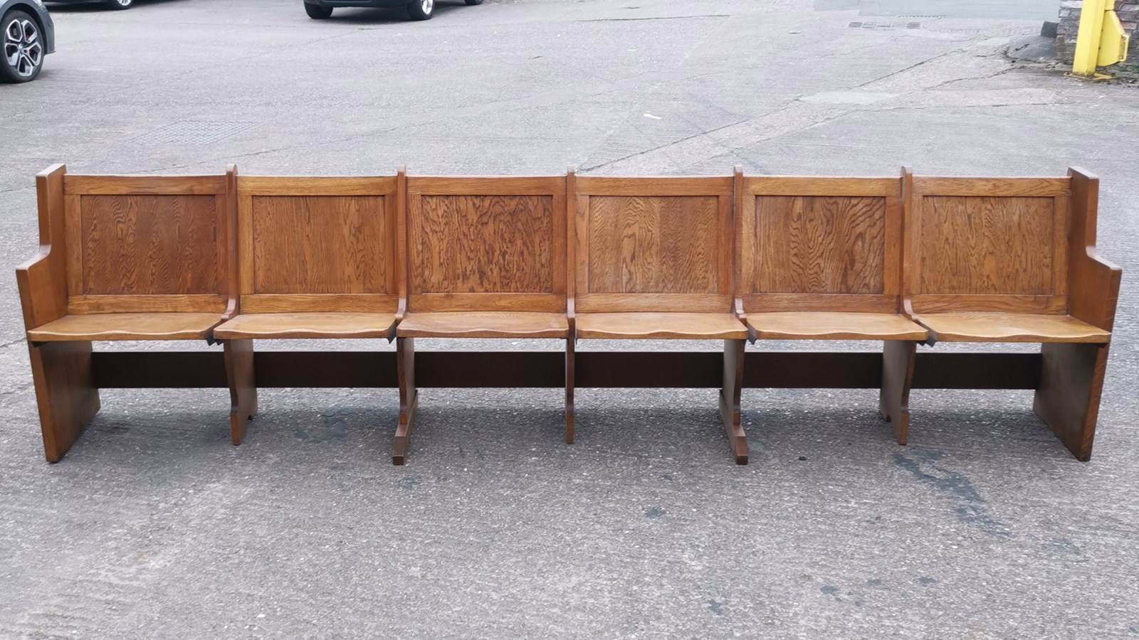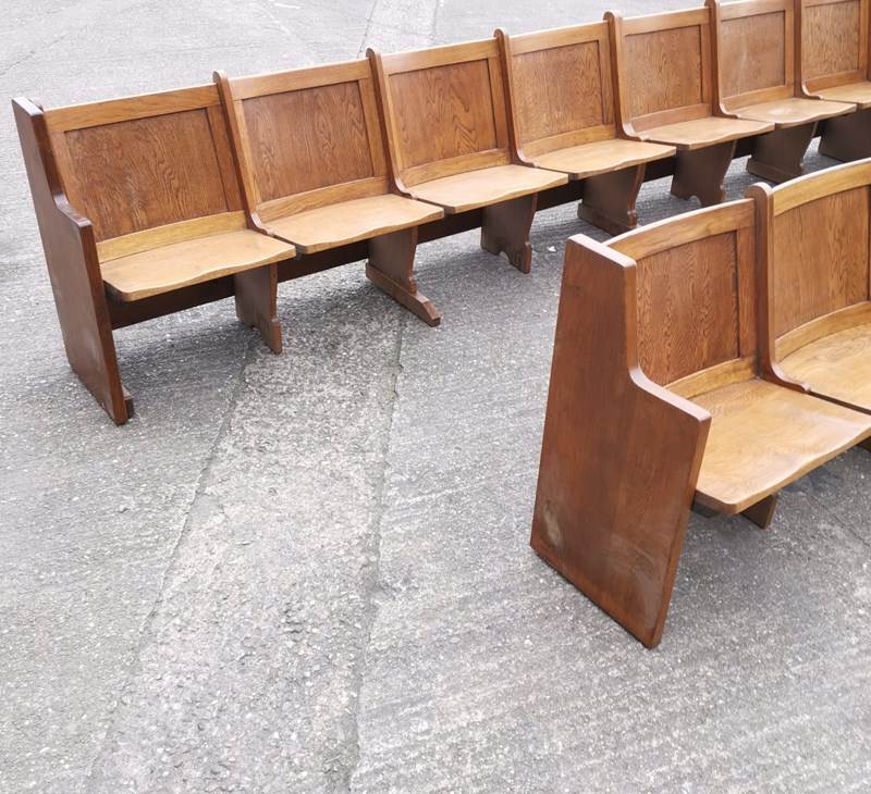 Good solid construction with shaped solid oak seats and bowed plywood backs. It has been through our workshop, has been checked over and waxed up and is in very good fettle.
