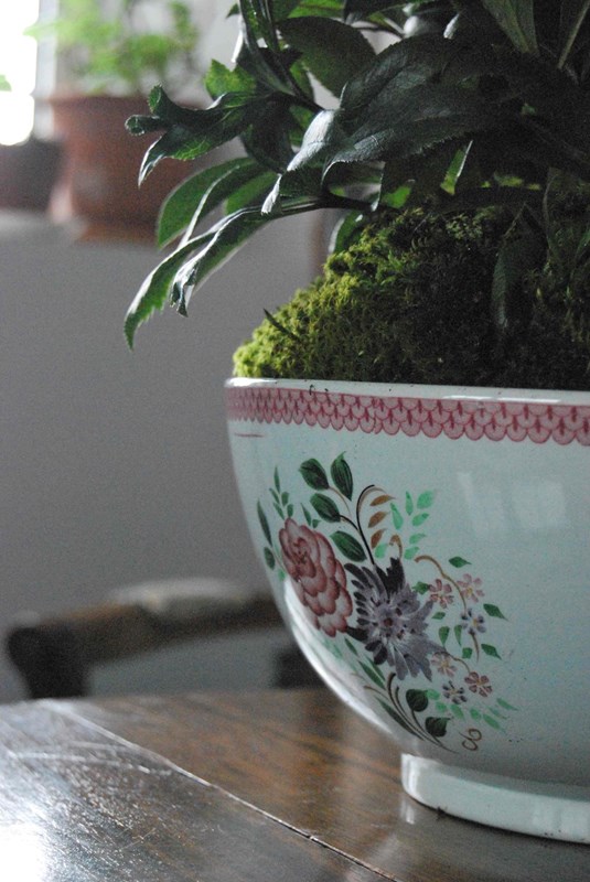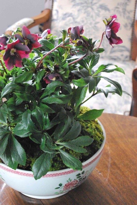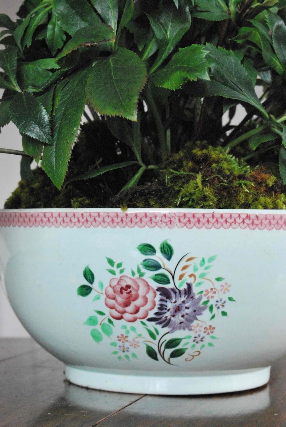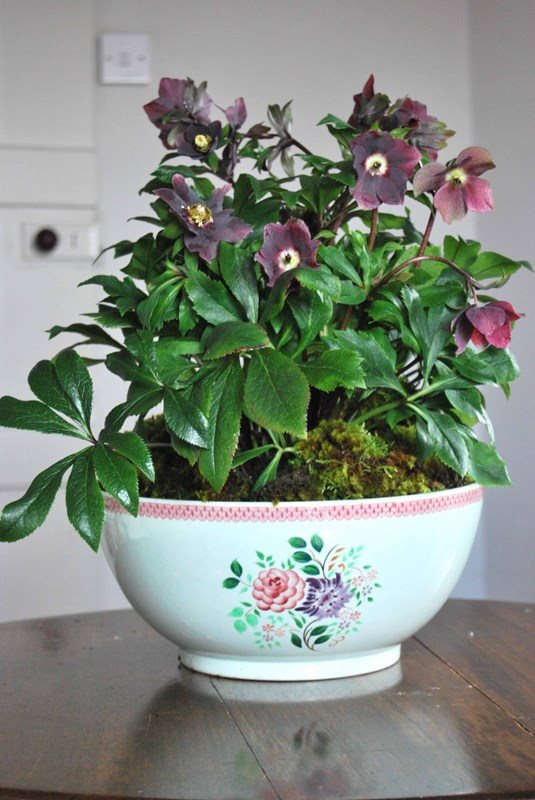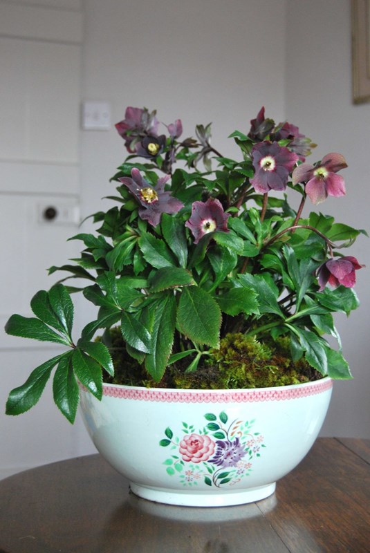A large Adams Calyx Ware bowl, circa 1930s, in the Mandalay pattern in excellent condition planted up generously with Helleborus ' Victoria’ a single red which is much more of a deep burgundy colour and a prolific flowerer.