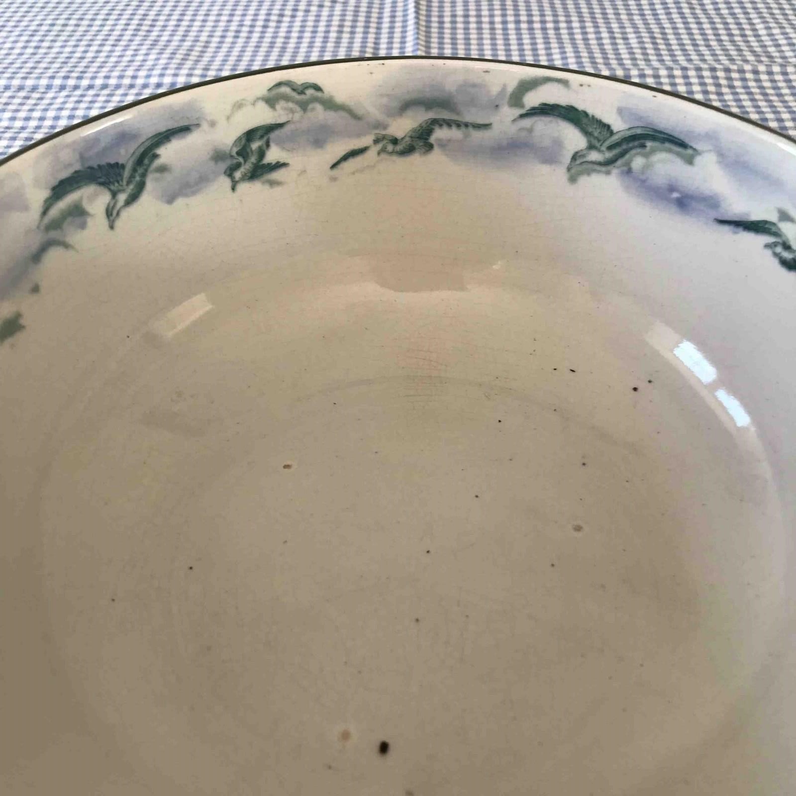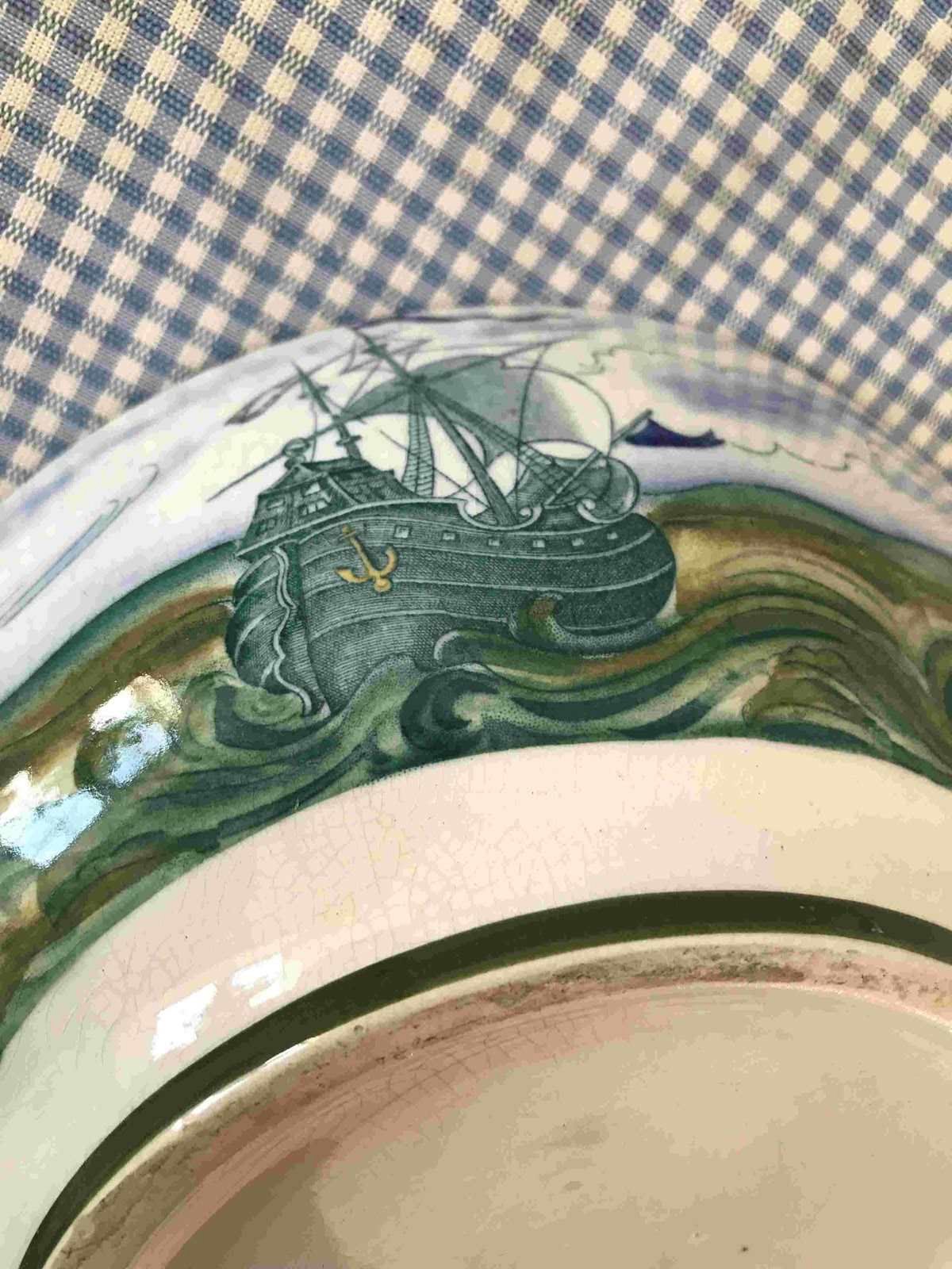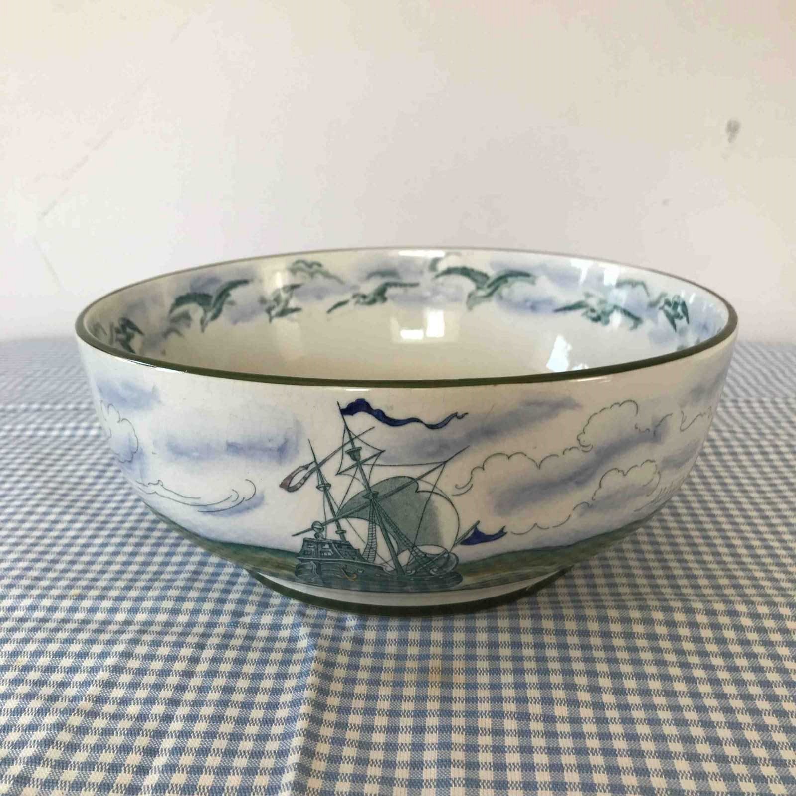 A handsome, large Furnivals fruit bowl in excellent condition decorated with illustration of the sea, galleons and seagulls - a very nautical piece. The catalogue states that "Furnivals 797 pattern features a detailed, rigged galleon ship decorated with overglaze enamels on a white background on a very fine eggshell porcelain plate".