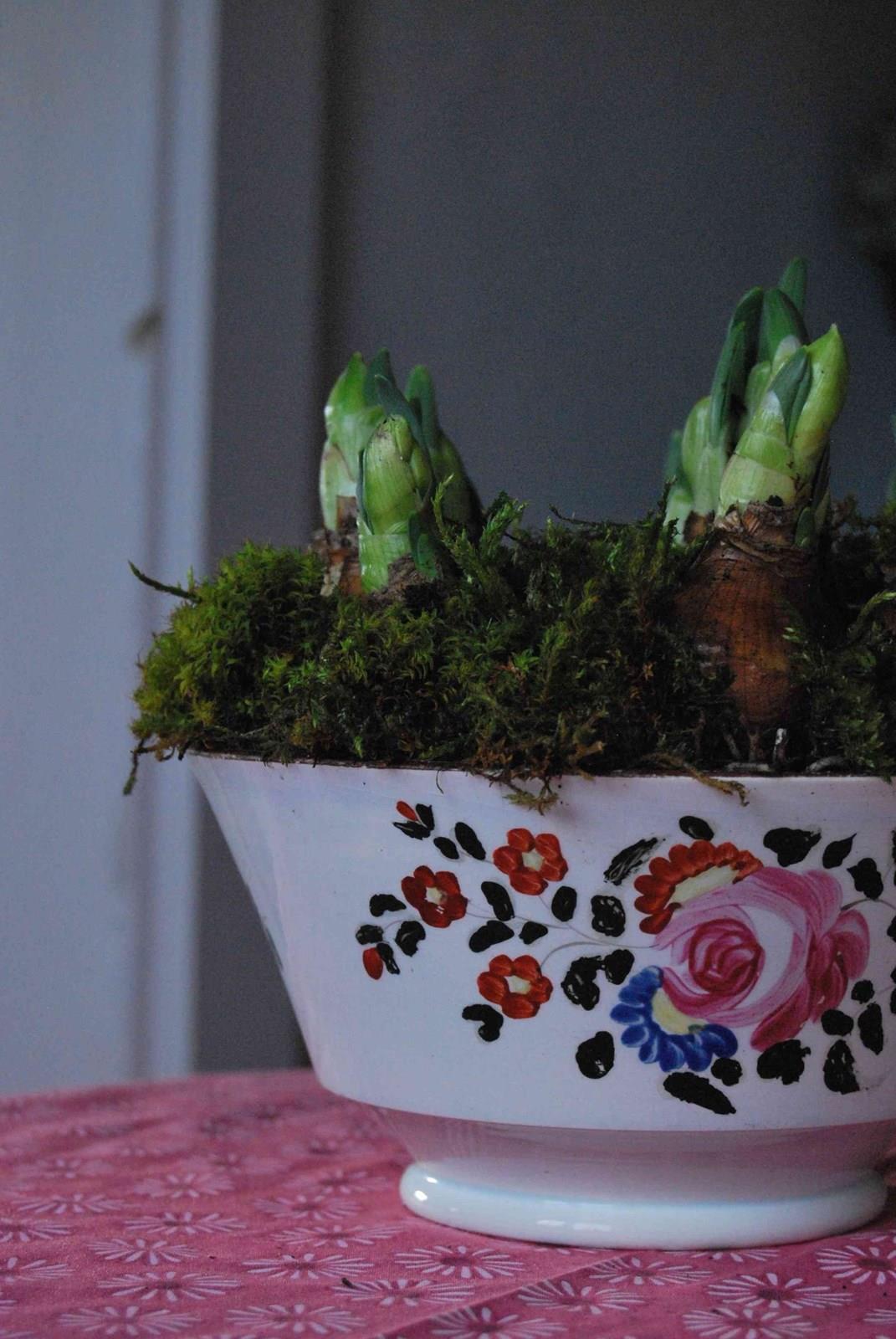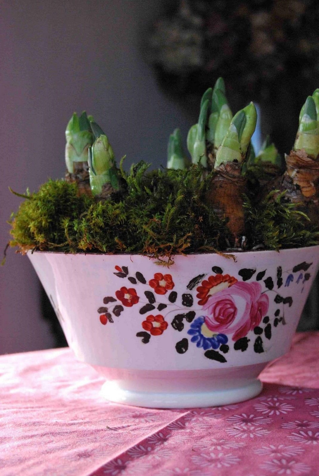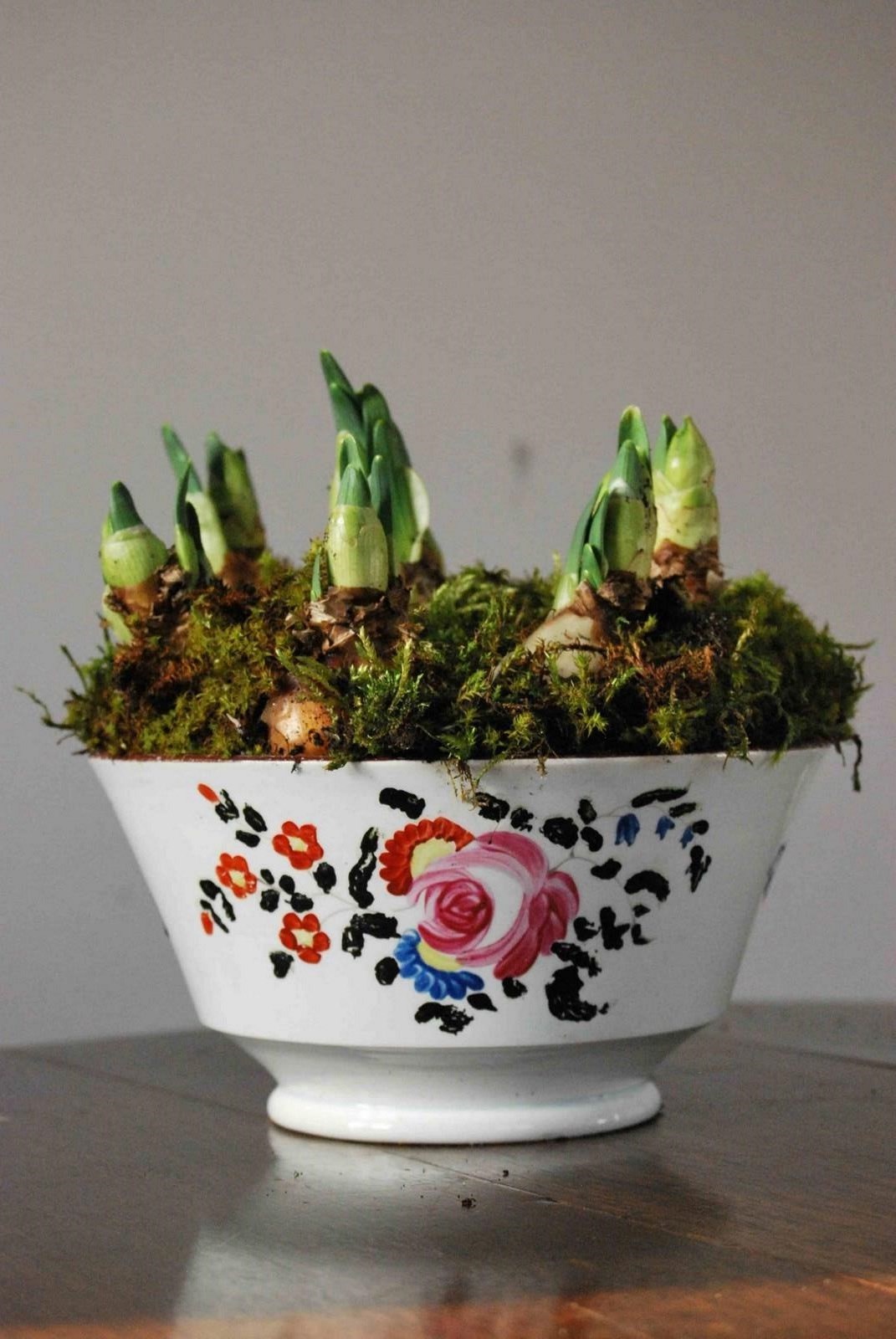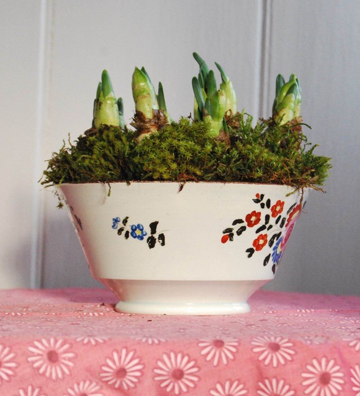 A good late 18th century Georgian pearlware bowl in the ‘London shape’ planted with ‘Bridal Crown’ narcissus. Decorated with overglaze enamel flowers and a brown rim. It is hand thrown and quite thinly potted. Dated between about 1800 and 1830. No makers marks. Generally good condition with two faint hardline cracks. Unfortunately the enamel on the green leaves has been rubbed off.