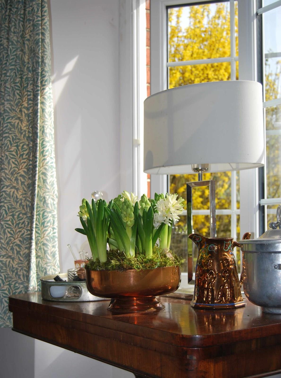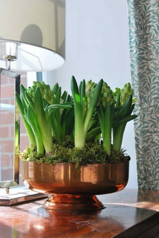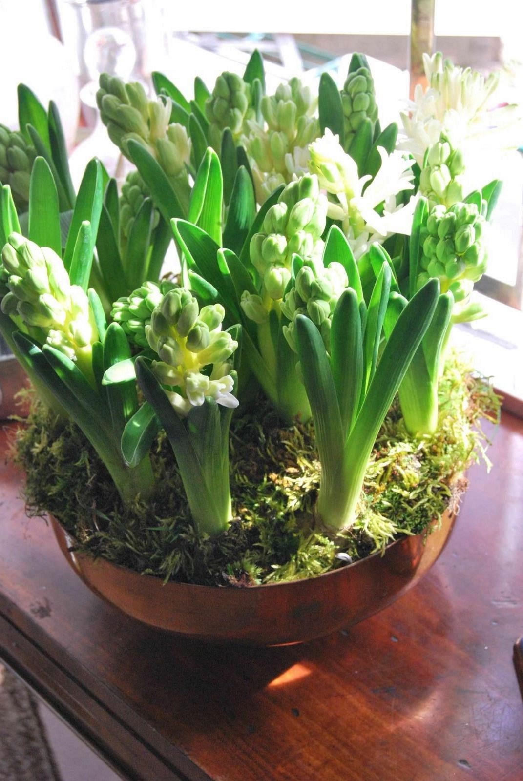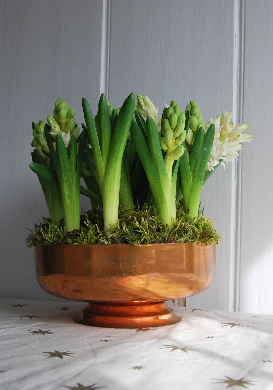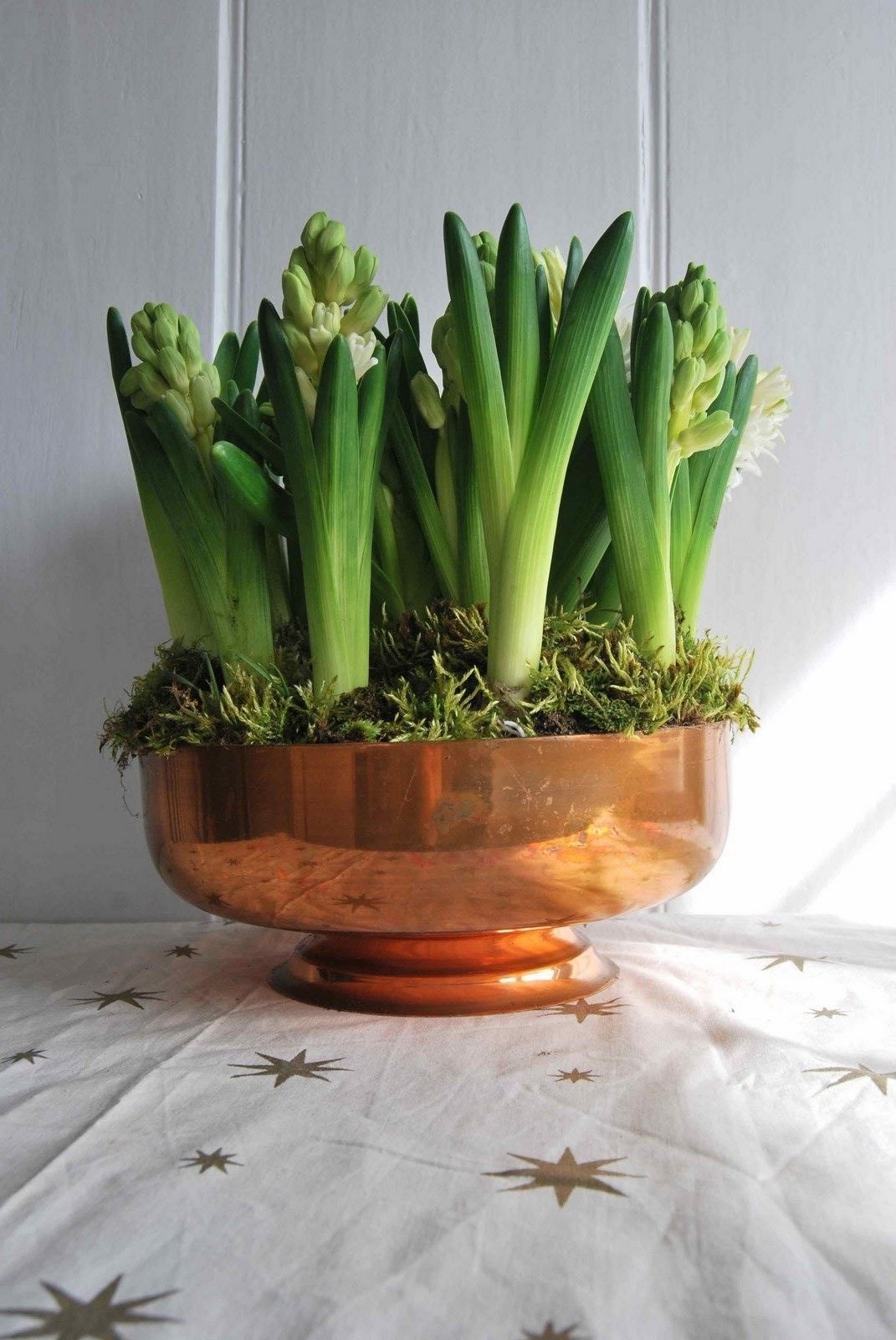 Mid Century Large Copper Footed Bowl With White Hyacinths