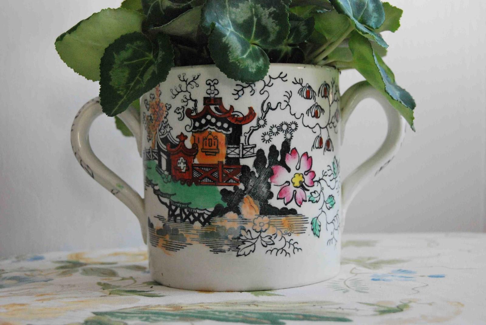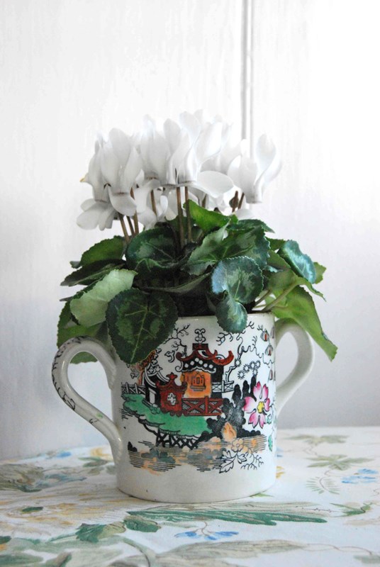 A antique Victorian ironstone loving cup planted with white cyclamen. Manufactured by E, M & Co, a small Staffordshire pottery with a chinoiserie pattern of pagoda patterns and cherry blossom trees manufactured between the 1860's and 1880's in the Potteries. Hairline crack on the right hand handle (shown) which does not detract from presentation.