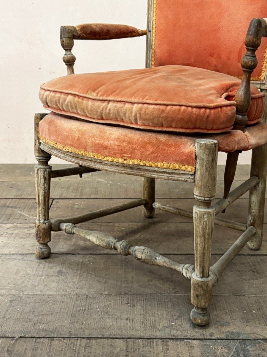 A rare little carver armchair c.1750 retaining (later) coral velvet upholstery, which, while not super clean, is clean enough to live with.