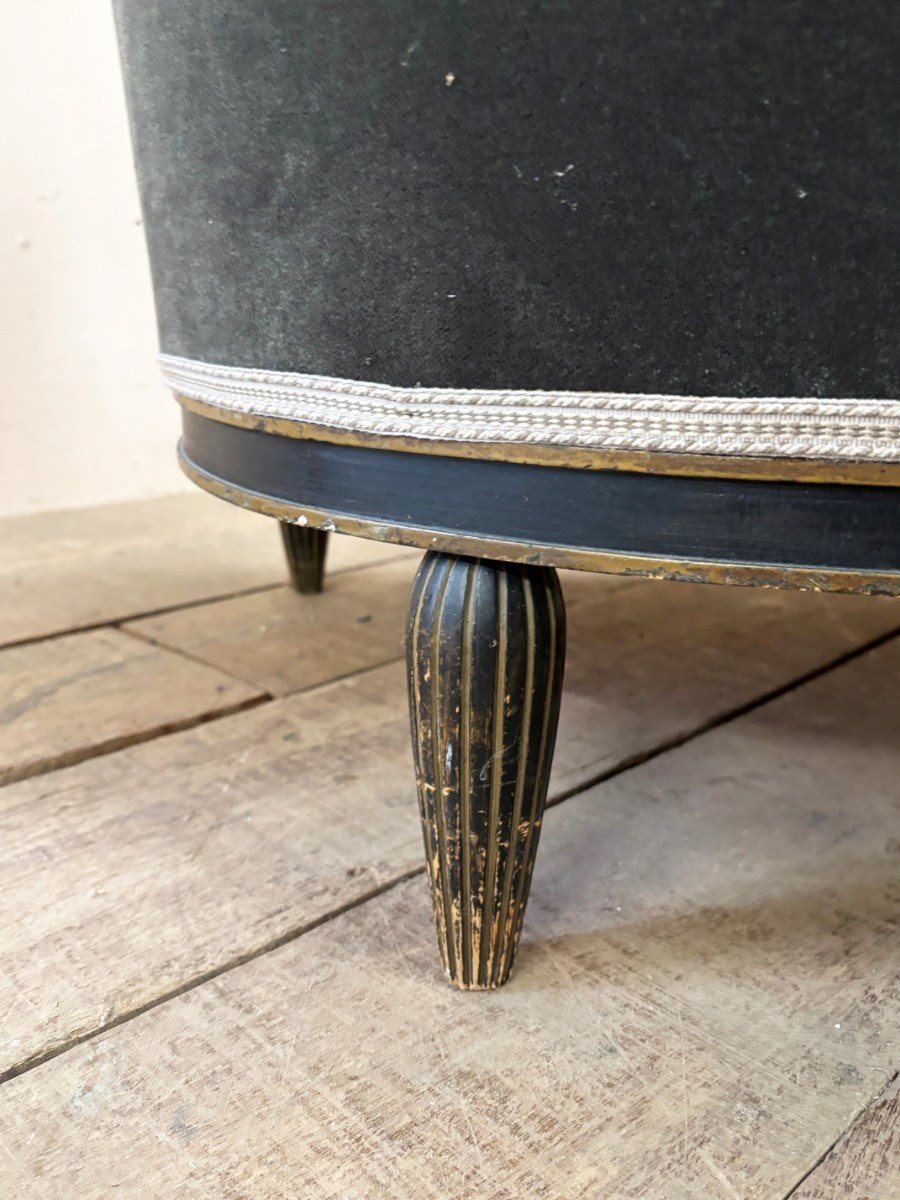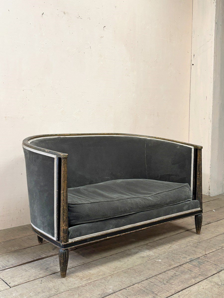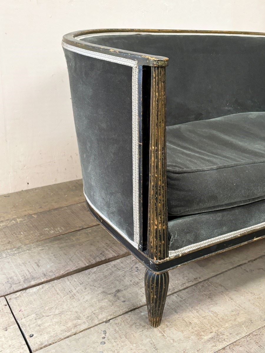 Good quality and very clean 1940’s settee with tapered fluted posts and legs, recently upholstered in a teal grey velvet.