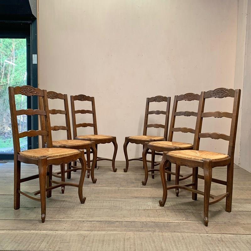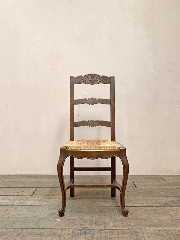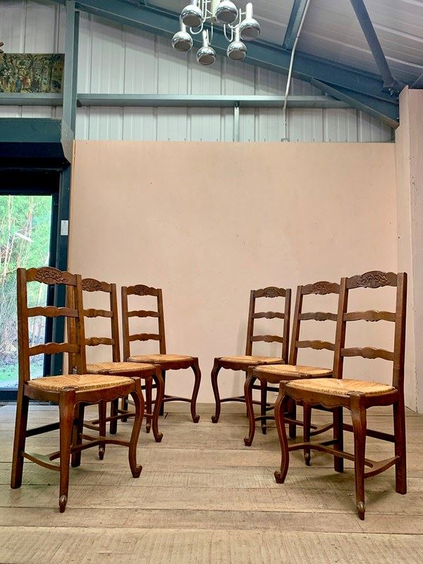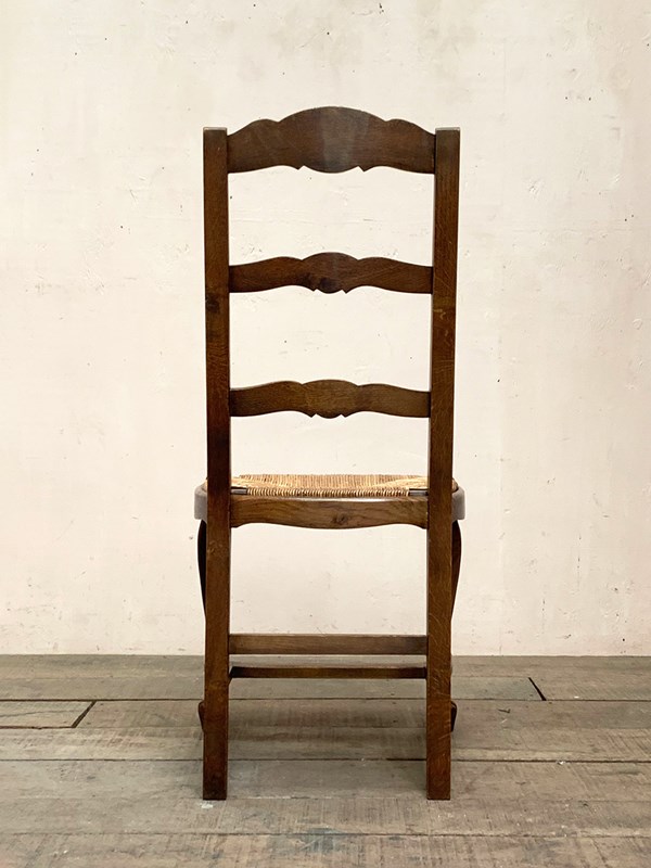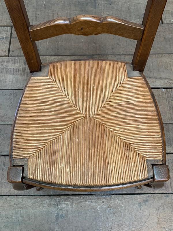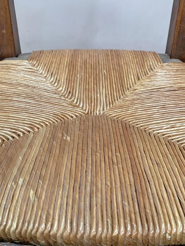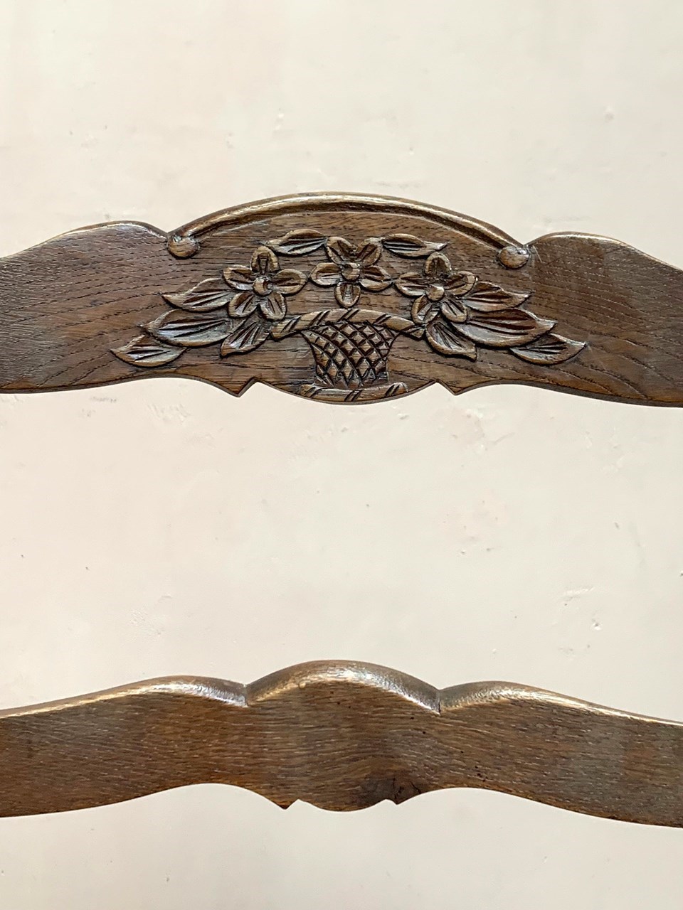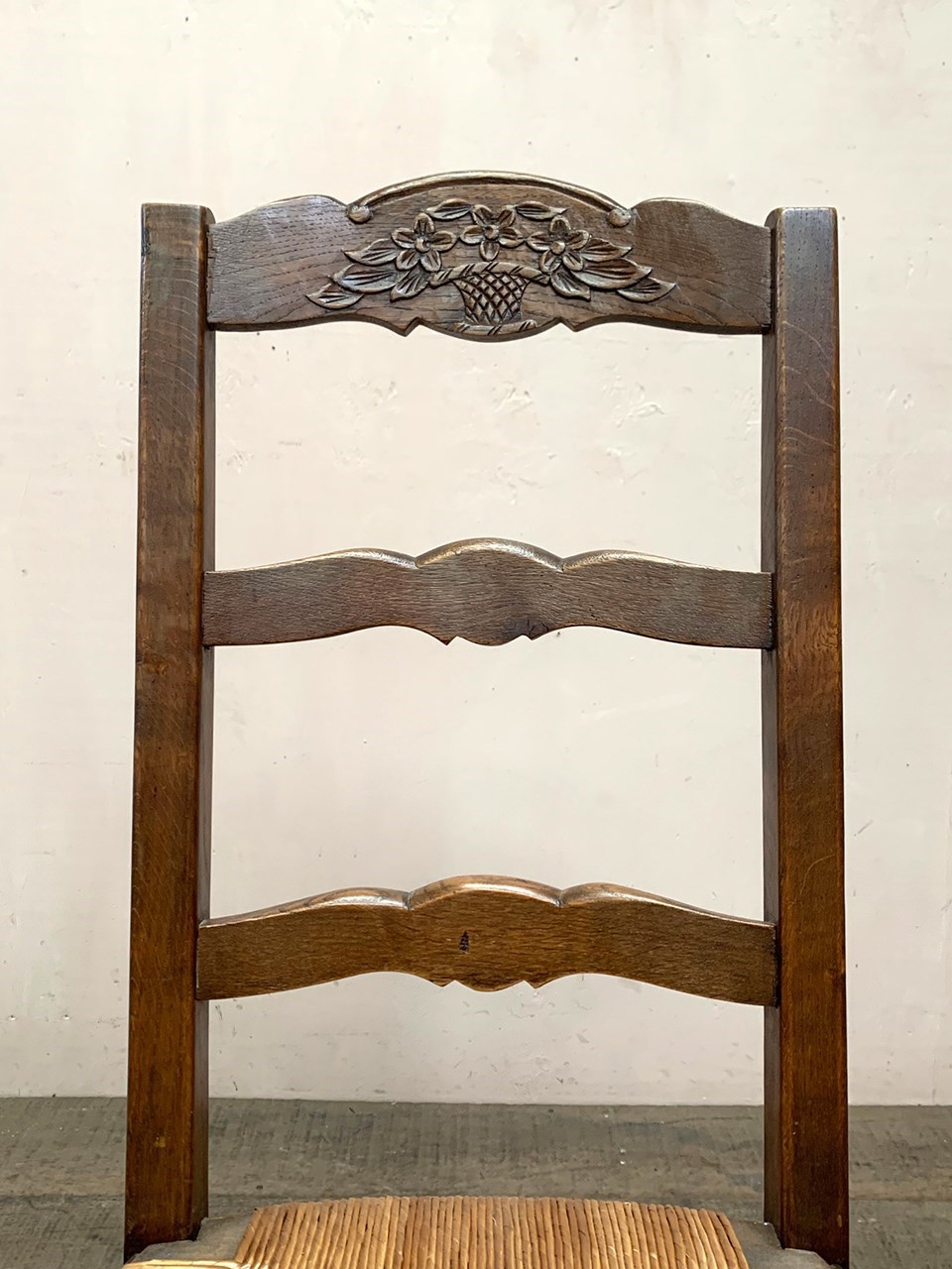 Made from oak, they have lovely carved floral motifs to the top of the back rests, and rush seats.