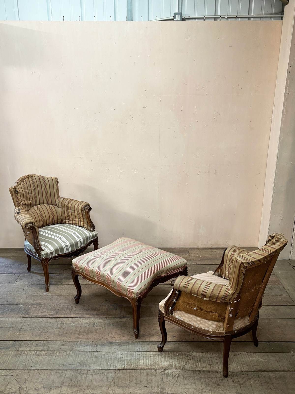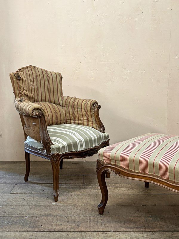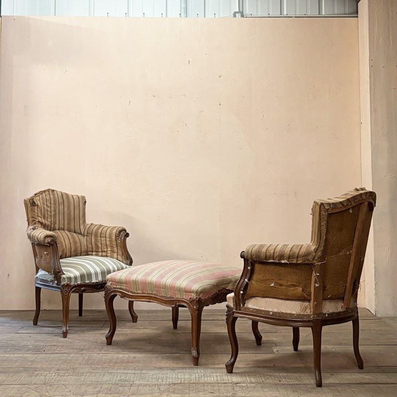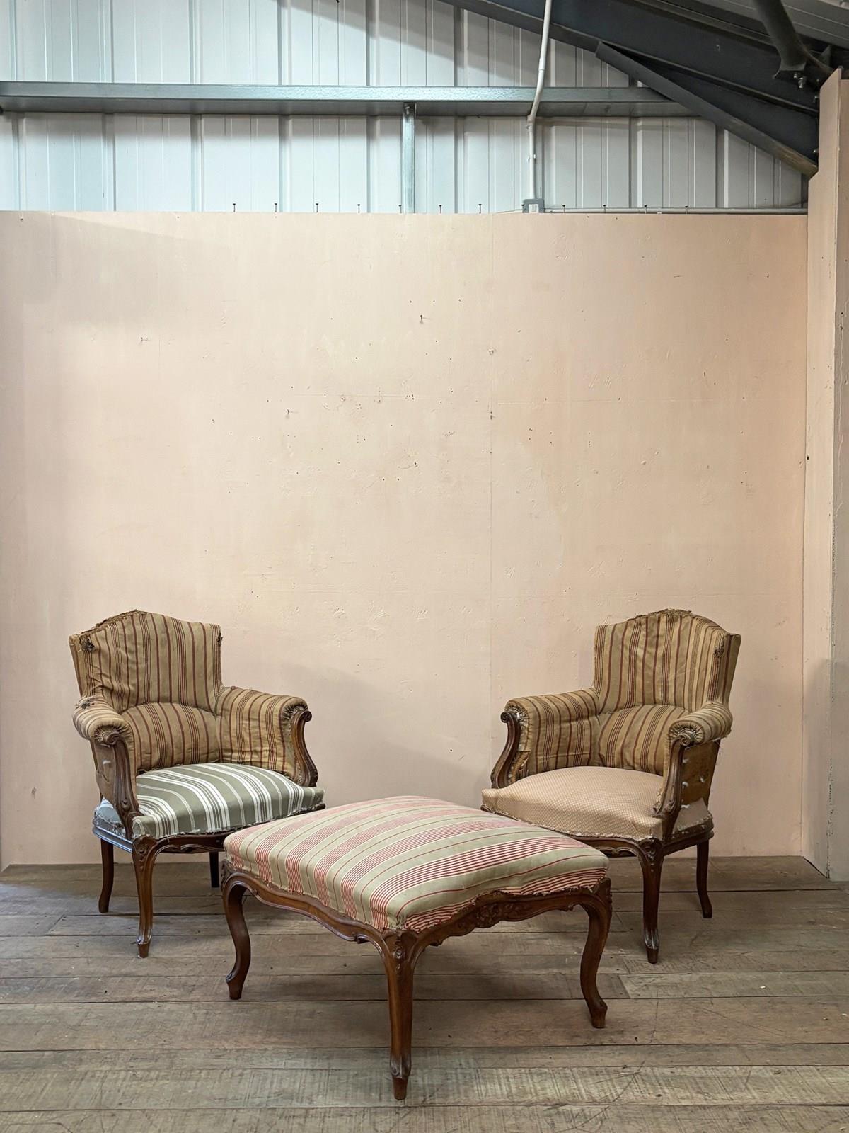 A 'duchesse brisée' or a pair of armchairs and stool. This set are in the Louis XV style and from the mid 19th century, built in solid walnut. The frames are in excellent structural condition, with no woodworm.