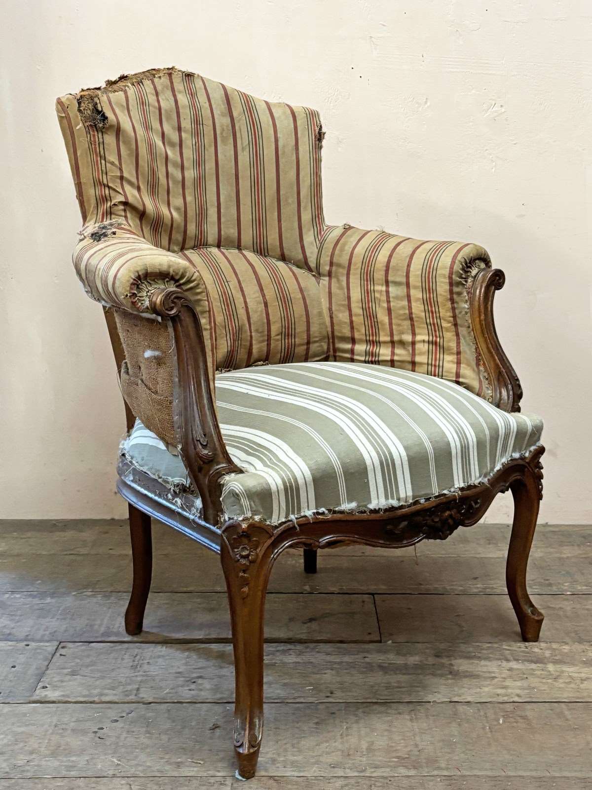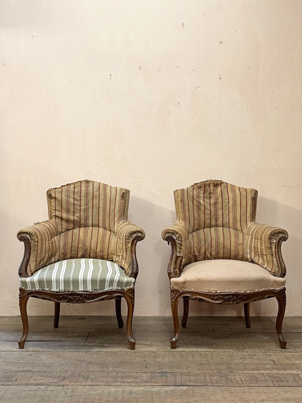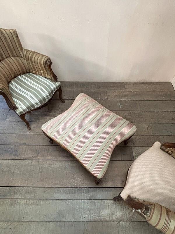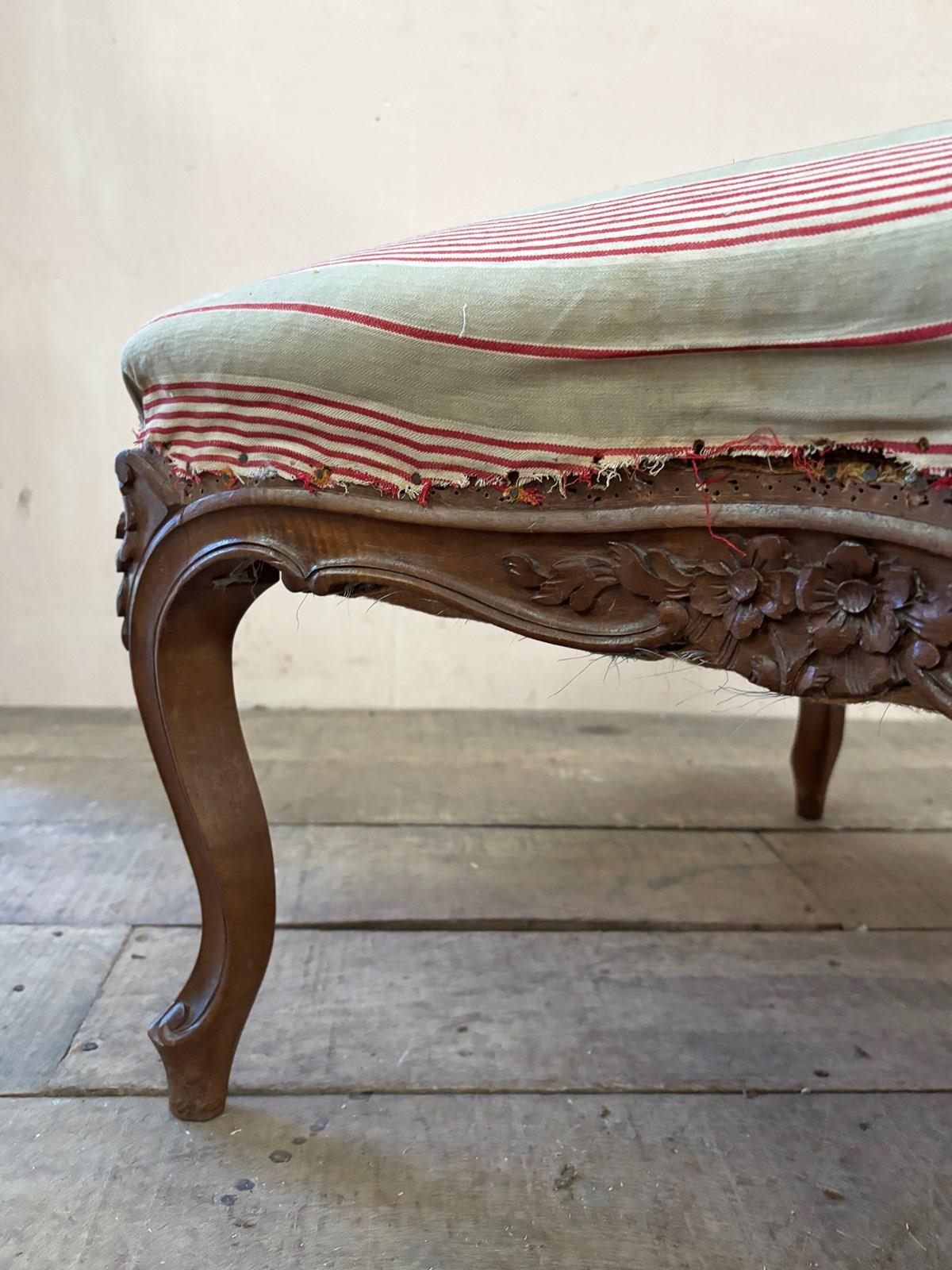 A 'duchesse brisée' or a pair of armchairs and stool. This set are in the Louis XV style and from the mid 19th century, built in solid walnut. The frames are in excellent structural condition, with no woodworm.