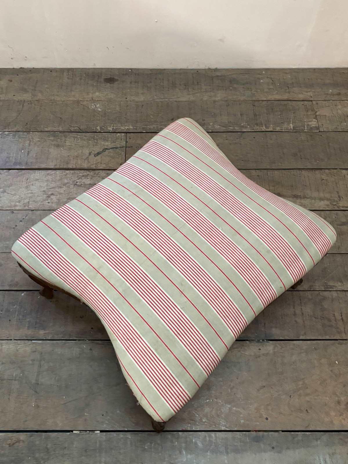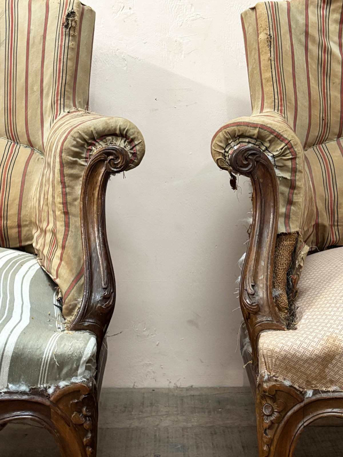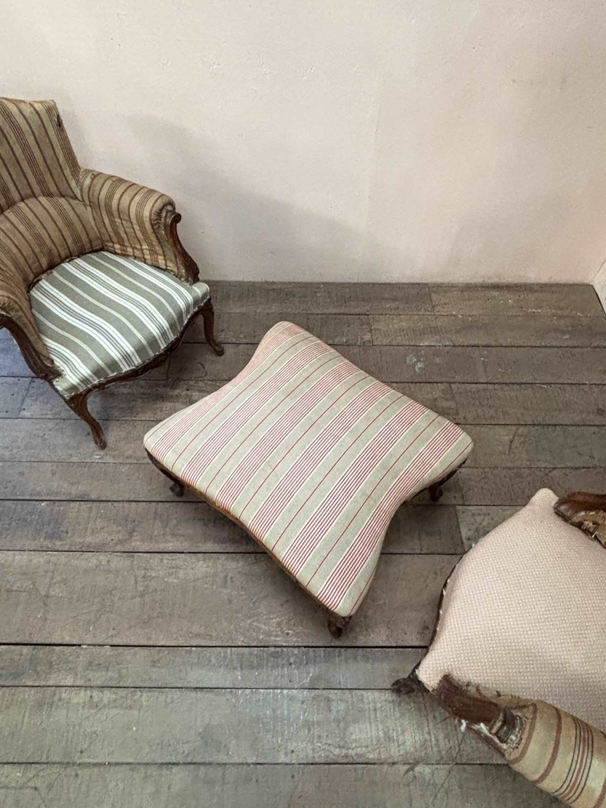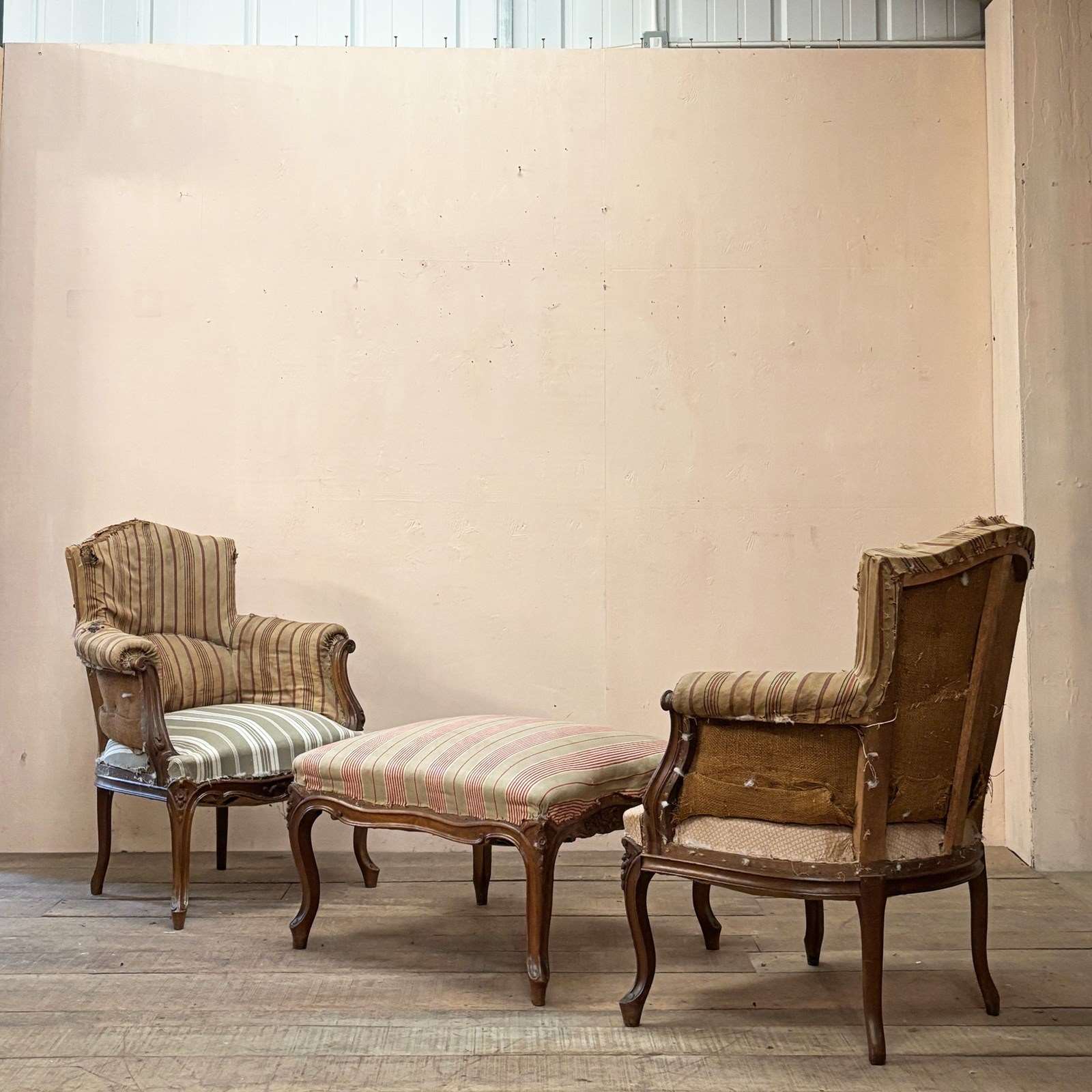 Chairs retain original striped tickings and have an elevated seating height.