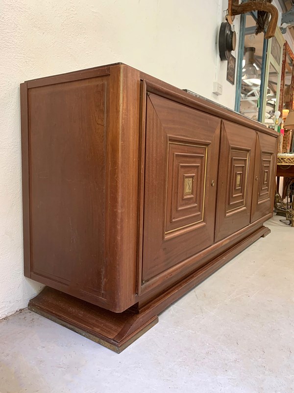 A striking, and large scale, 1940s mahogany sideboard, in the manner of furniture designer, Maxime Old.