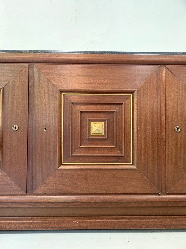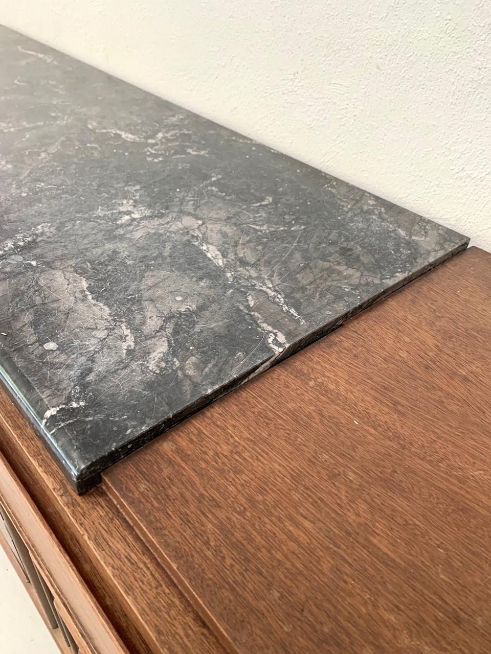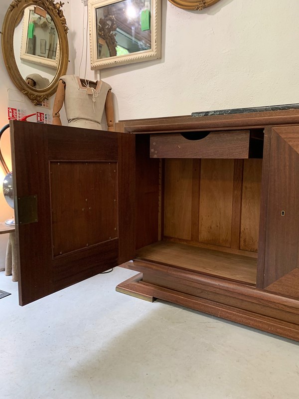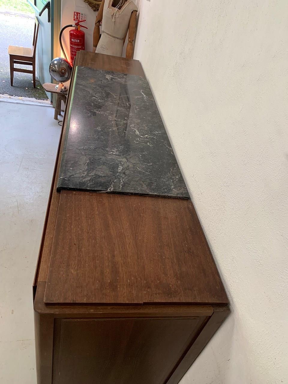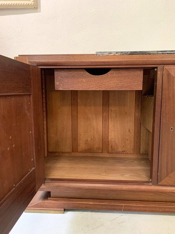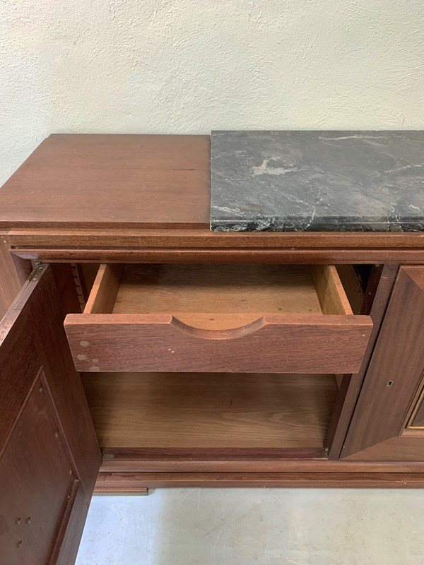 It has delicate brass trims on the doors, and a substantial grey marble top in the centre, flanked by wood at either side. Internally are 3 large storage spaces and a top drawer in each.