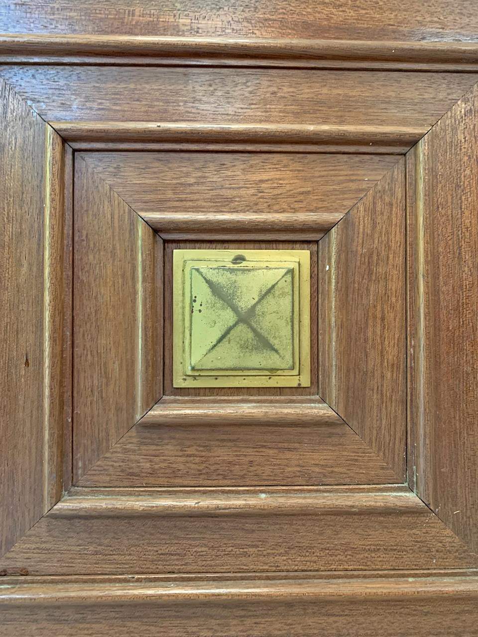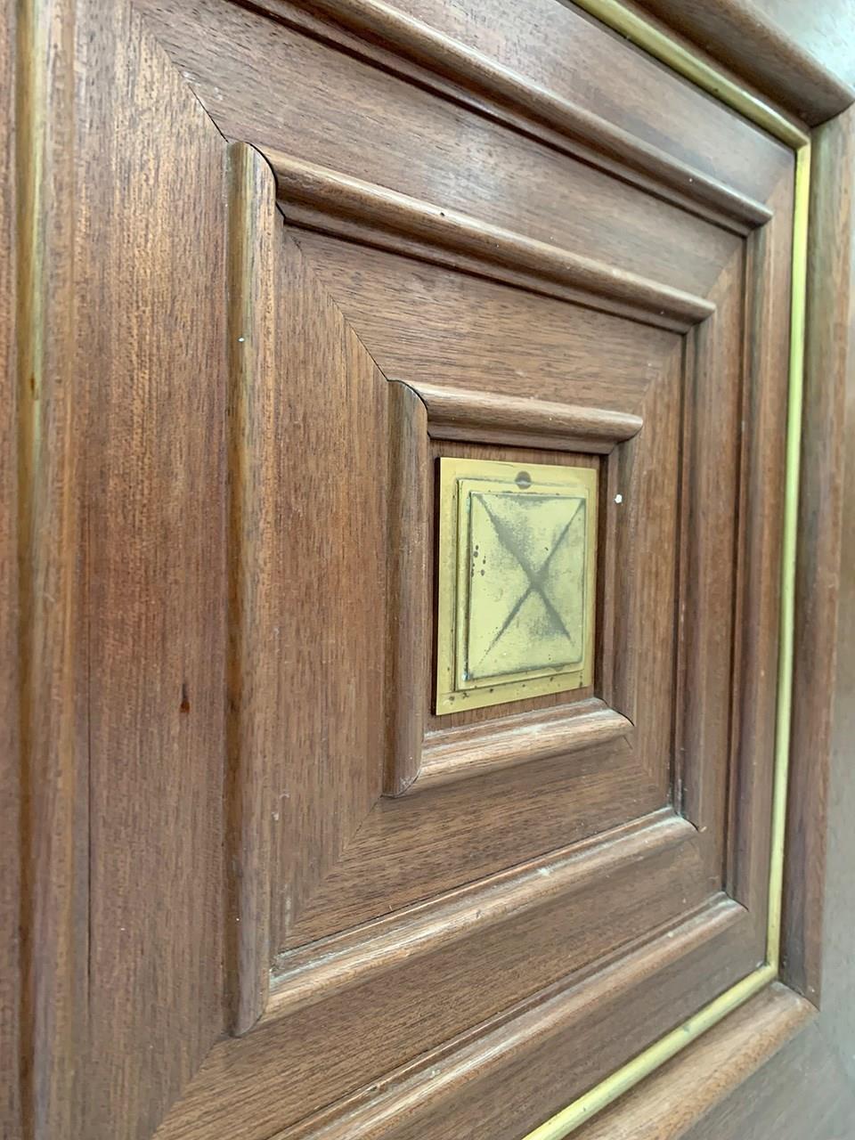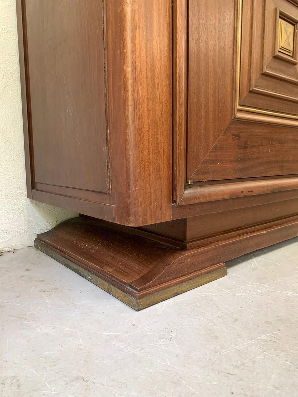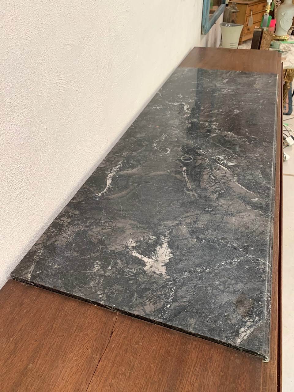 It has delicate brass trims on the doors, and a substantial grey marble top in the centre, flanked by wood at either side. Internally are 3 large storage spaces and a top drawer in each.
