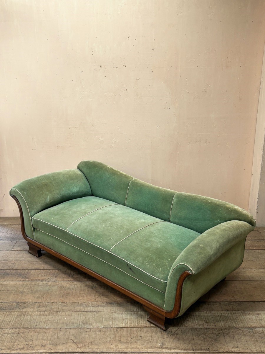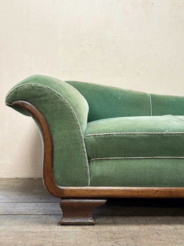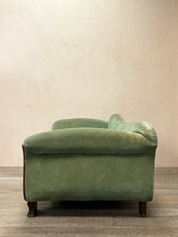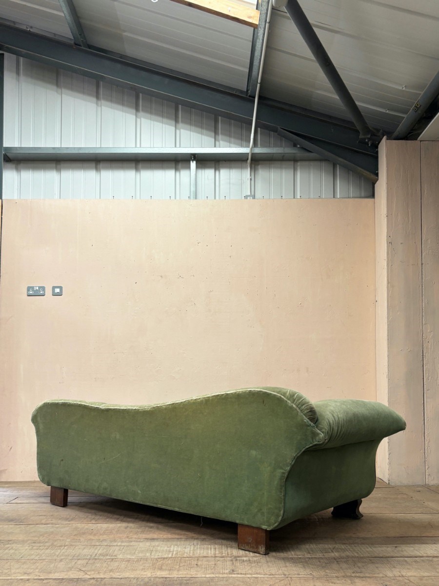 Traditionally upholstered with fully sprung seat and arms and retaining its original green chair velvet with rope edging.
