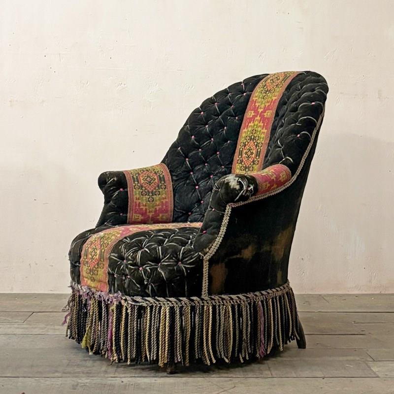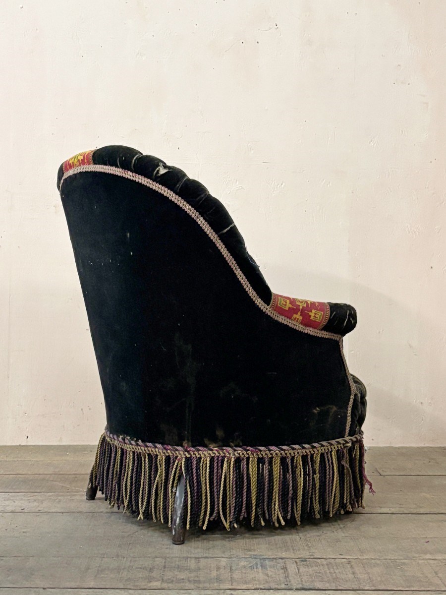 Wonderful and hard to find 1860’s armchair retaining its original black velvet, needlepoint panels, handmade buttons and fringing. In remarkably good condition.