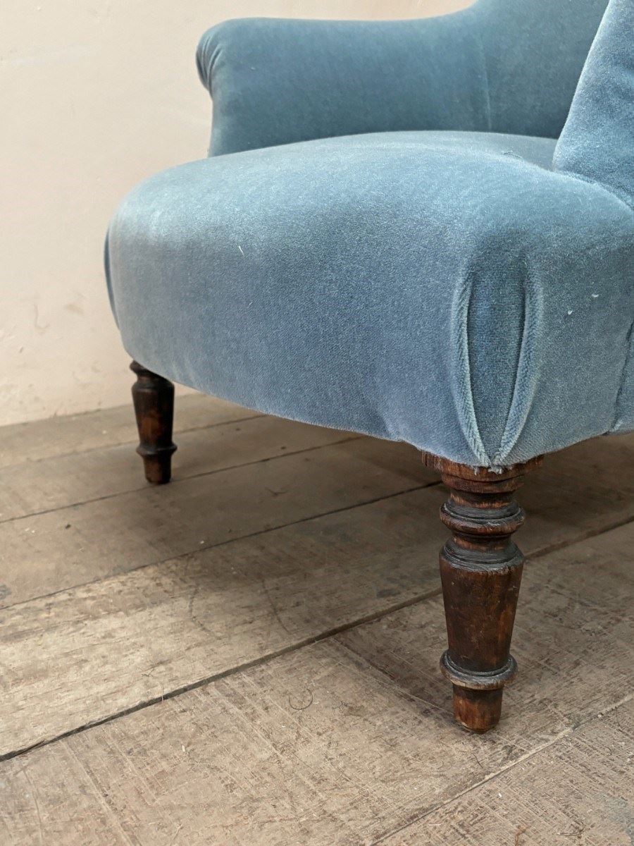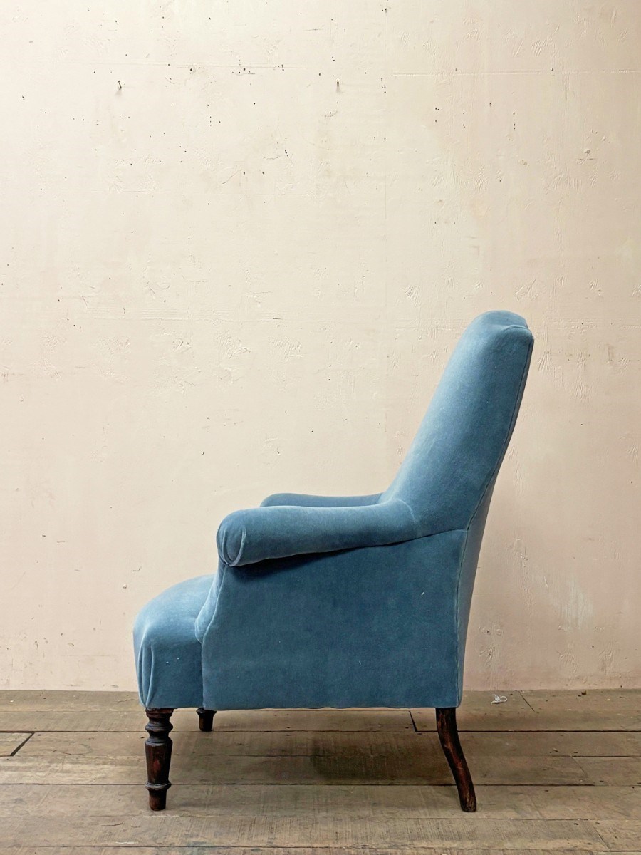Mid 19th century armchair restored and re-upholstered in good quality 'French Blue’ mohair velvet.