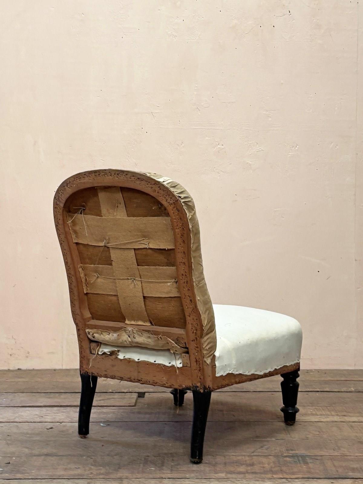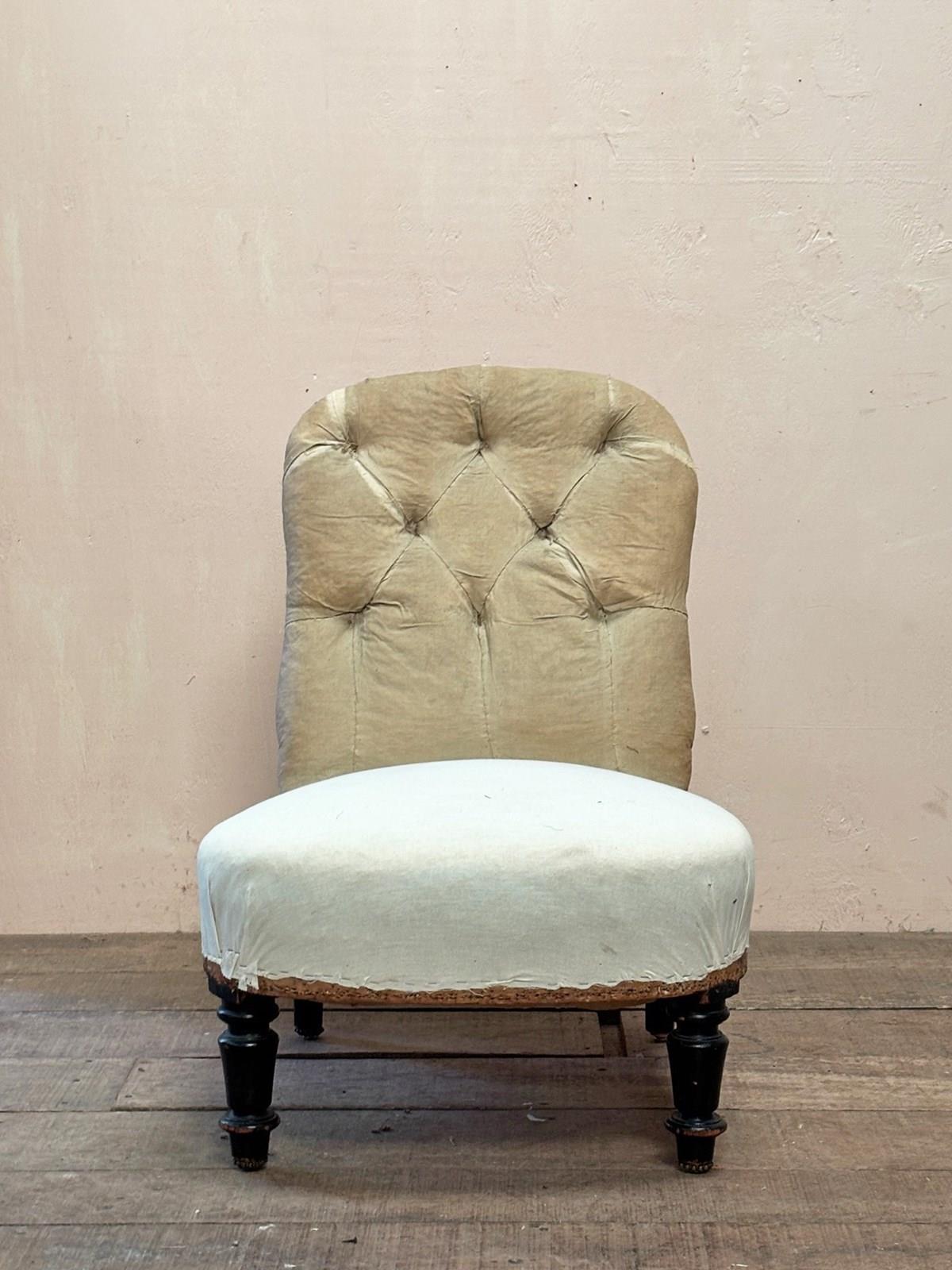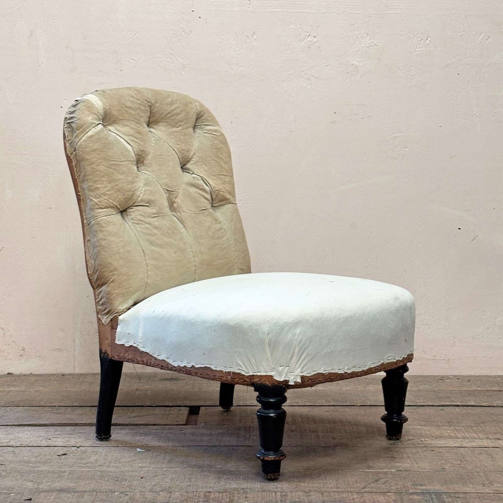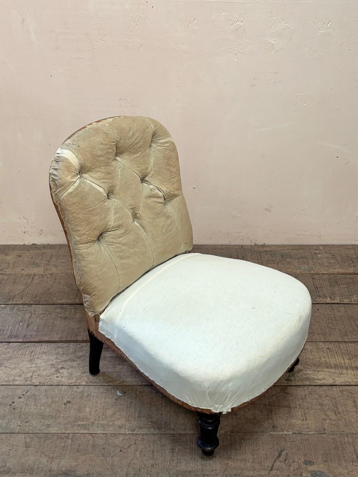 Very cute and shapely, (and hard to find) 19th century deep button back slipper chair on turned ebonised legs. If you wish to re-upholster this daybed, 2m of fabric will be required.