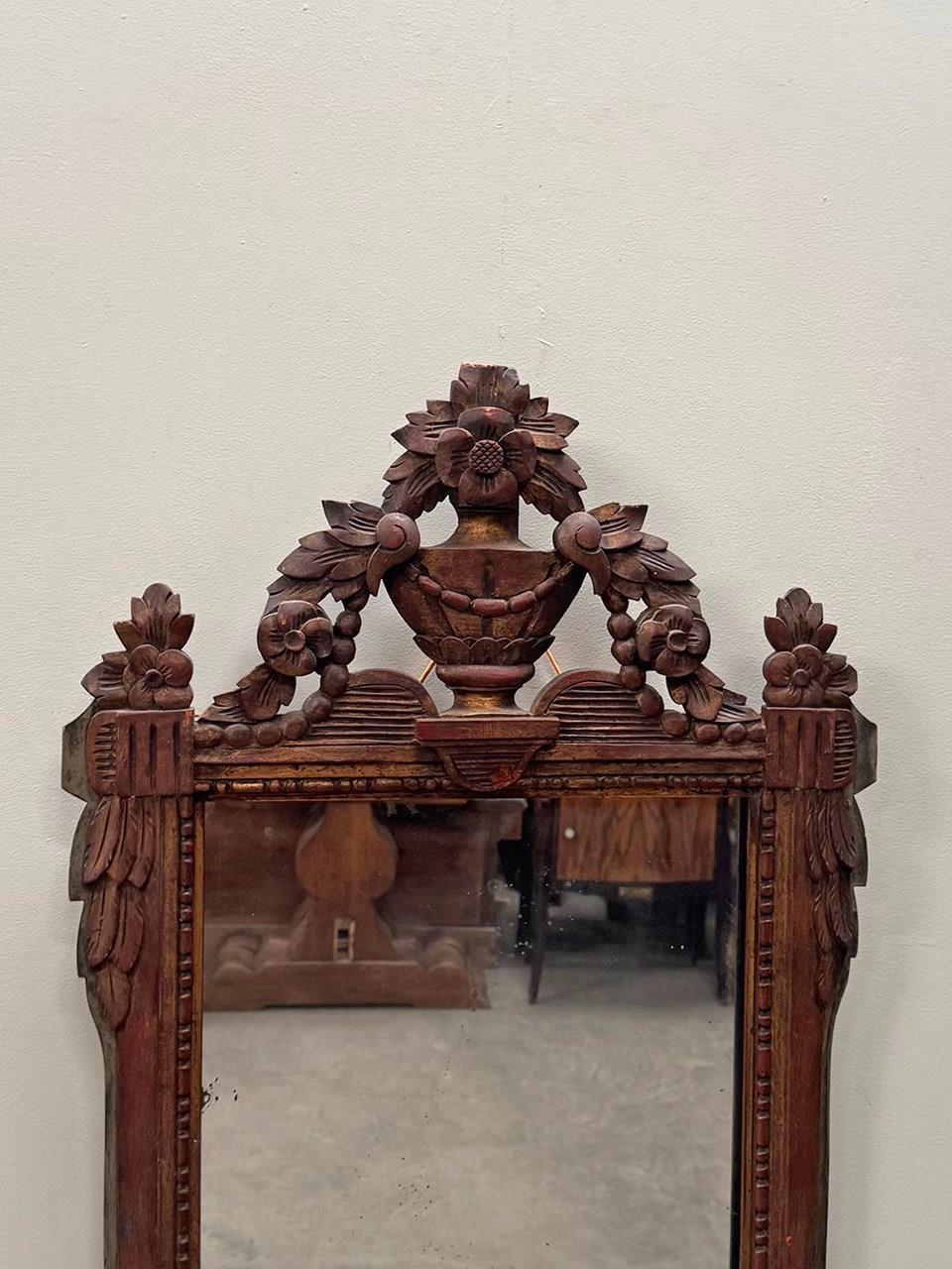 Lovely proportioned carved wood mirror, topped with an ornate urn and floral themed crest.