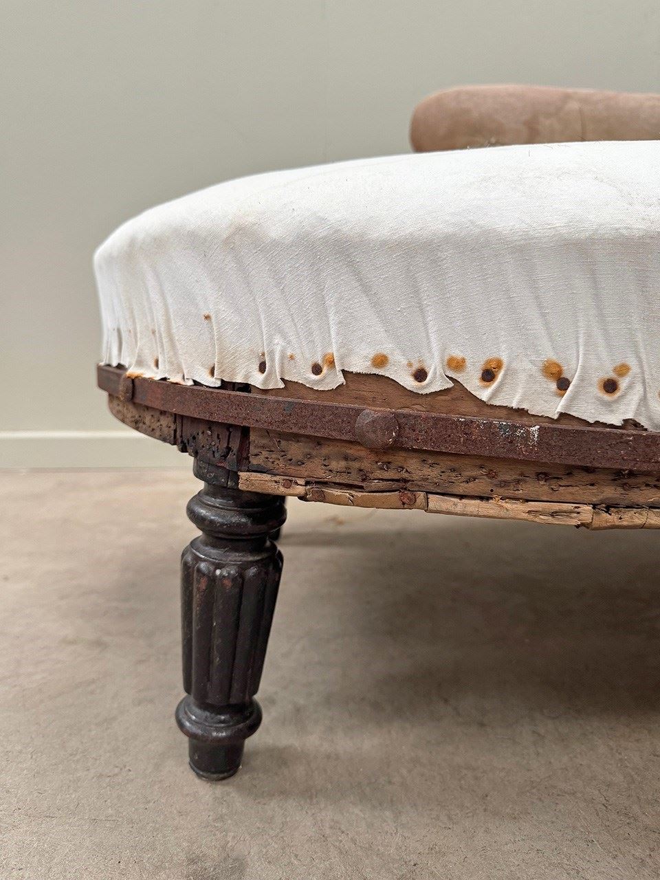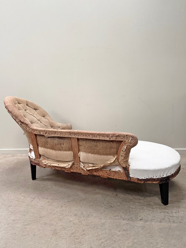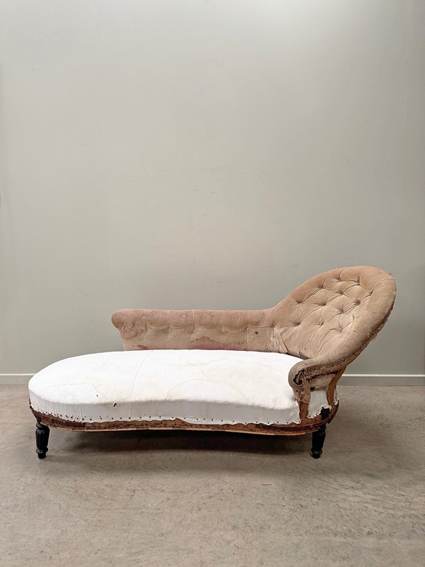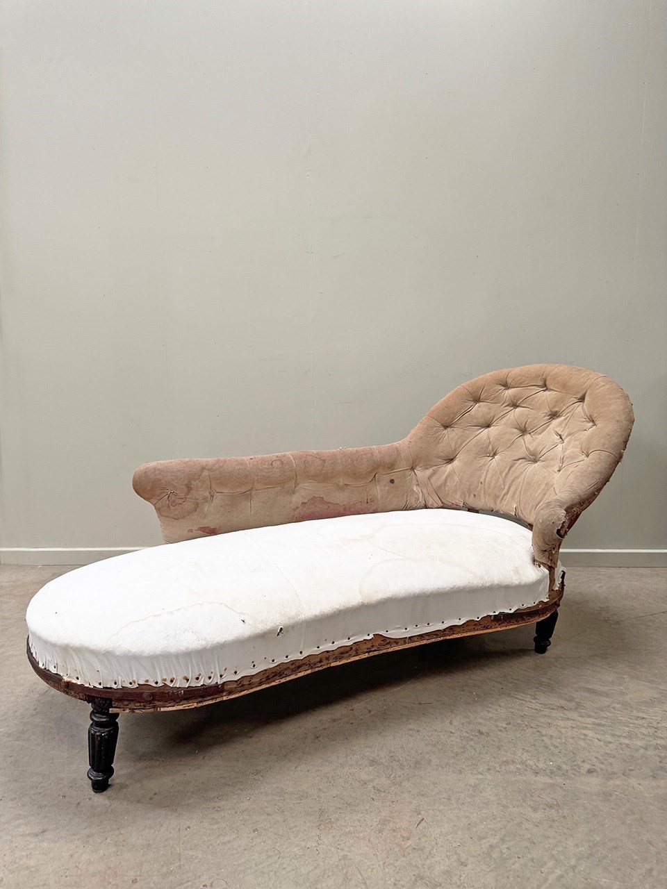 Mid 1800s deep buttoned chaise longue with reeded ebonised legs to the front, and simple legs to the back.
