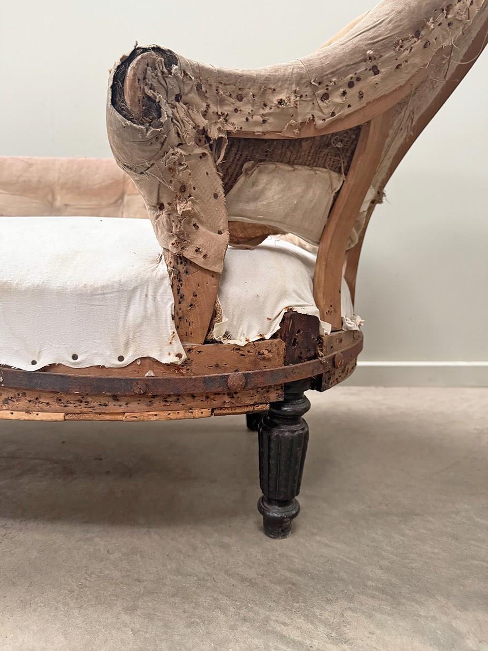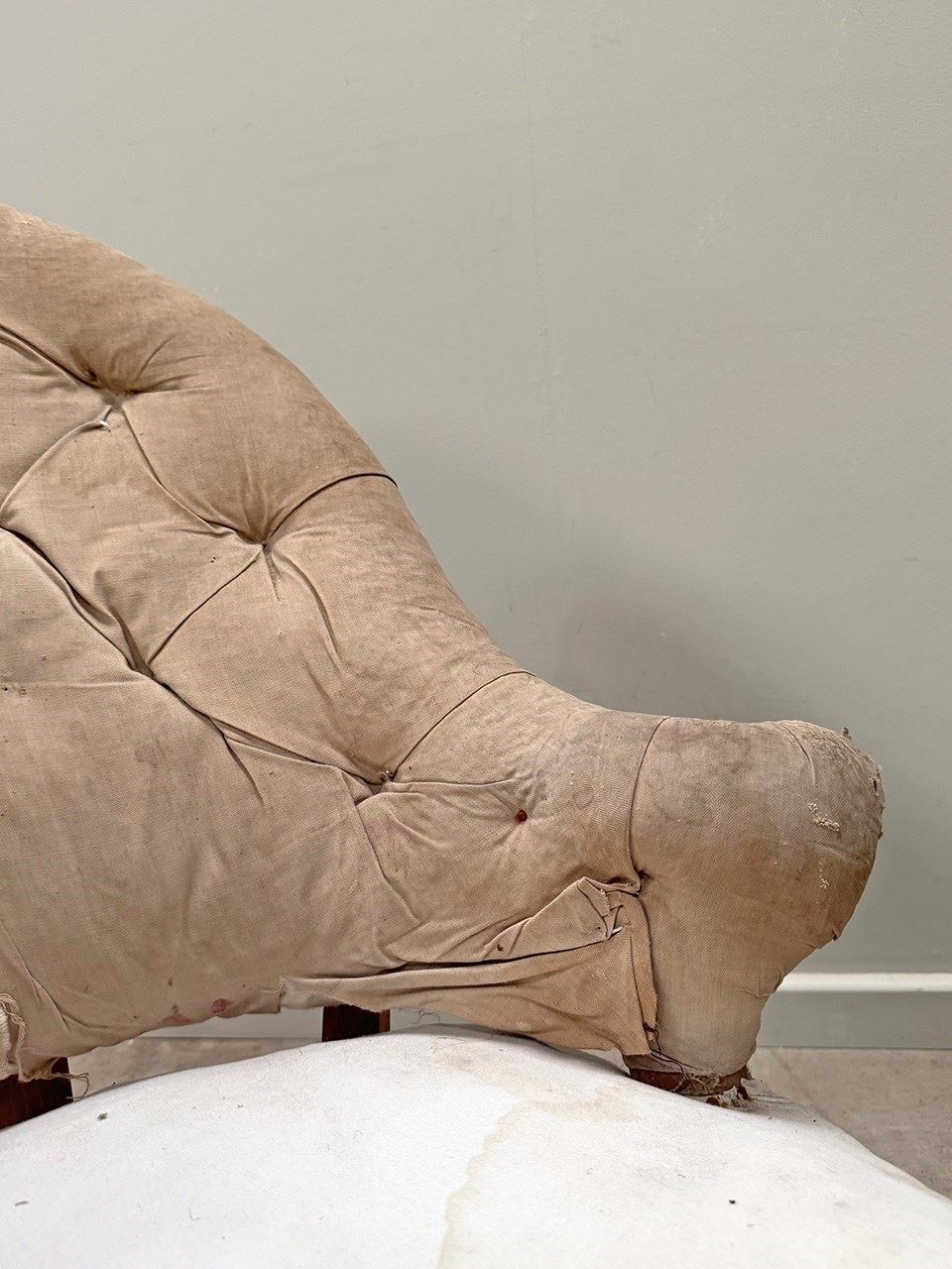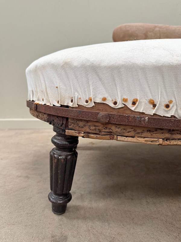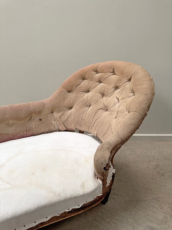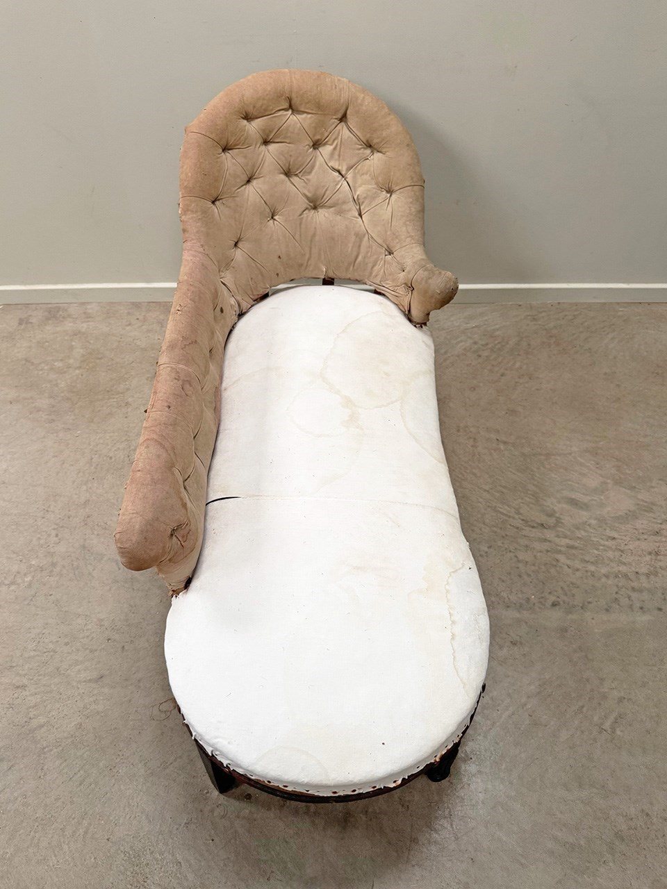 Mid 1800s deep buttoned chaise longue with reeded ebonised legs to the front, and simple legs to the back.