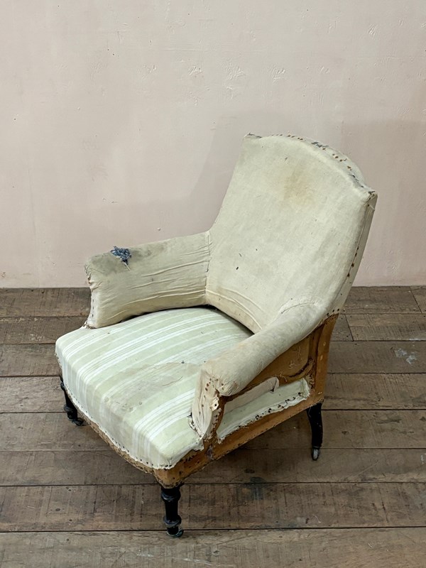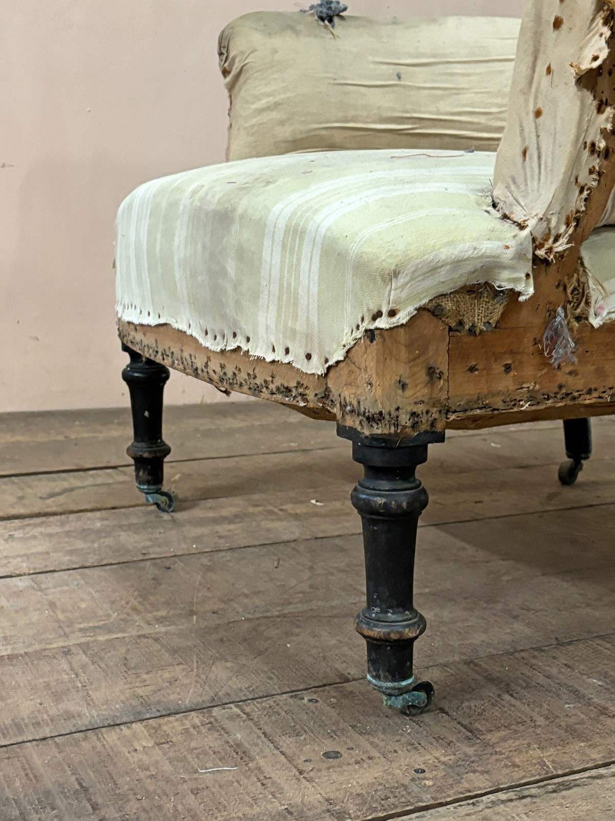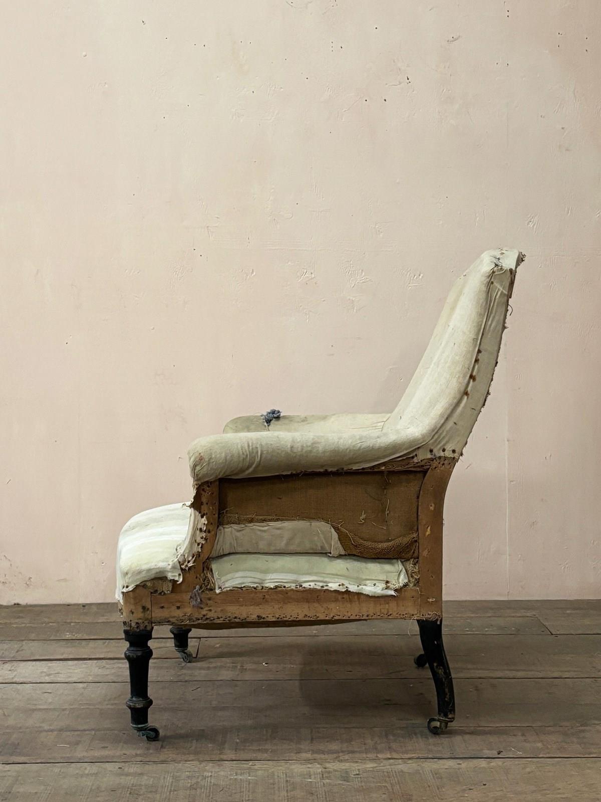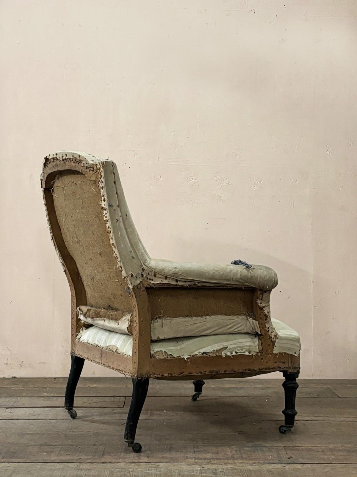 Comfortable and elegant mid 19th century chapeau de gendarme armchair on turned ebonised legs and retaining its original castors.