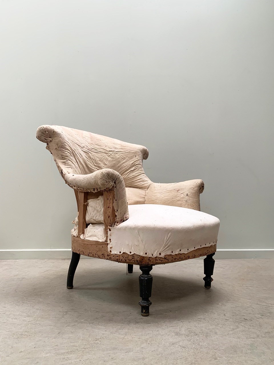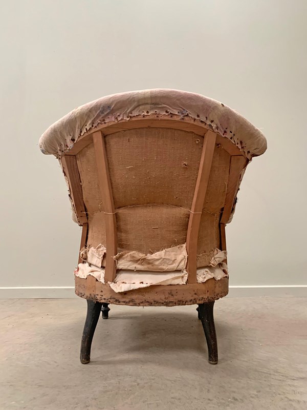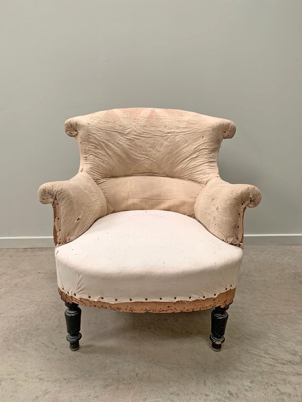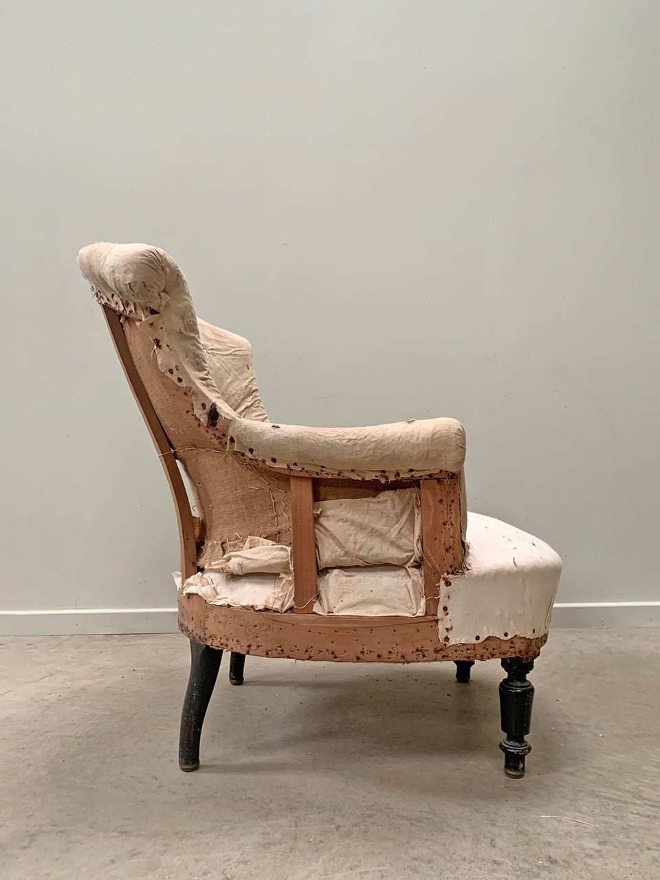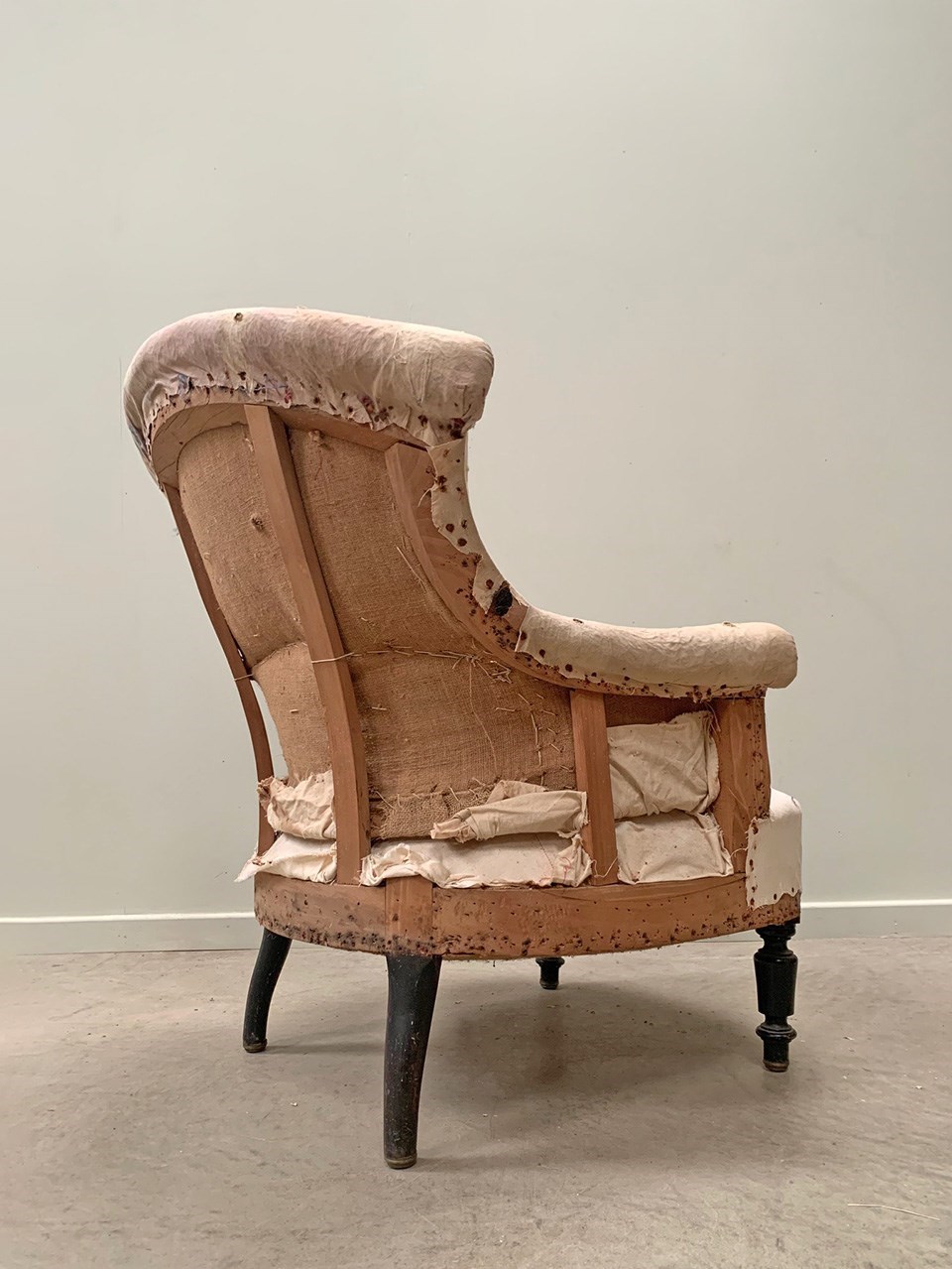 Mid 19th century armchair raised on ebonised legs with a chapeau de gendarme back rest. The style of the back of the armchair is referred to as 'policeman's hat'.